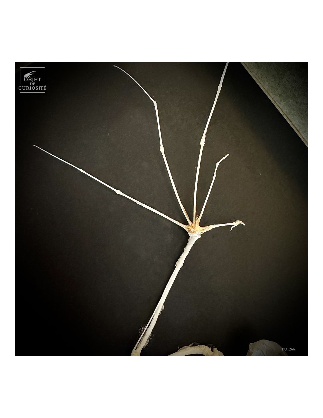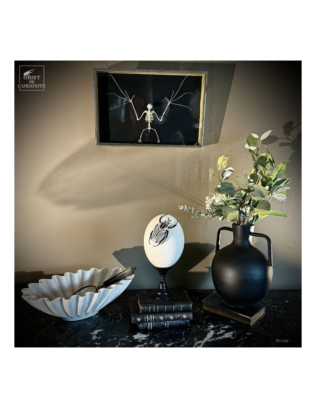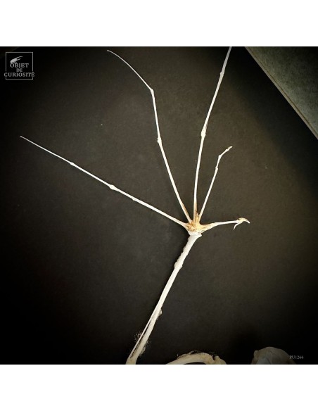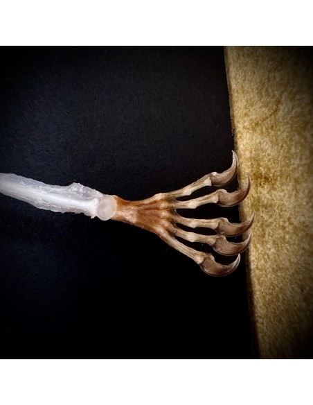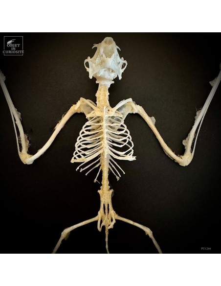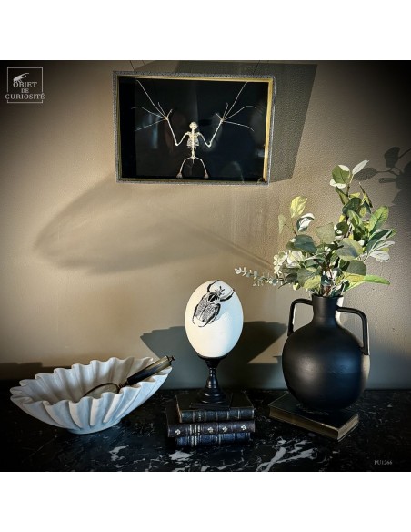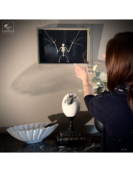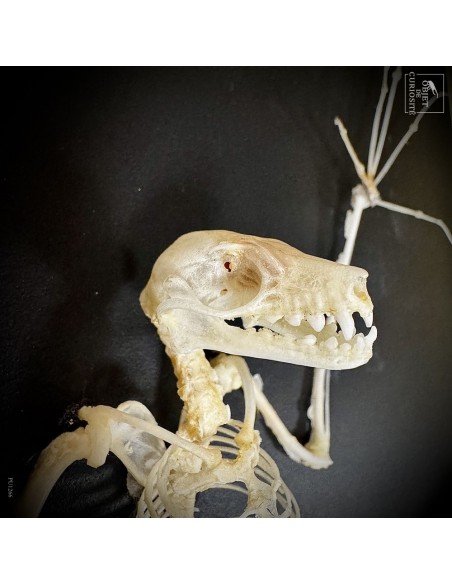 Delicate and precise in the same time but also... a little scary: the presentation of a skeleton of a small eonyctere, an Indonesian bat. This large fox-headed bat is nectarivorous. It therefore plays an important role in the pollination of banana, Durian and other trees in the Indo-Pacific area. Despite her large teeth, she is vegetarian. She spends her days in caves sometimes in groups of several thousand individuals. A display in a grey leazard pattern box, made in France..