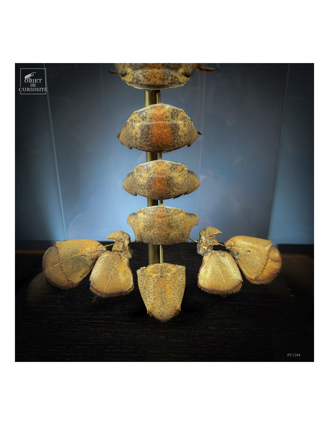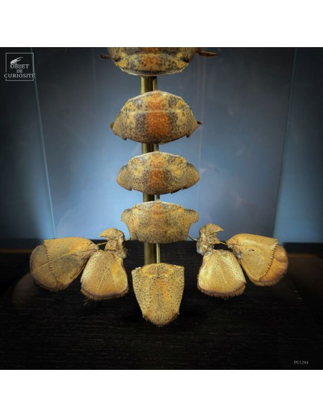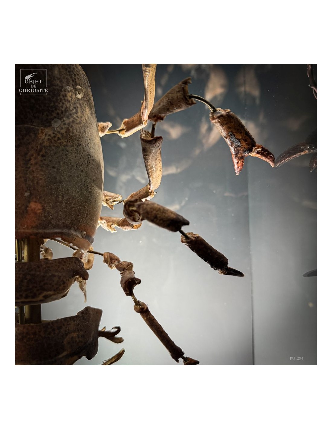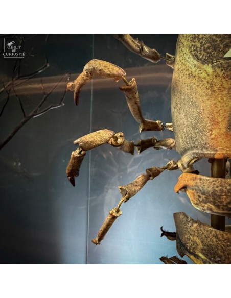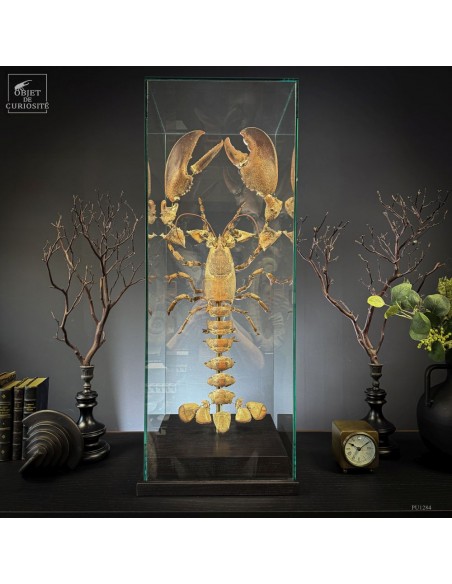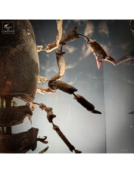 This specimen of HOMARUS GAMMARUS — the European lobster — has been mounted using the “exploded view” technique developed in the 19th century by Léon Jean Baptiste de Belloy de Beauchesne (1817–1859), a pioneer of comparative anatomy. Each part of the exoskeleton has been carefully detached, then spaced out using fine brass rods, revealing the internal articulation system of the animal.