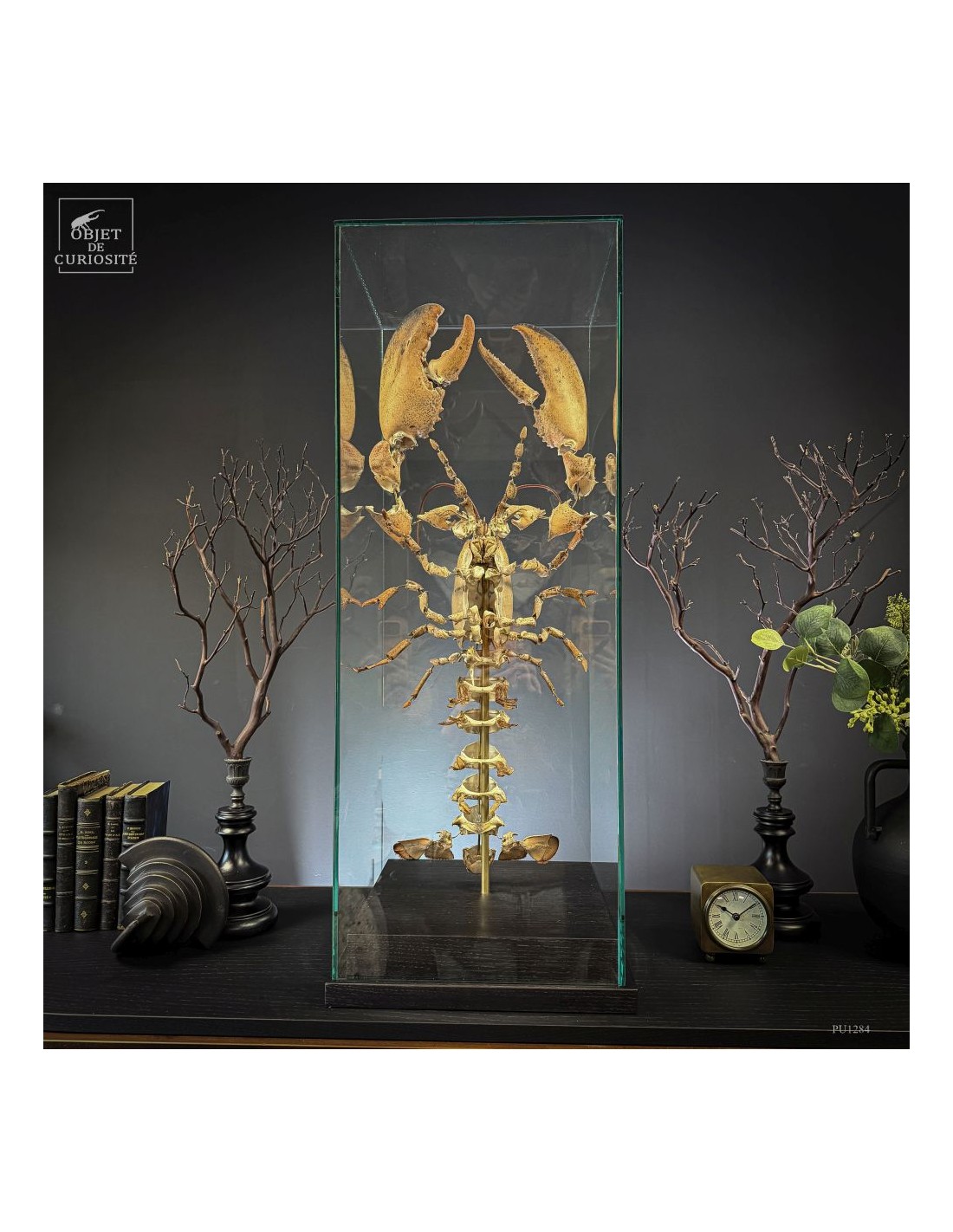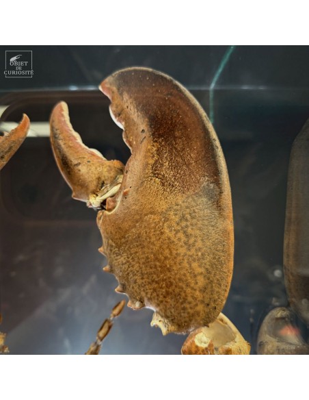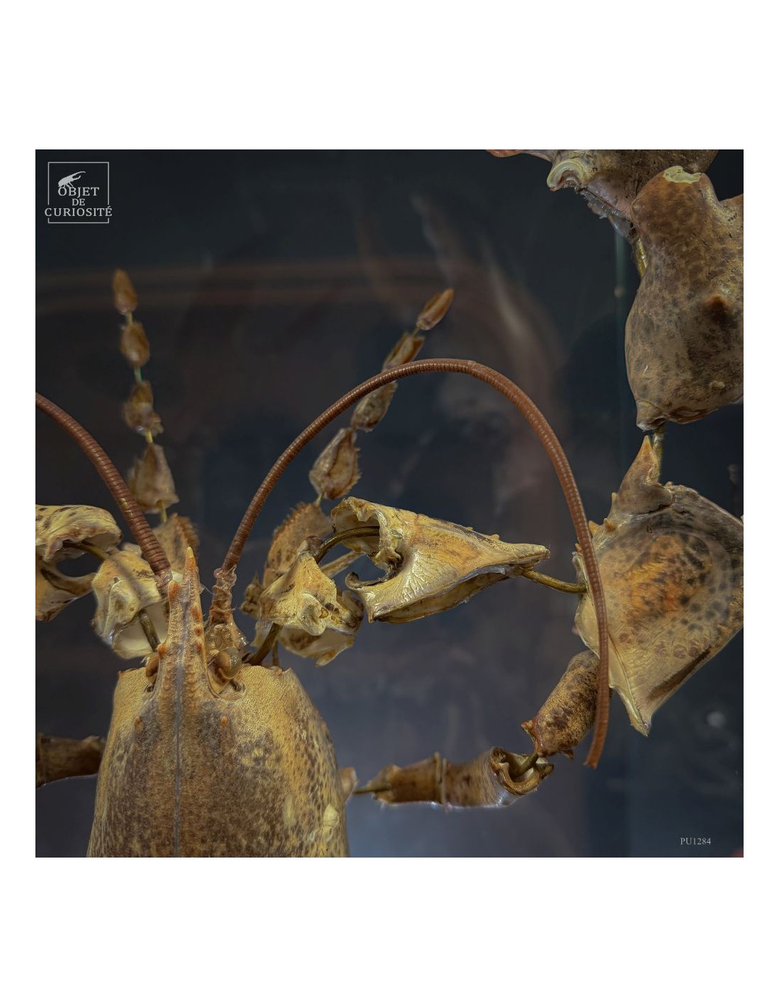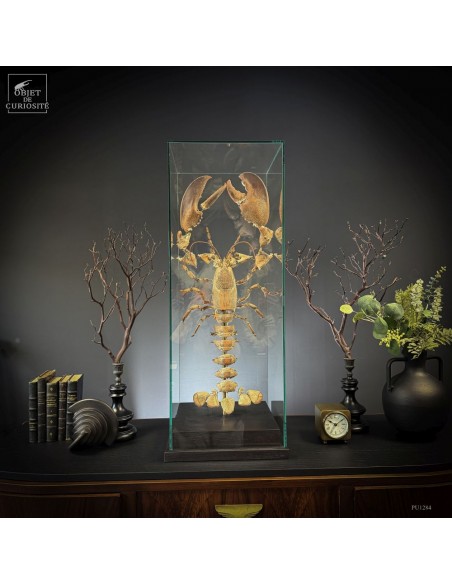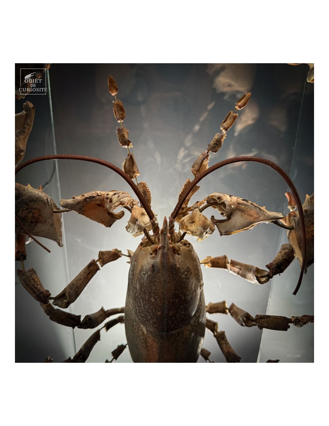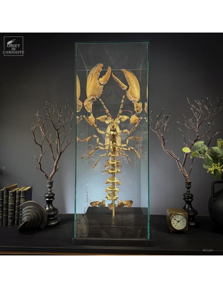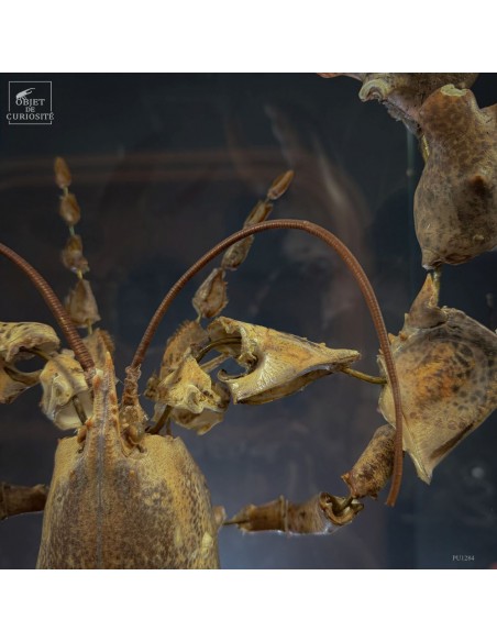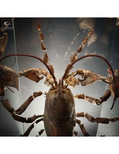 The result is striking: the lobster appears larger than life, as if unfolded in space, somewhere between scientific display and sculptural object. Its segmented tail, asymmetrical claws and articulated limbs can all be studied with unusual clarity.
