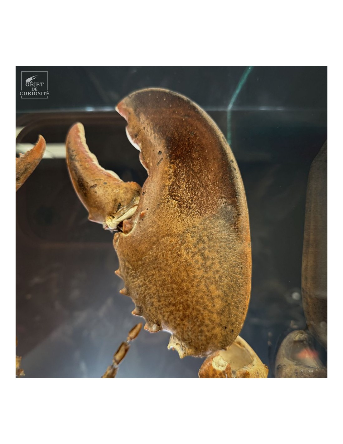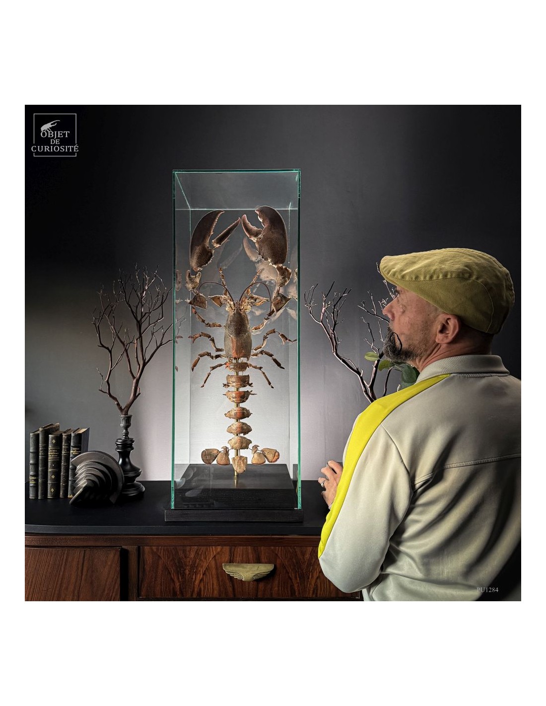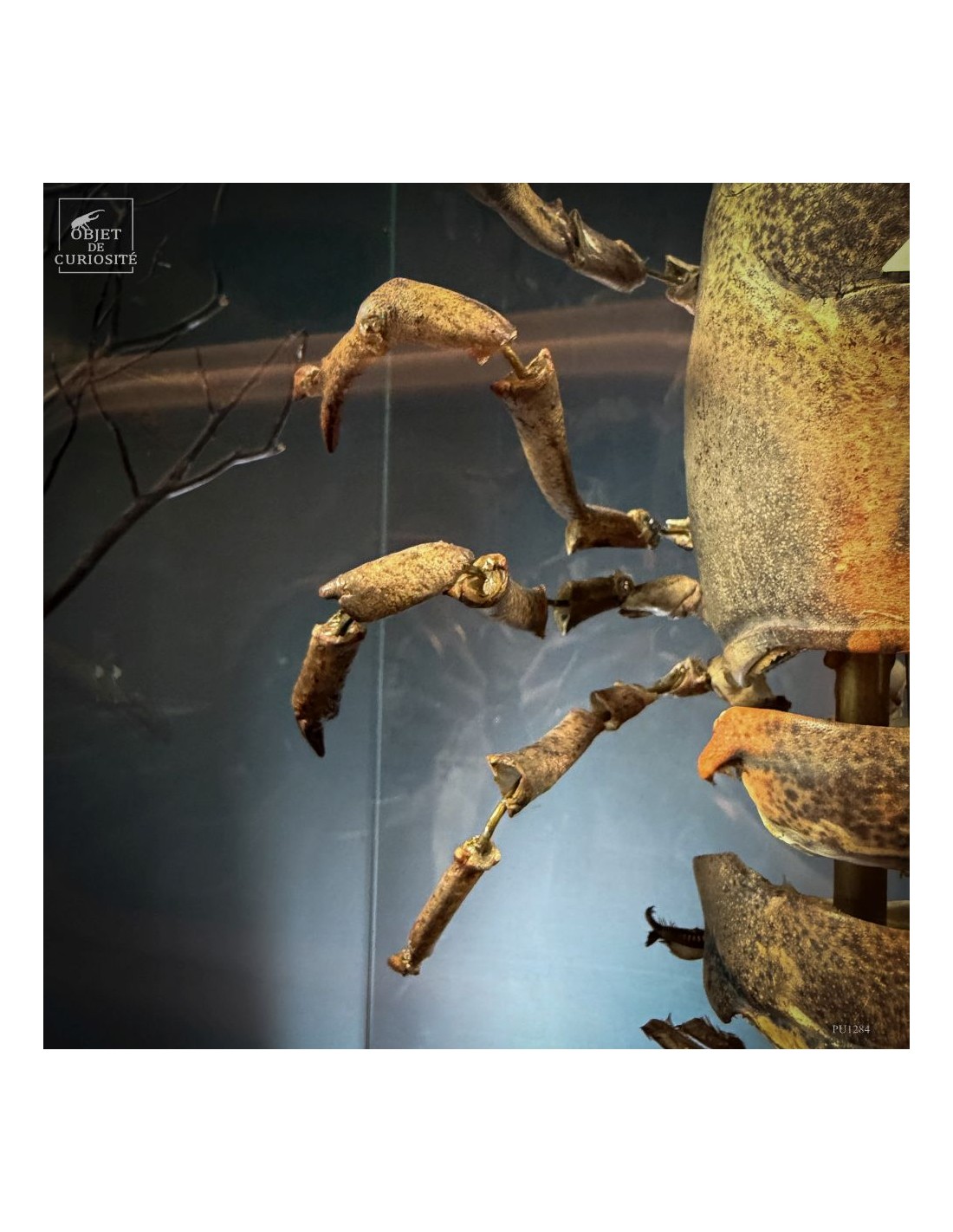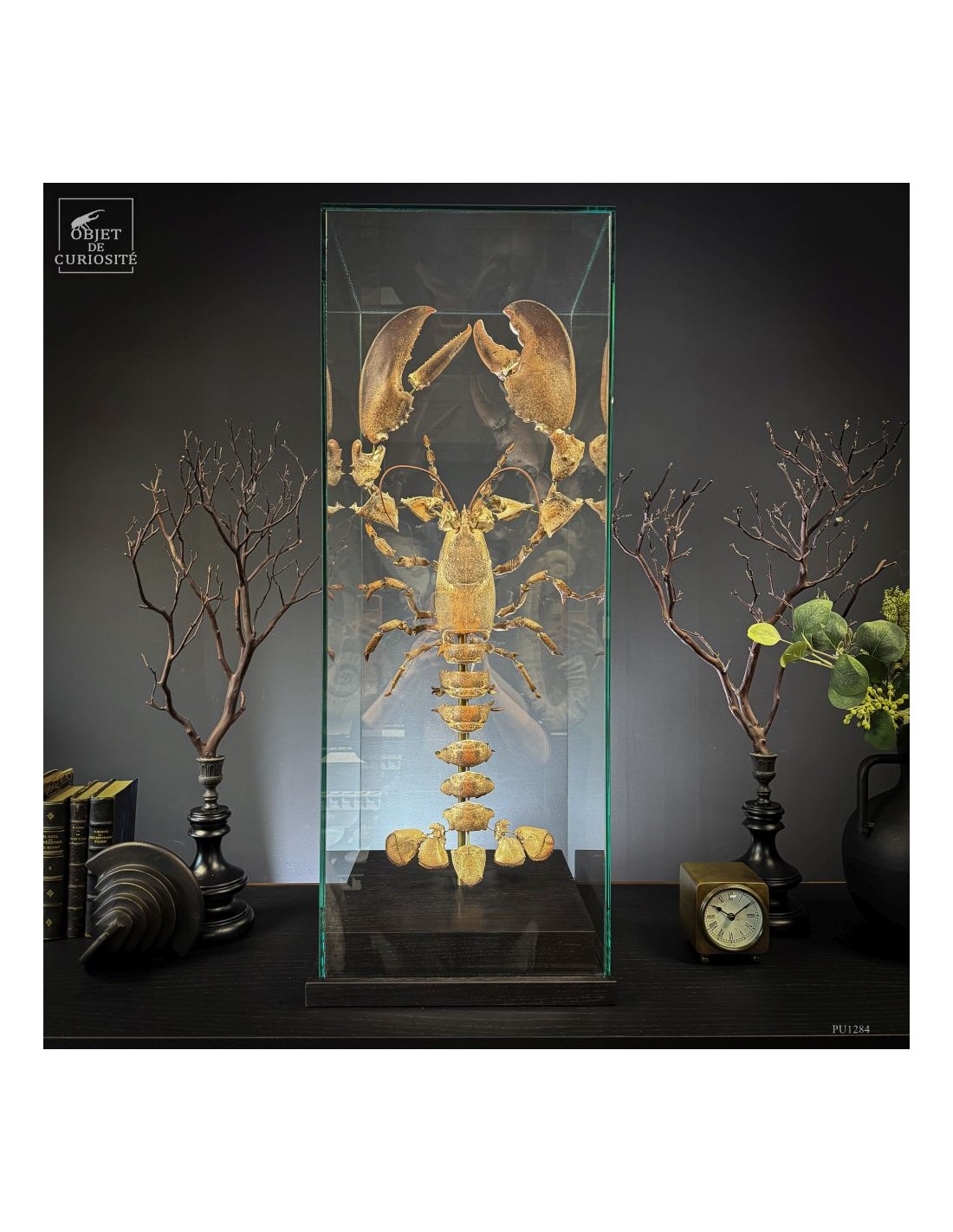 The result is striking: the lobster appears larger than life, as if unfolded in space, somewhere between scientific display and sculptural object. Its segmented tail, asymmetrical claws and articulated limbs can all be studied with unusual clarity.