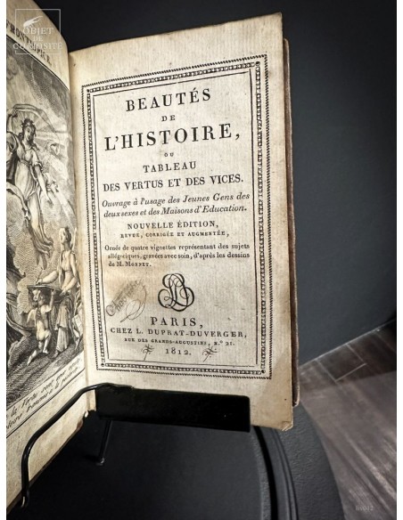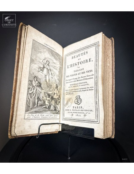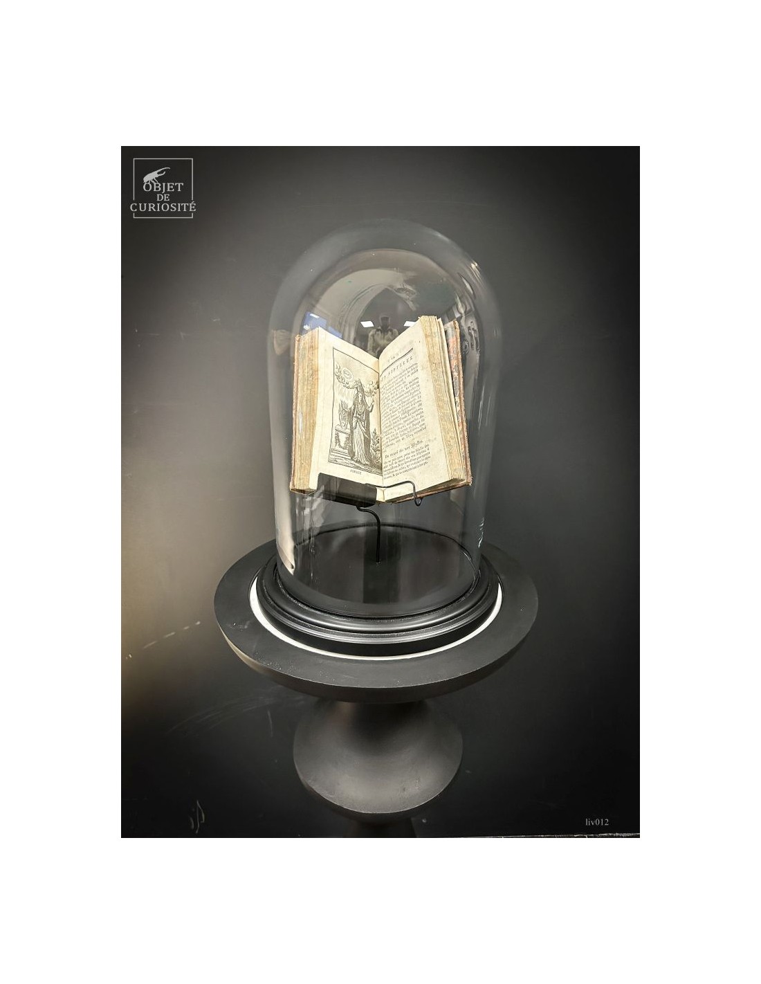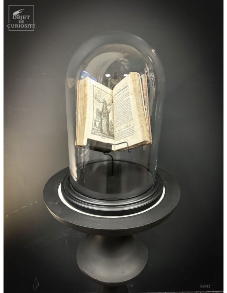 18th century book, back leather, opened to an interresting page (never the same) under a glass globe. The interrest can come from the topic or the design of the page.
