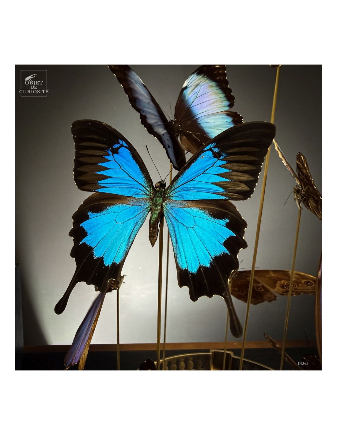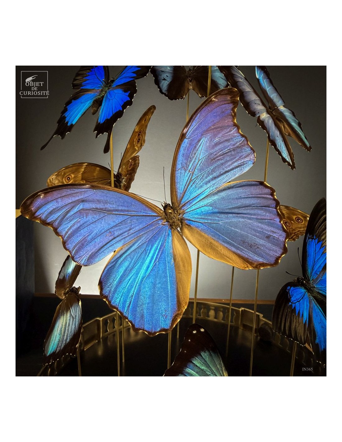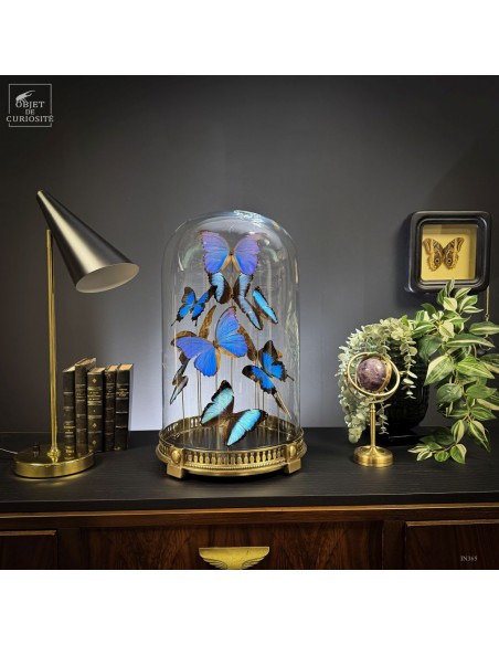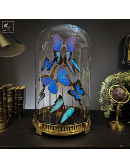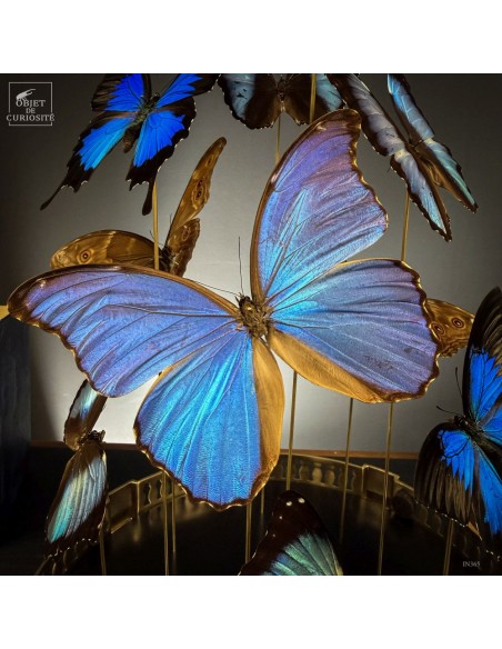 This striking composition brings together 11 butterflies from three different species — 4 MORPHO DIDIUS, 5 MORPHO DEIDAMIA, and 2 PAPILIO ULYSSES — carefully selected for the way their blue shades complement one another. All display the characteristic metallic iridescence that shifts with the light and reveals subtle contrasts between the species.