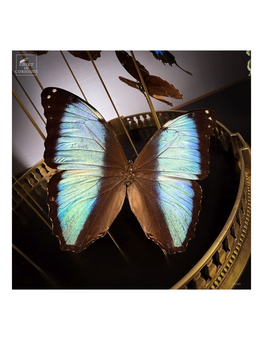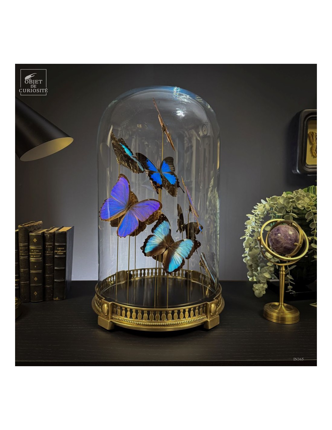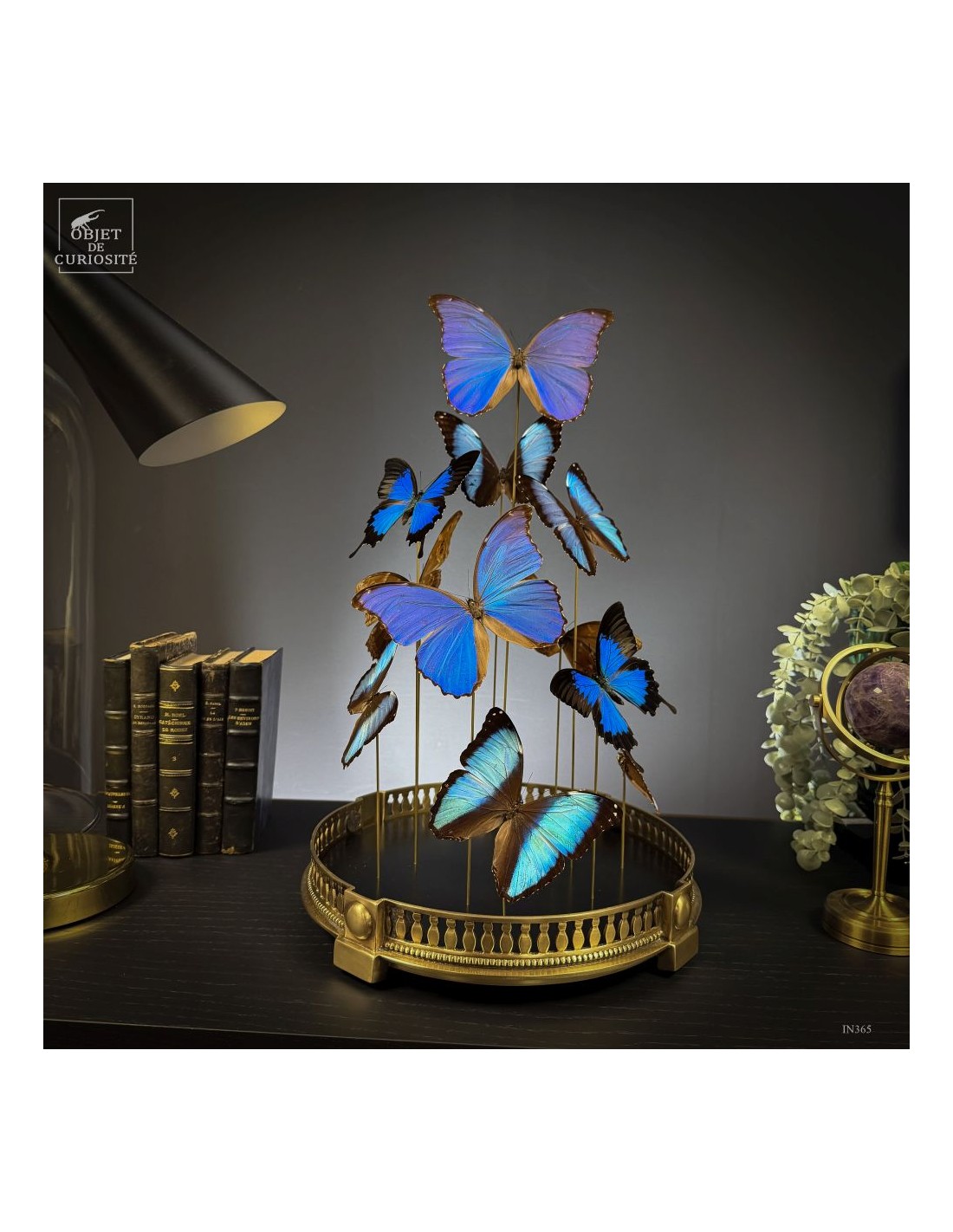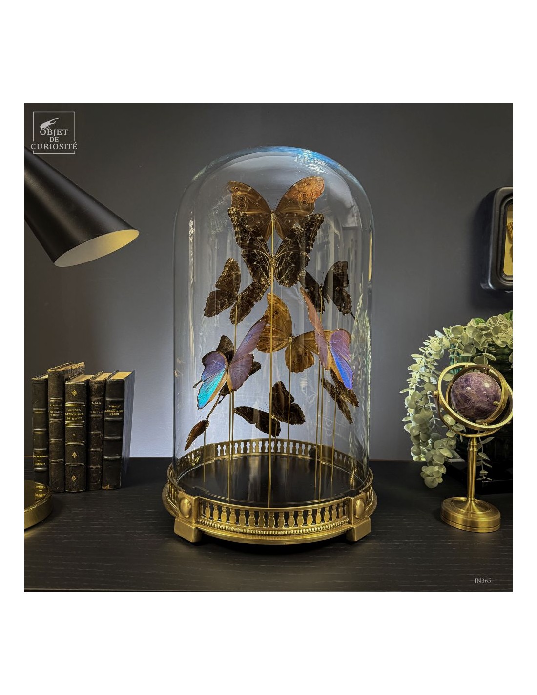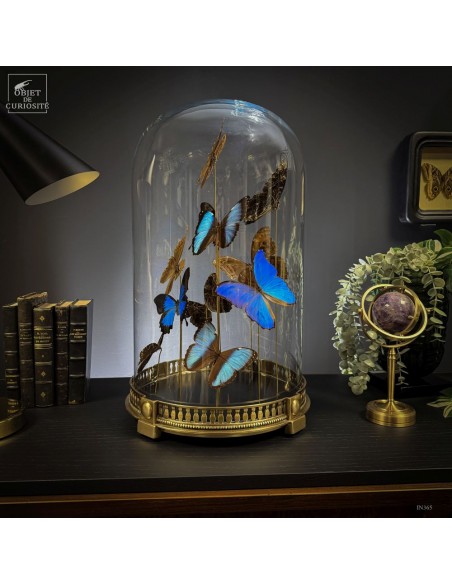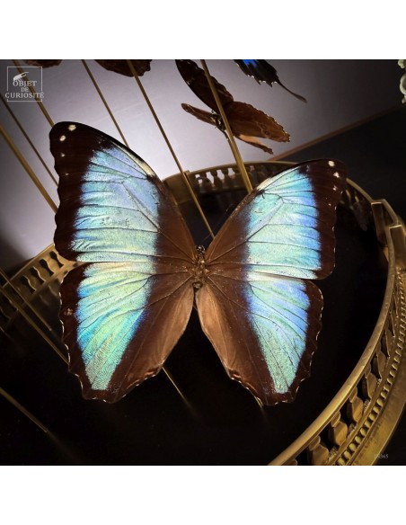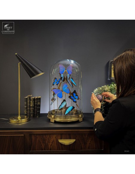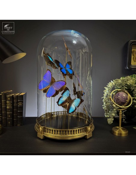 The spiral arrangement plays with wing size and orientation to create a sense of upward motion, almost choreographed. The group is diplayed under a round glass dome with a neoclassical brass base — an exclusive Objet de Curiosité design.