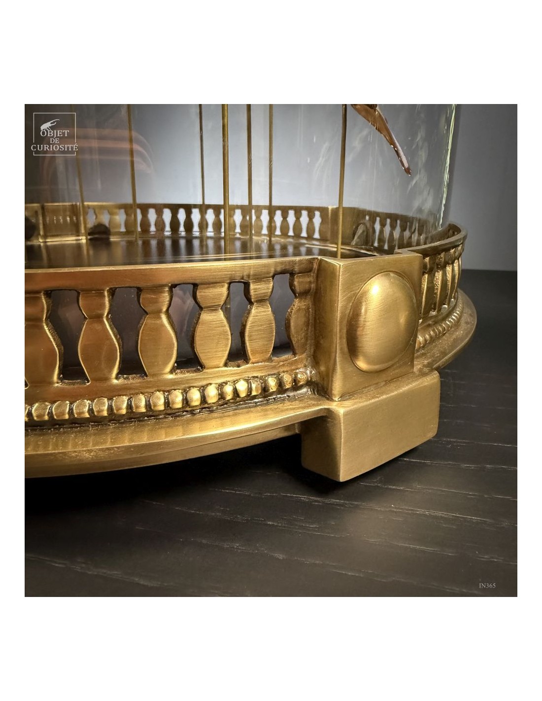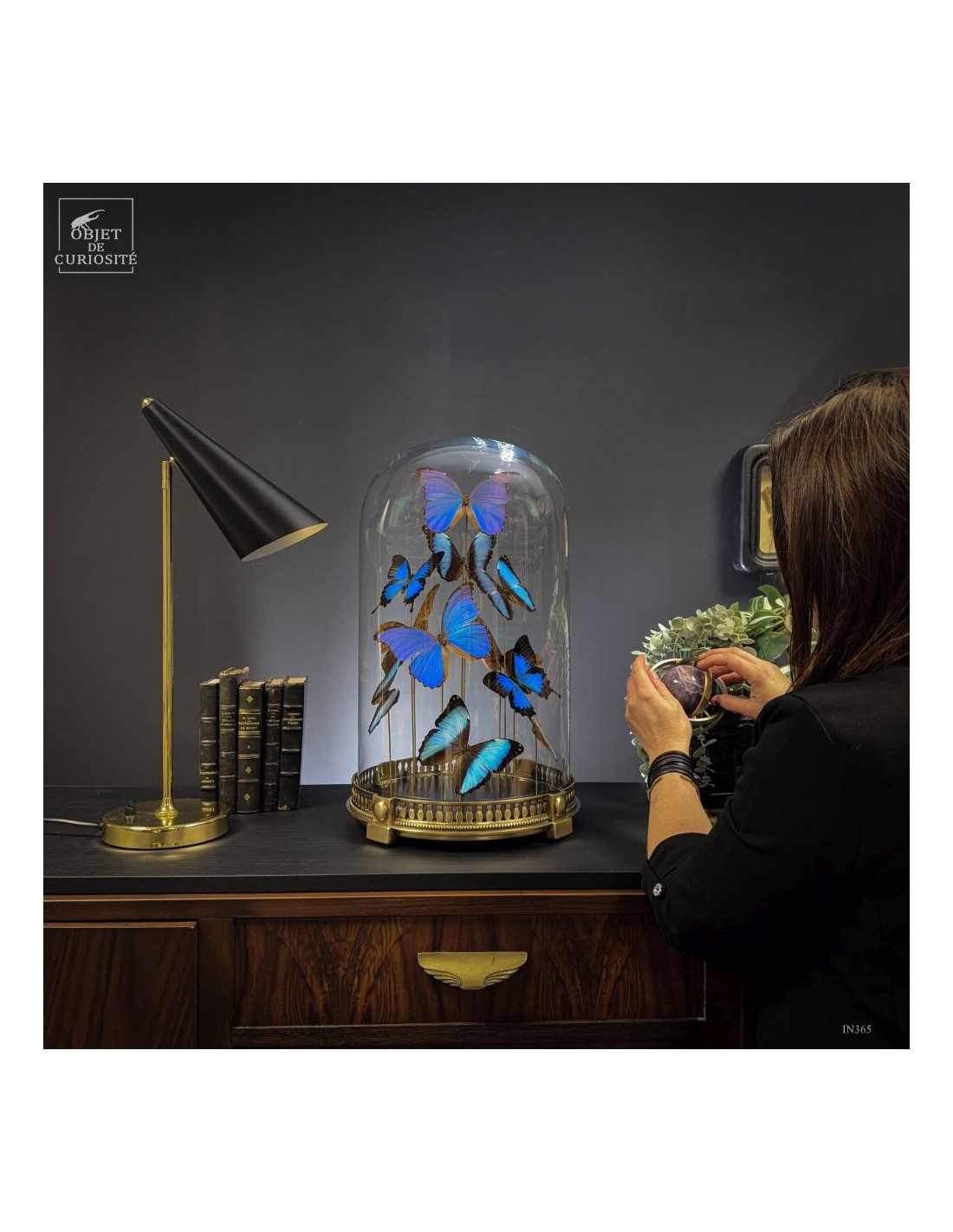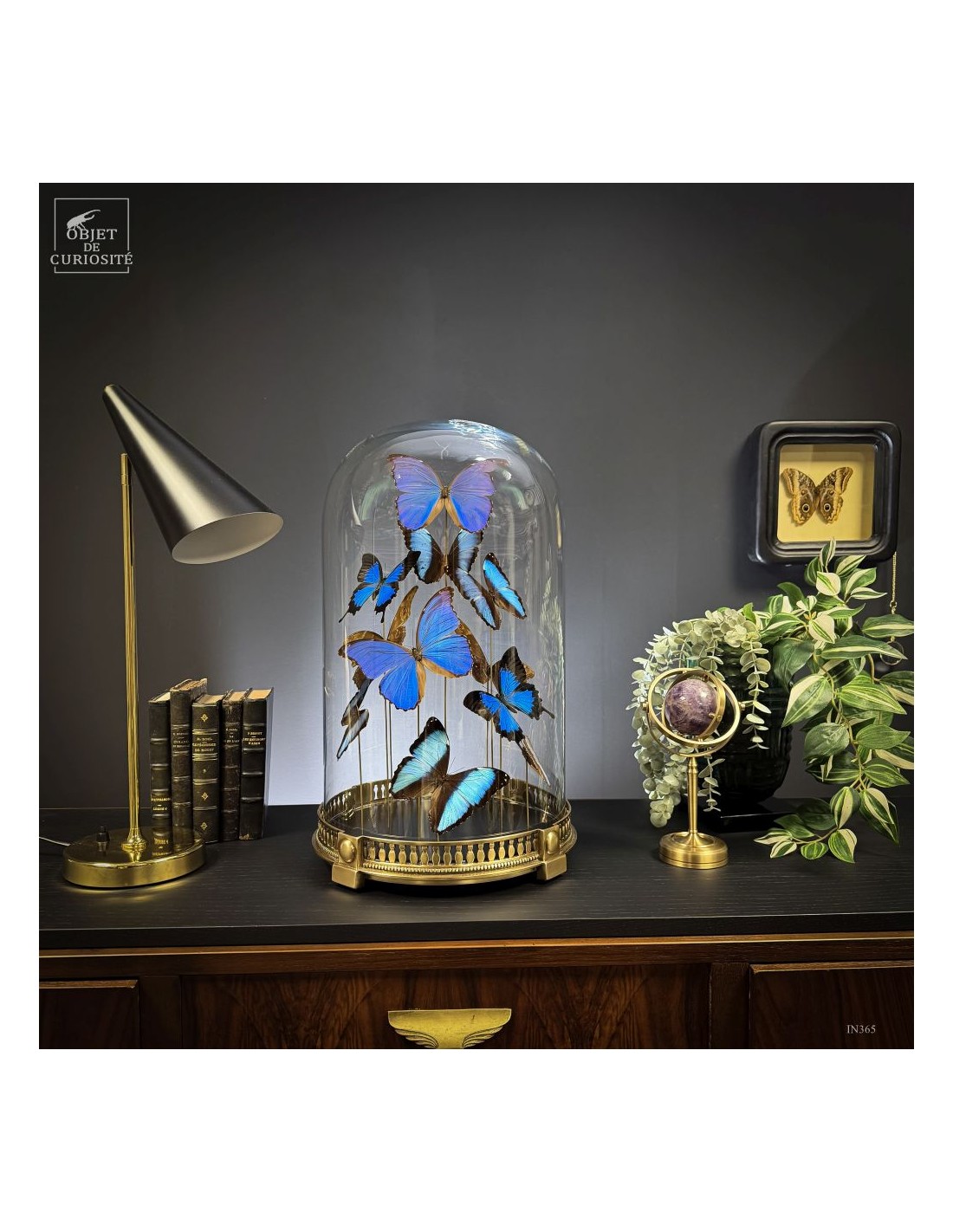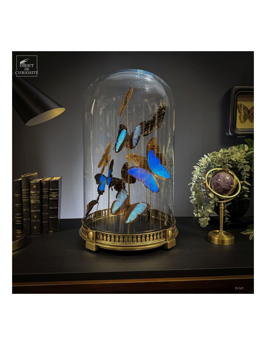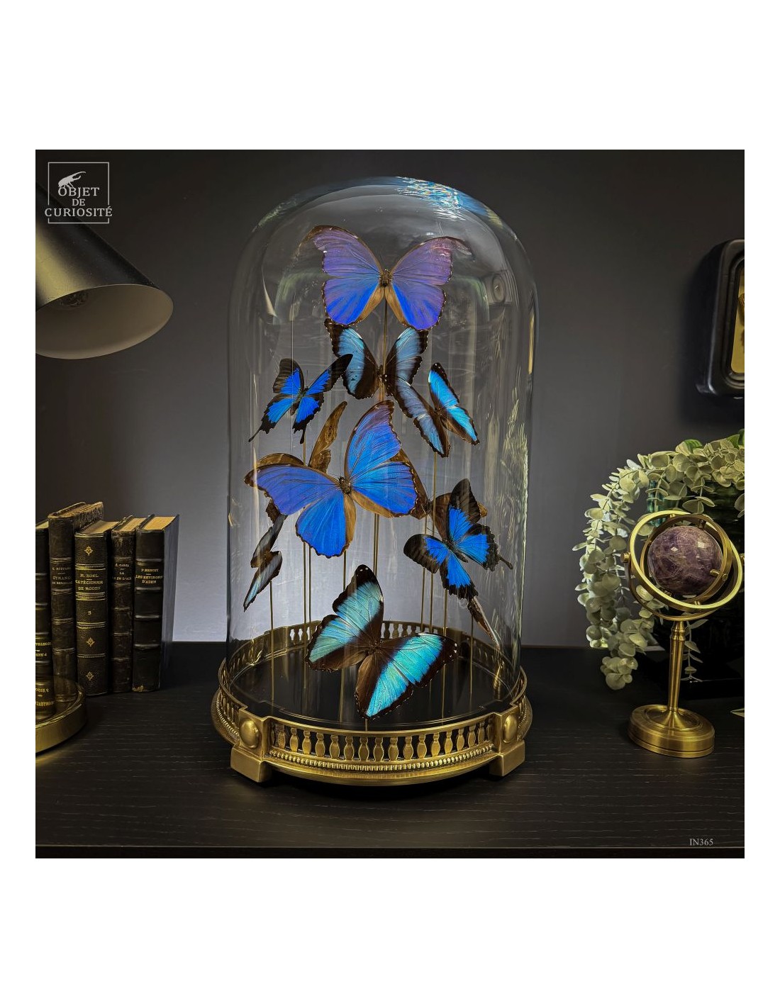 The spiral arrangement plays with wing size and orientation to create a sense of upward motion, almost choreographed. The group is diplayed under a round glass dome with a neoclassical brass base — an exclusive Objet de Curiosité design.