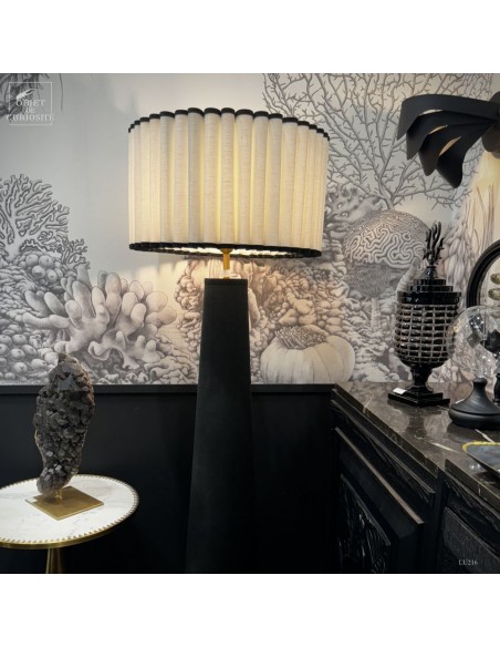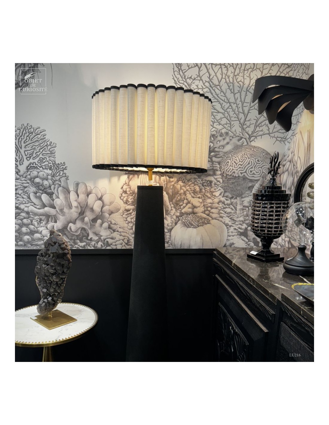The sobriety of black and white, but the extravagance of pleated. Super pleated! The white cotton waves lined with black ribbon of this large lampshade are the distinctive sign of this unique floor lamp. The body is also dressed in black cotton, and the solid brass base brings this discreet luxurious touch. If you liked the creations of the couturier Yssei Miyake, you surely miss the floor lamp that goes with your pleated outfits!
