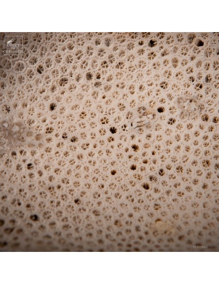 These perfectly regular white patterns are those of a coral fossil — a madreporarian coral close to the genus GALAXEA. Extracted in the southwest of Madagascar, this rare fossil comes from a land area that was once a seabed before the last glaciation. Collected on land, this fossilized coral is not subject to CITES.