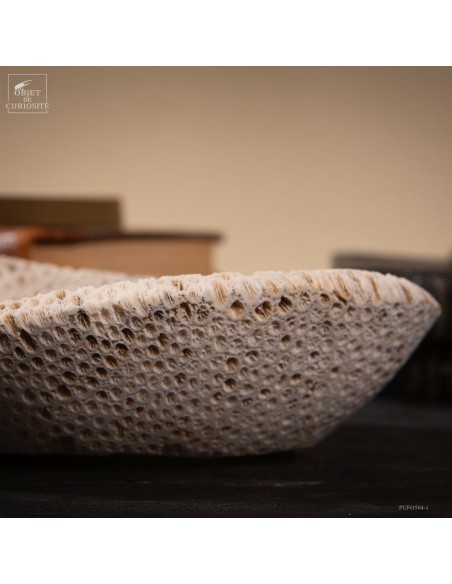 This decorative fossil bowl was crafted near Morombe by a Vezo craftswoman. Each natural curiosity is unique, a mineral decorative object that carries both geological history and the trace of the hand that shaped it.
