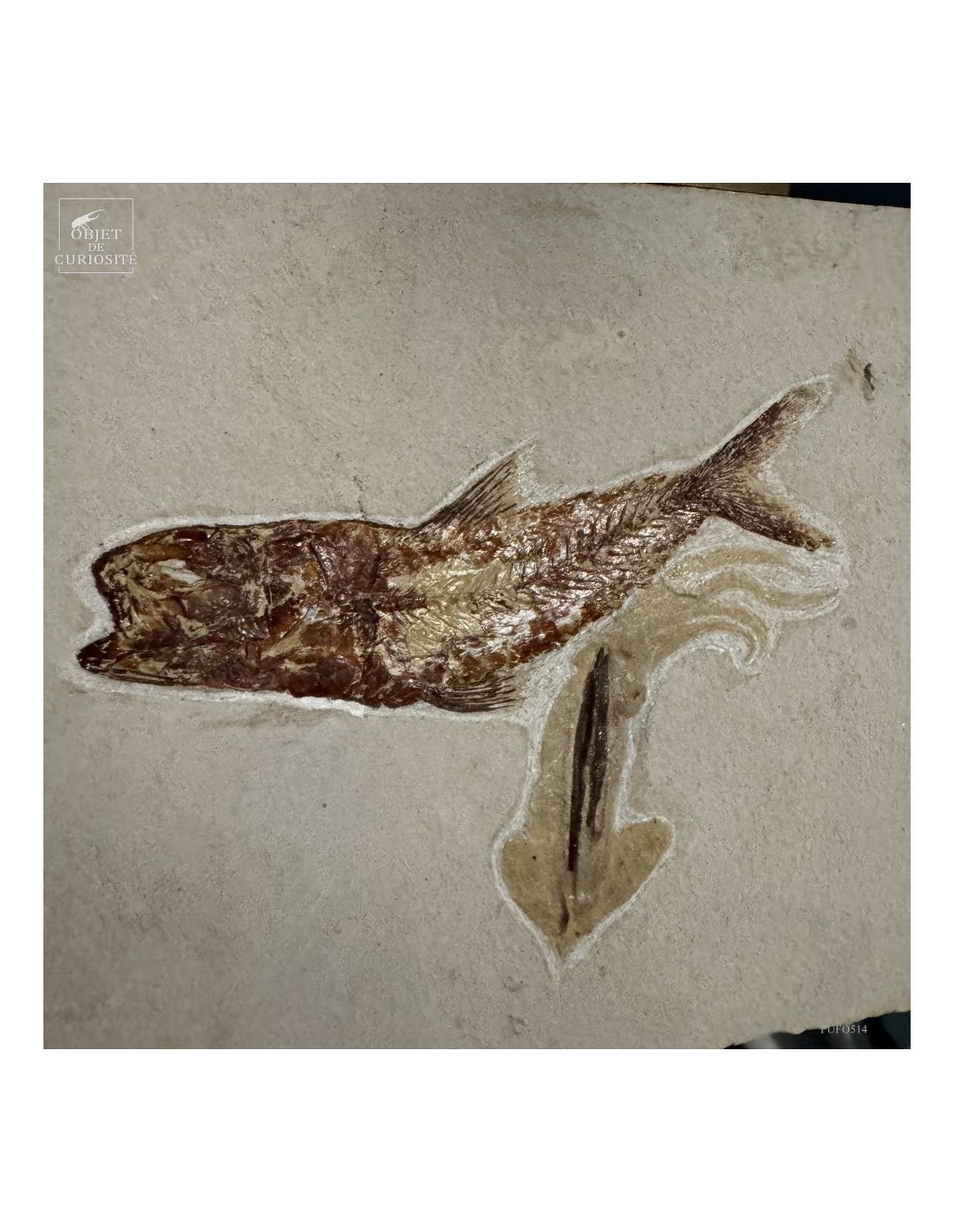 This extremely rare fossil scene brings together a PATEROPERCA fish and a PLESIOTEUTHIS squid, frozen in action for nearly 95 million years: the beginning of the Cretaceous. It comes from famous deposits in Lebanon, in the province of Byblos. These limestone formations are known to collectors and museums, because the fauna of the Cretaceous was perfectly preserved there, including here the "soft tissues" of the squid.The dark part in his body being the Belemnite rostrum: the only hard part, a kind of squid cuttlebone. These are the most beautiful marine fossils known, thanks to a lack of oxygen in the water at the time of their death, following torrential rains that led to an over-development of microorganisms -phytoplankton- that consumed all the oxygen.