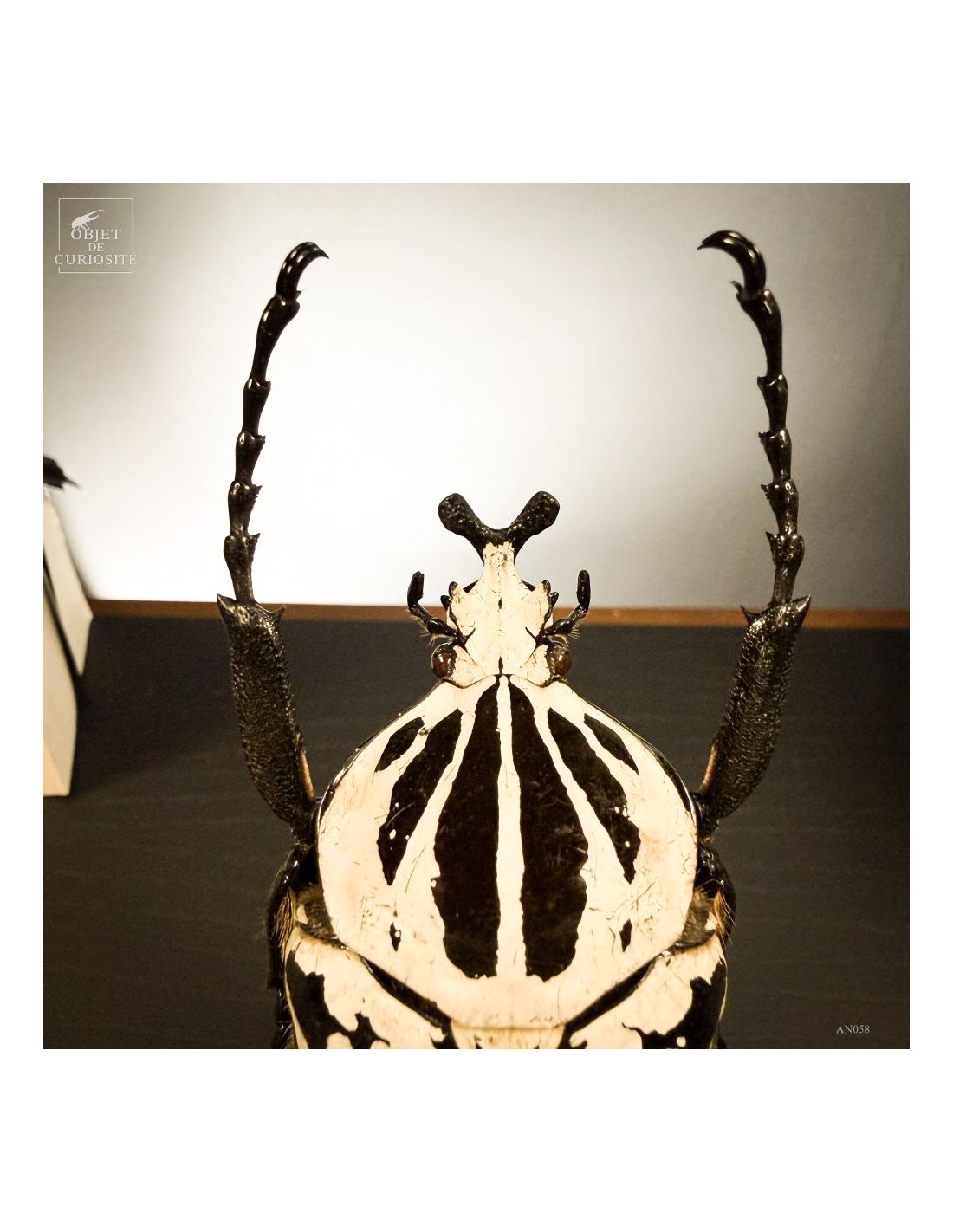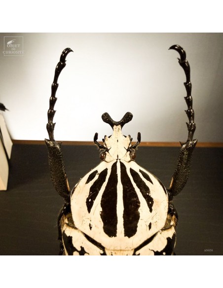 Described for the first time in 1801 by Jean-Baptiste Lamarck (a french naturalist), Goliathus is an African species which can reach up to ten centimeters long and weigh up to 100g, what makes the show of their first flight at the begining of the raining season when they crowl out of the ground, very impressive. The Y-shaped black horn of the males is used as a lever, fighting during reproductive period or just defending a sweet fruit. A perfect lining in black and white.