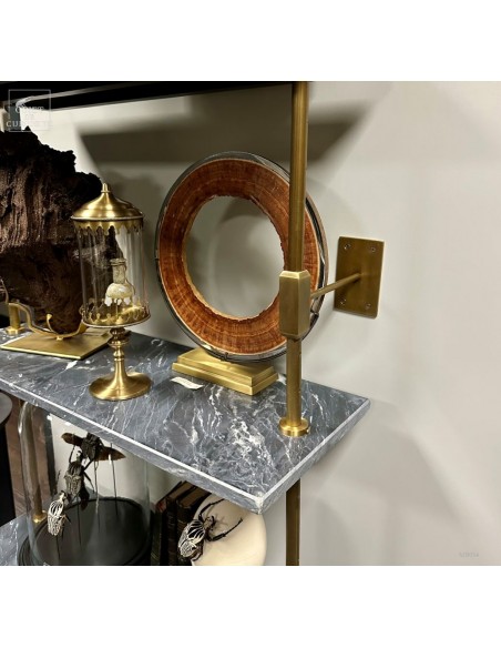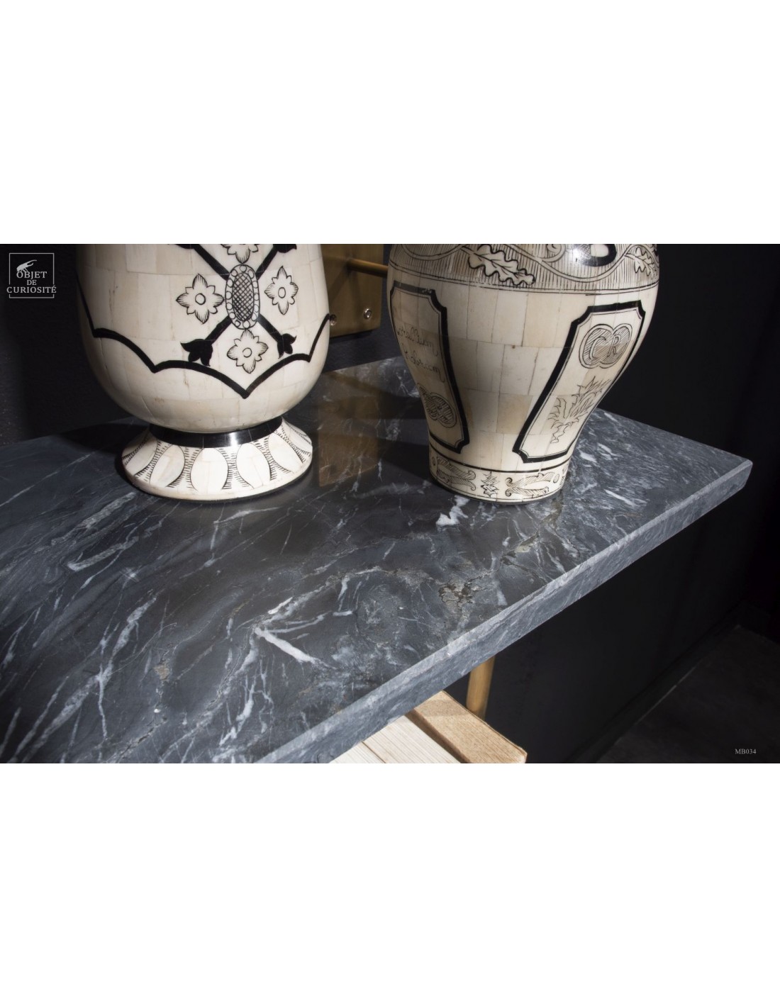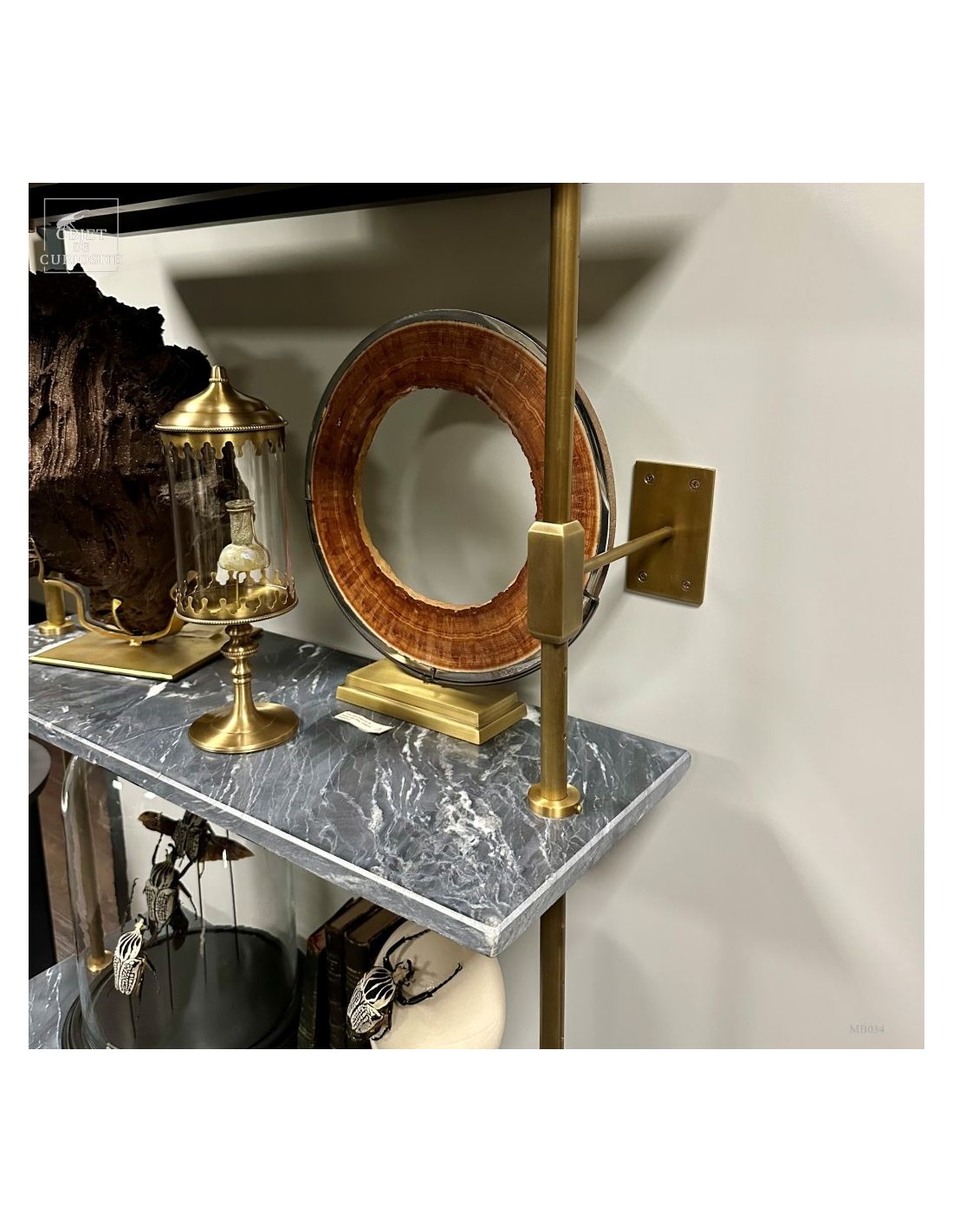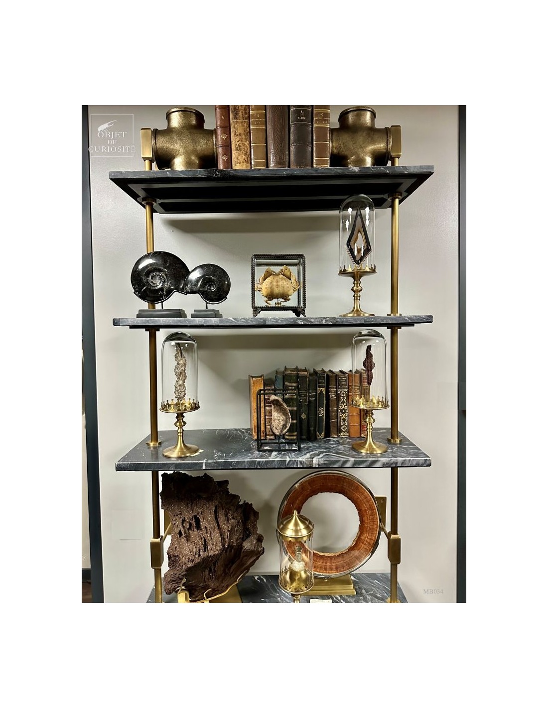 Black and white marble with antic brass. The very simple line of this adjustable library keeps it elegant and discrete. Each marble shelf is 76cm Long X 28cm large, and can be adjusted every 5cm according to the size of the treasures you want to display. The only limit in total height will be the ceiling: why not a library of 5 meters high? Or starting above a counter?