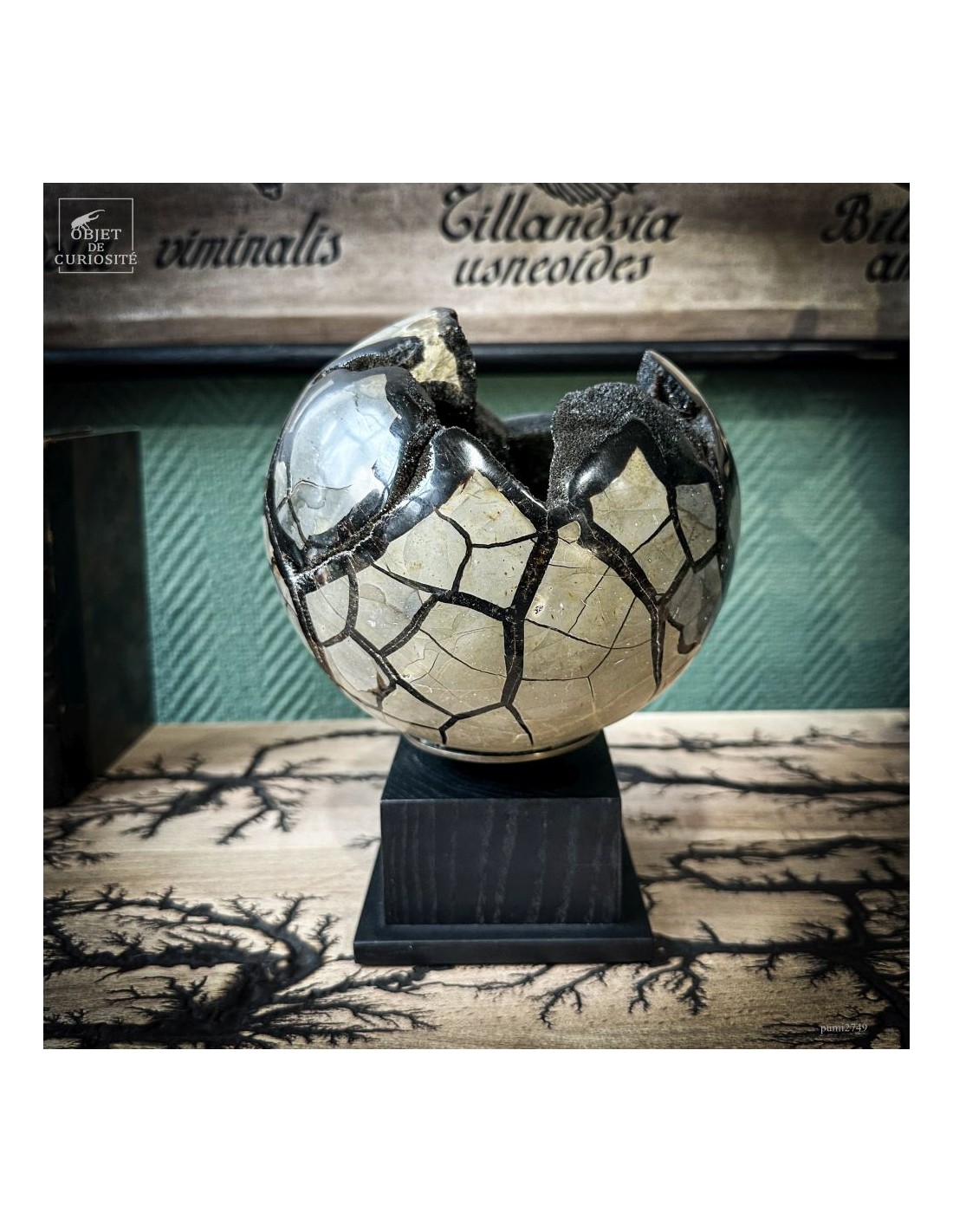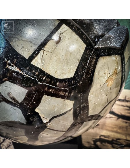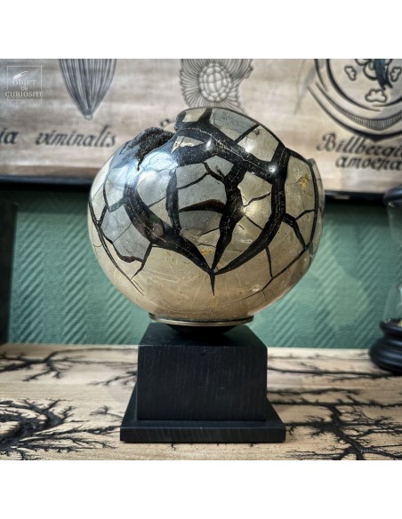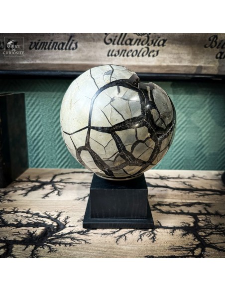 This SEPTARIA sphere was formed from clay-rich sediments containing organic matter, often originating from decaying plants. Over time, pressure and compaction caused internal cracks to appear. These cavities gradually filled with crystallized minerals—typically calcite— capturing the slow transformation from organic deposit to mineral structure.