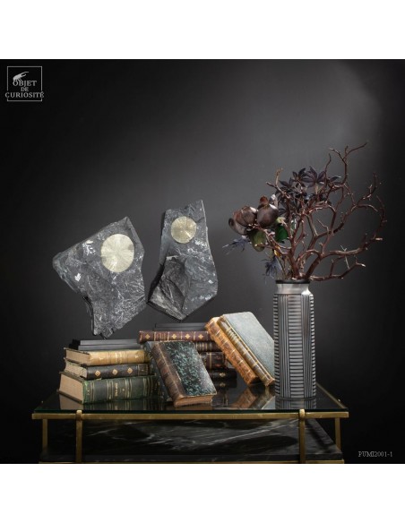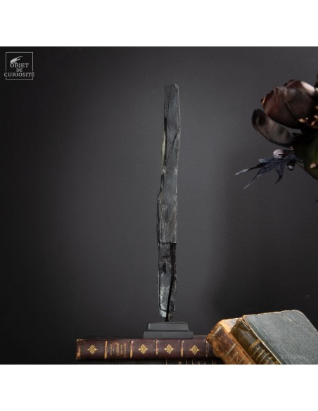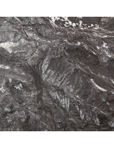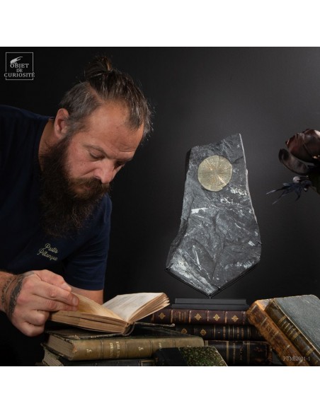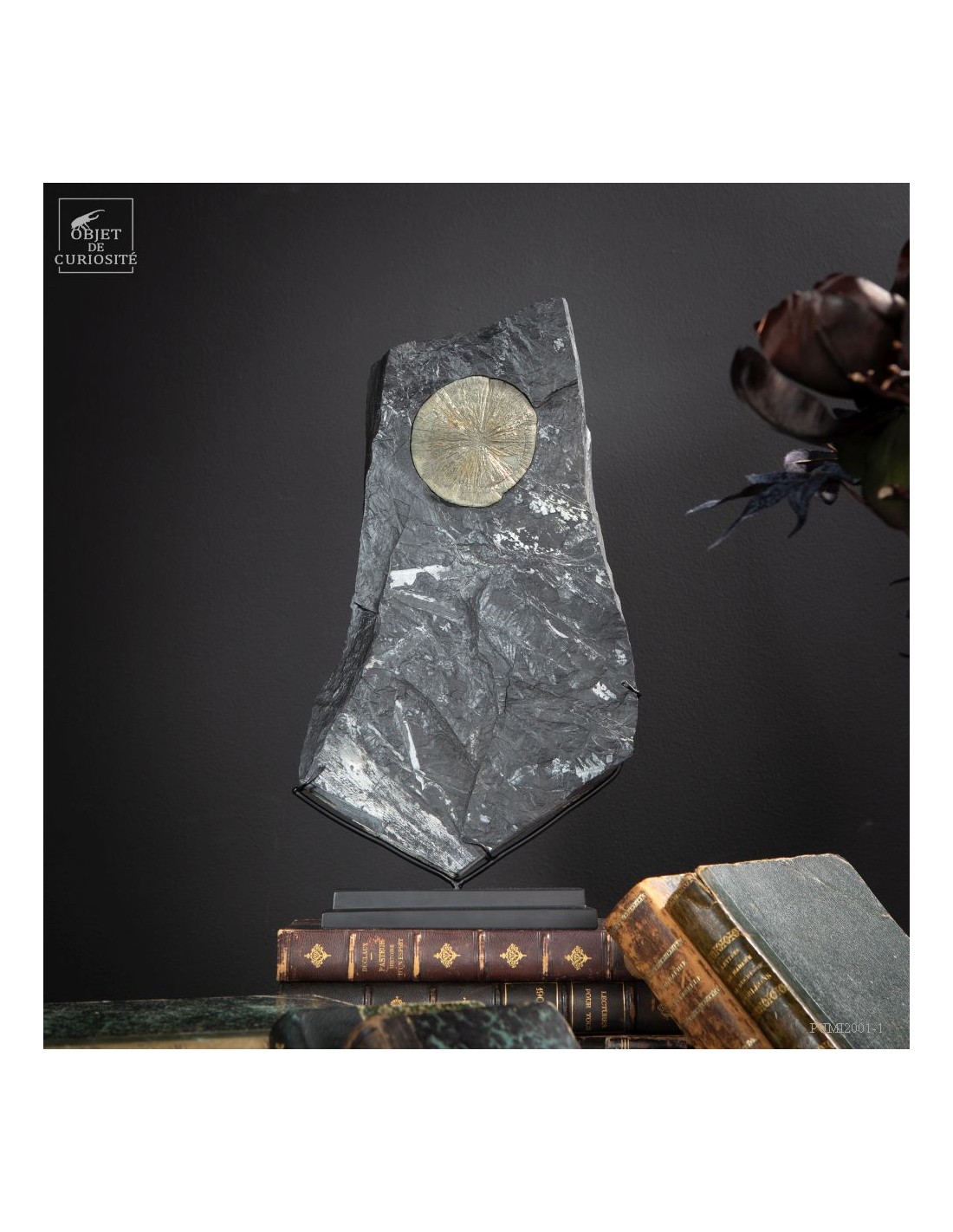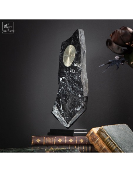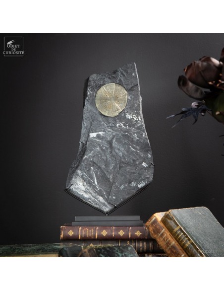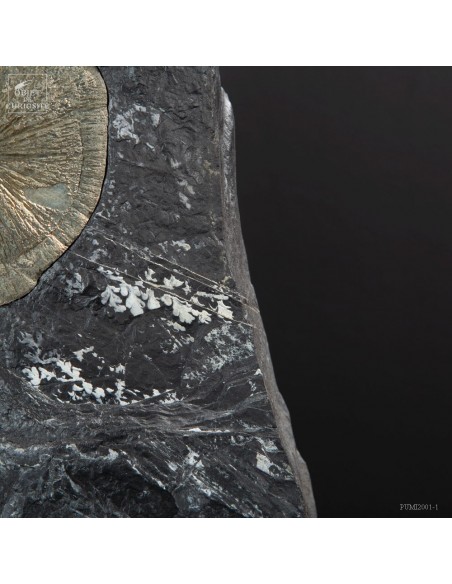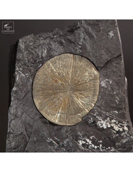This pyrite is famous for its sun'shape . We found this specimen in the USA, in the Illinois, more exactly in the coal-mines, where it is inlayed in the patches of slates.  Prehistoric ferns can also be seen on the same matrix. It has about 250 / 300 million years. By lack of space, this one  crystalized in a flat shape instead of the cubic shape it usually take.