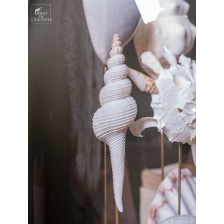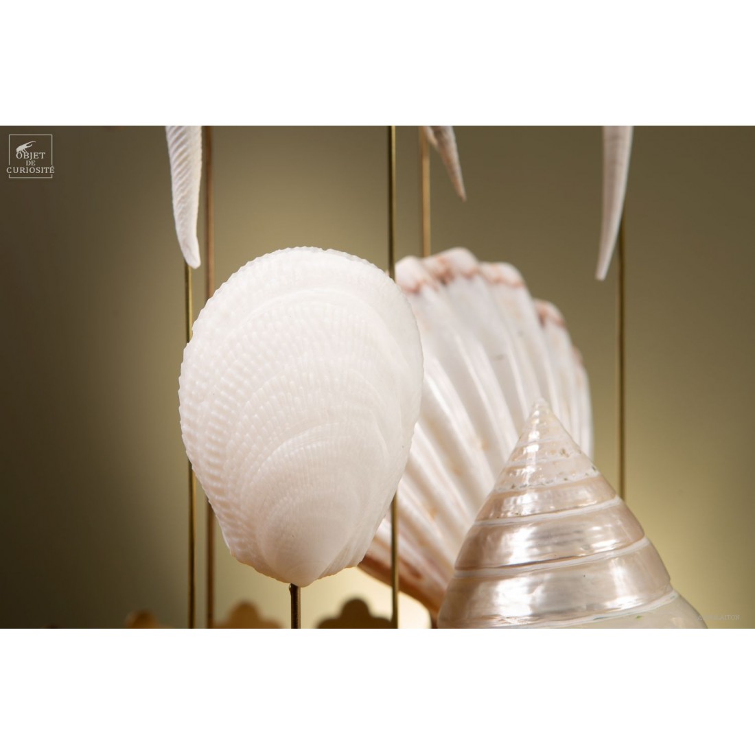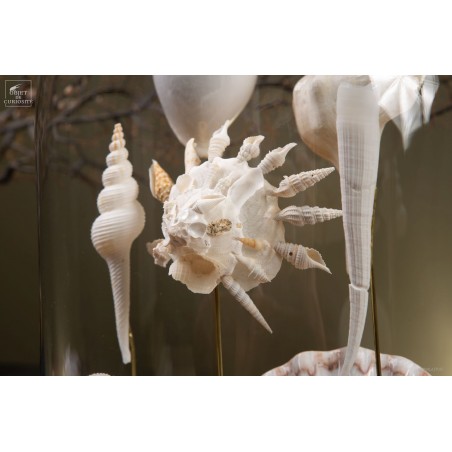 Collection of 8 white shells displayed under glass with a brass base. Murex Pecten. The Ovula ovum, a smooth snow white shell, doesn't look like that under the sea, as the mollusk that leaves in it is actually black and its mantle cover almost the complete shell. Fusinus undatus, large white snail, Trocha Niloticus, pointed like a pyramid, Fissidentalium of great depths or even a xenophohora: these shells that grow by incorporating elements they find around them: shells, pebbles... in the spirals of their shell.