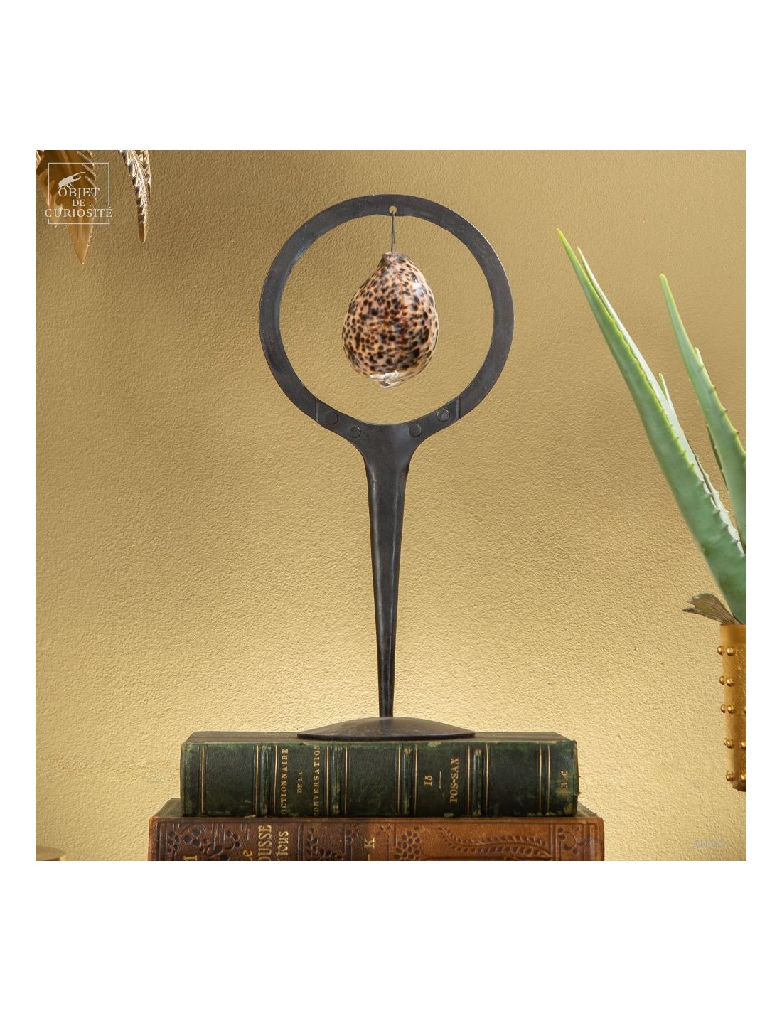 This Humpback cowrie, since it is its common name, is found throughout the Indo-Pacific area, from East Africa to Hawaii. When this seashell is active (mainly at night), its body -the mantle- covers the shell, sometimes entirely. Since prehistoric times, this shell has been used as an amulet or currency in many civilizations. And in this wrought-iron circle, it goes very well with the Cypraea Mauritiana, with a larger display circle, but equally doted(AN410).