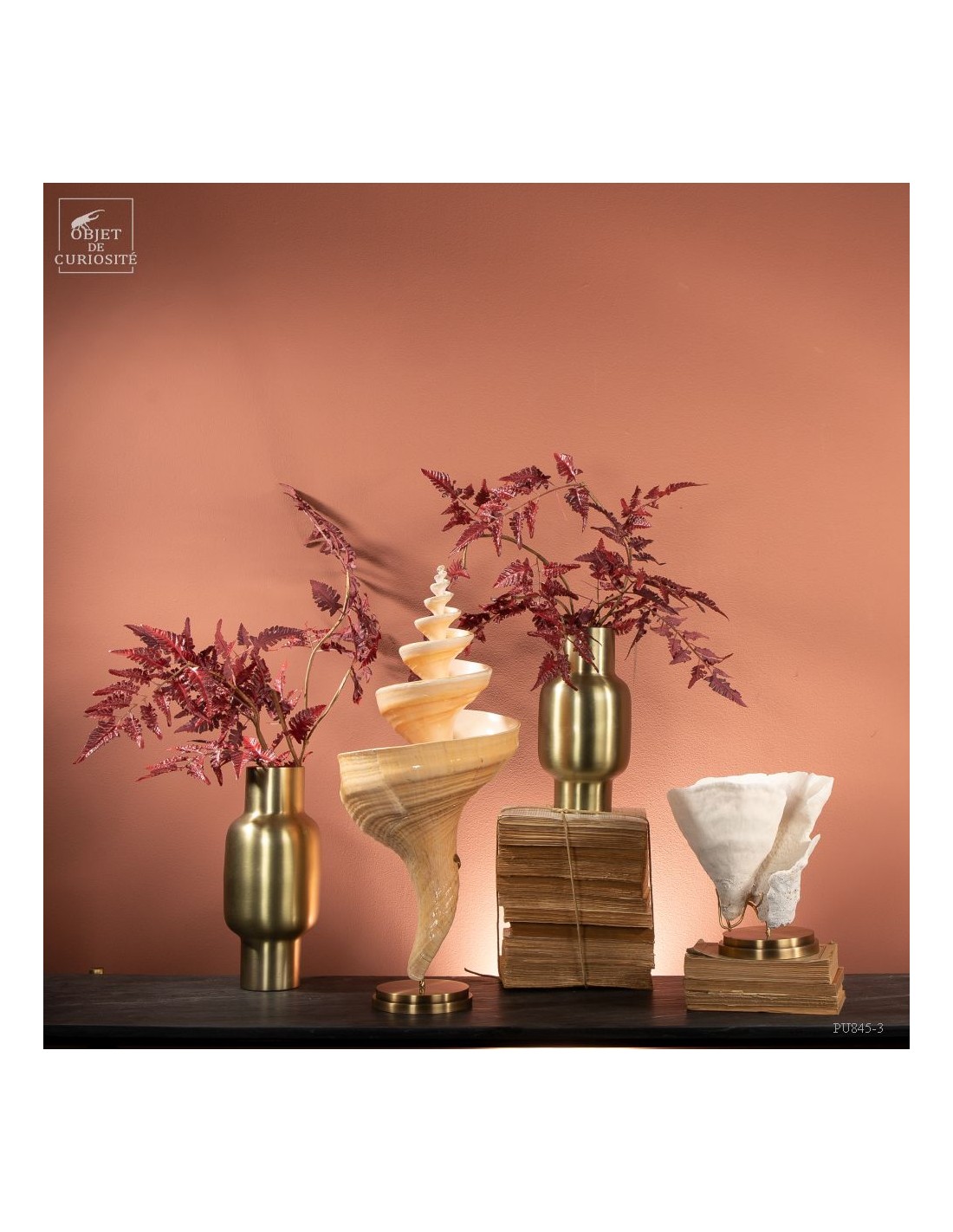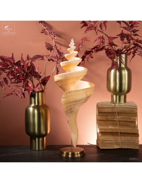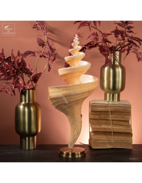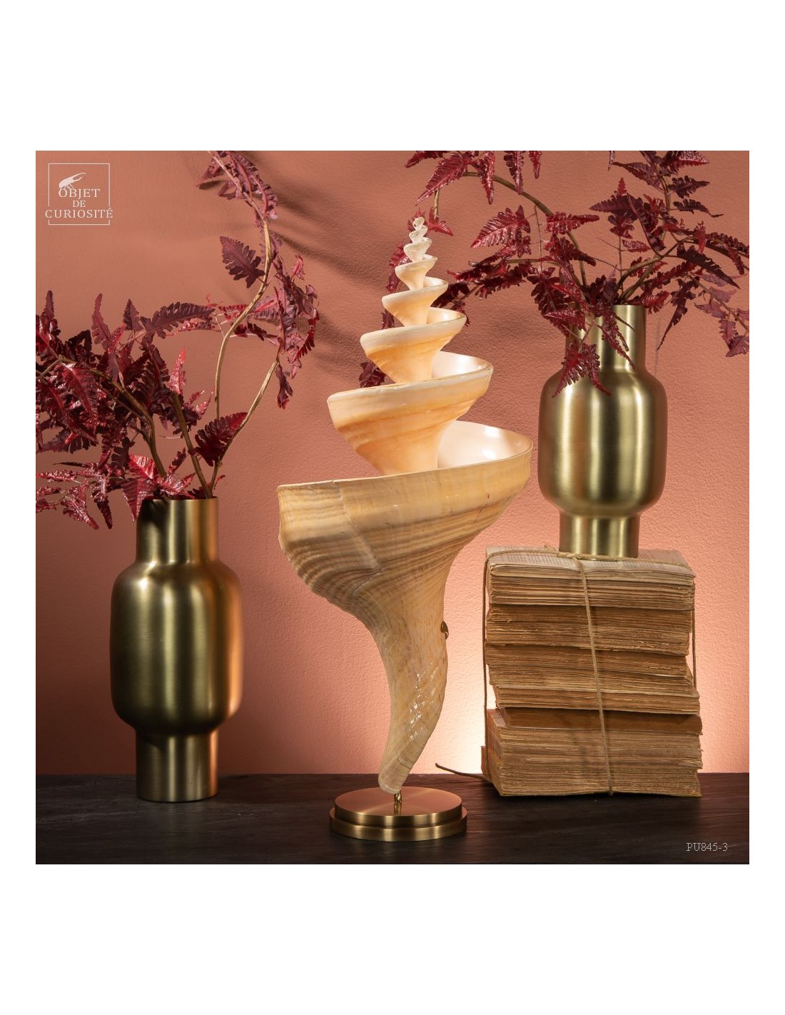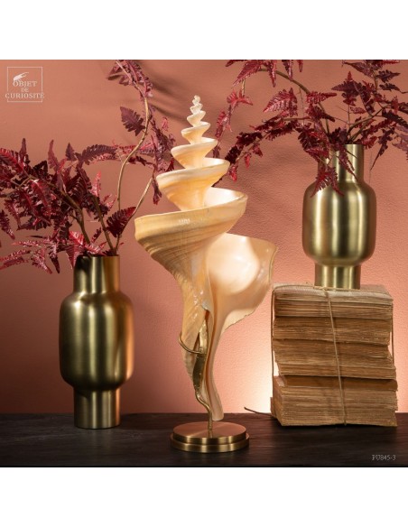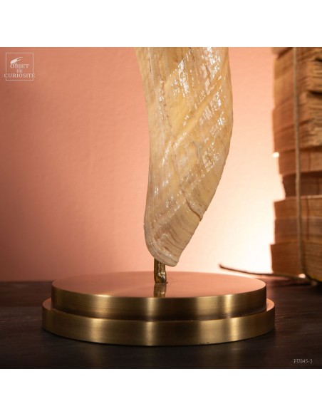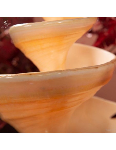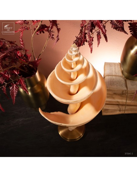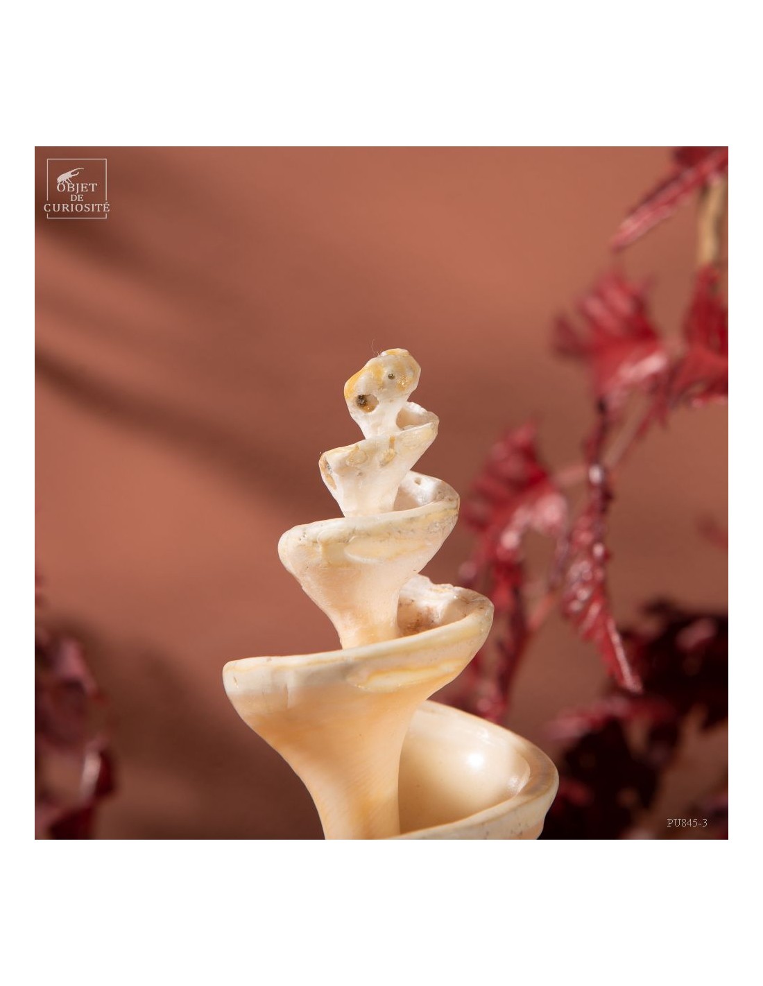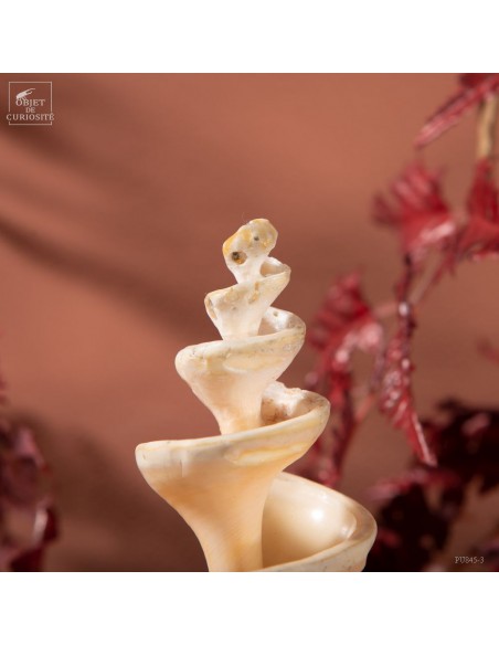 Both natural and man made, this shape was obtained by cutting a part of the shell of a Syrinx Aruanus shell, largest shell in one part of the world. It is the biggest "snail" on earth, more exactly underwater! This enormous marine gastropod (up to 18Kg) has a completely yellow body. This spiral is the natural form of this shell, but here it has been highlighted. Rare work.