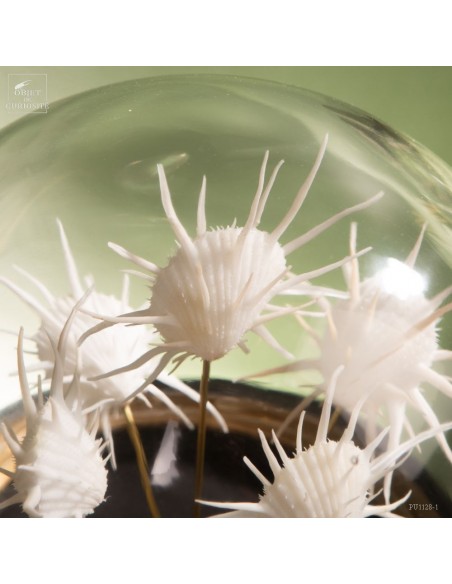 Original presentation, like a wedding bouquet from the sea, under its glass bubble globe.