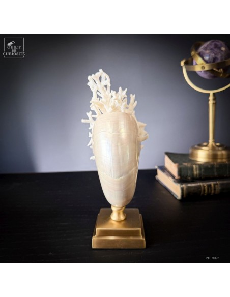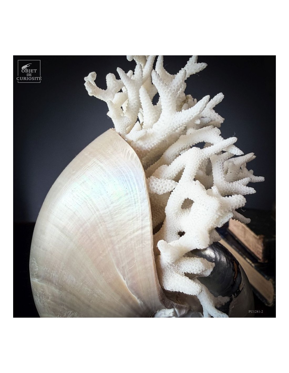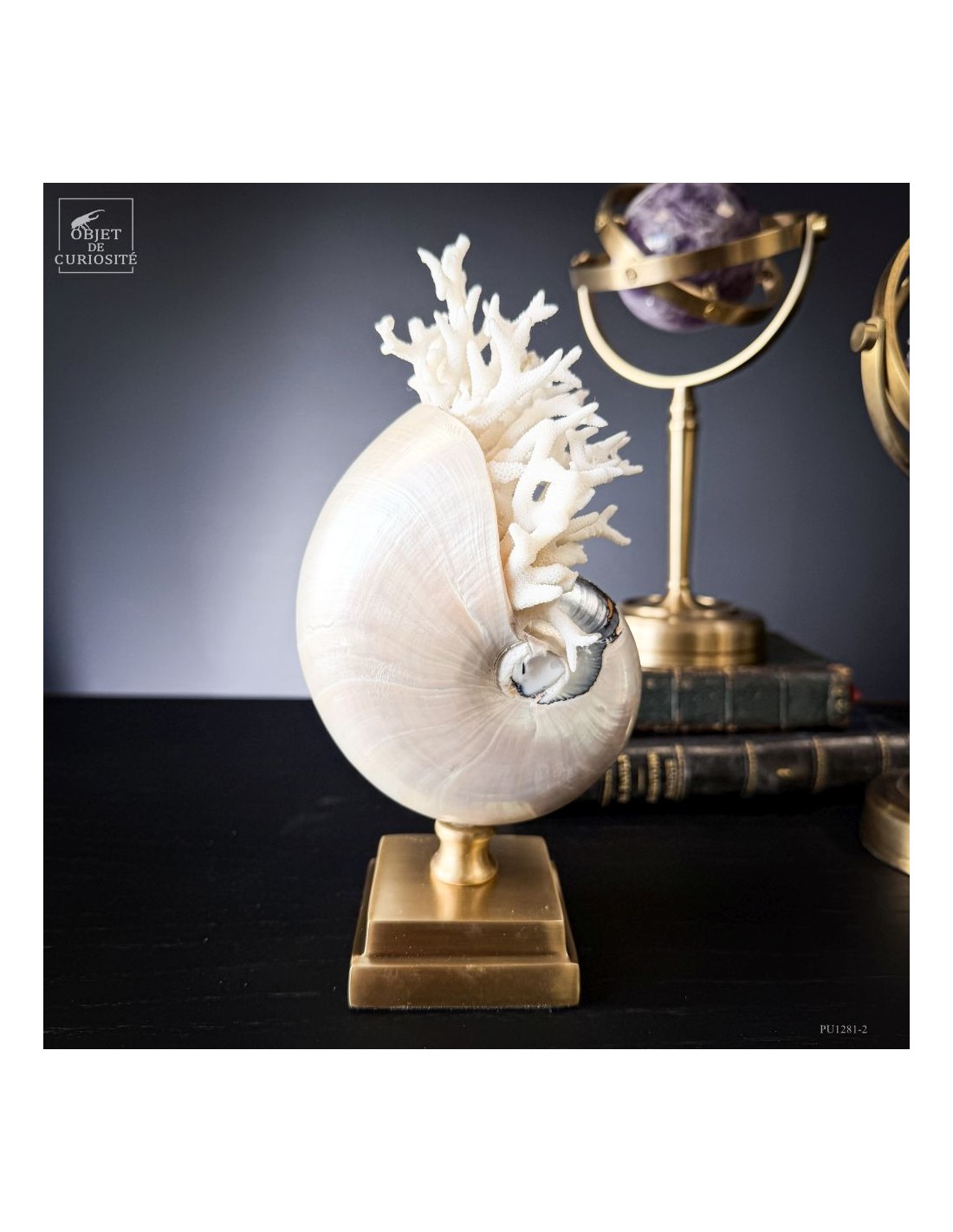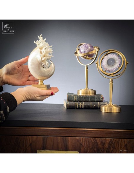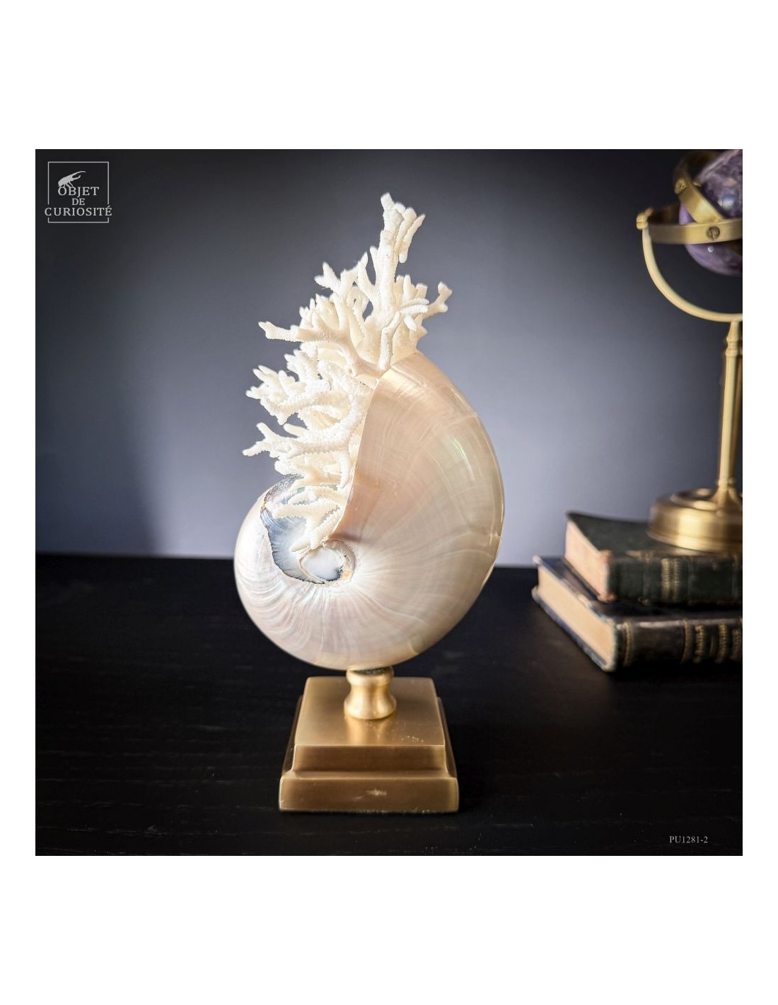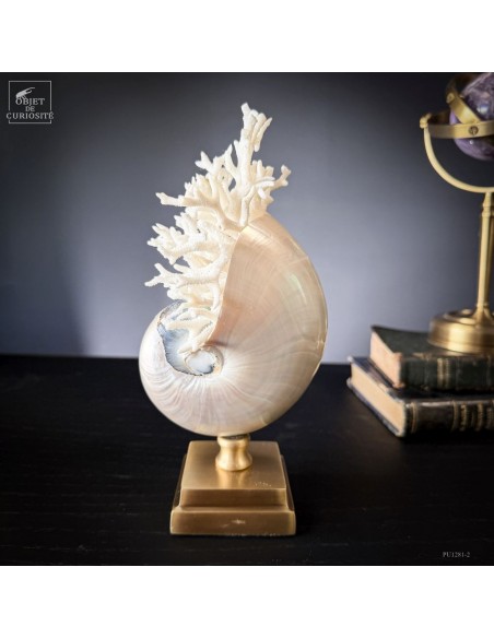 A composition in the spirit of the eighteenth century, made of a pearly Nautilus. This sea shell, the NAUTILUS POMPILIUS, is entirely mother of pearl because it was simply polished, and this beautiful color is the bottom layer of the shell. This Nautile is home to spicky coral (SERIATOPORA HYSTRIX) that seem to have replaced the tentacles of the Nautile. and on its brass base, it will stand out. Species protected by the Washington Convention.