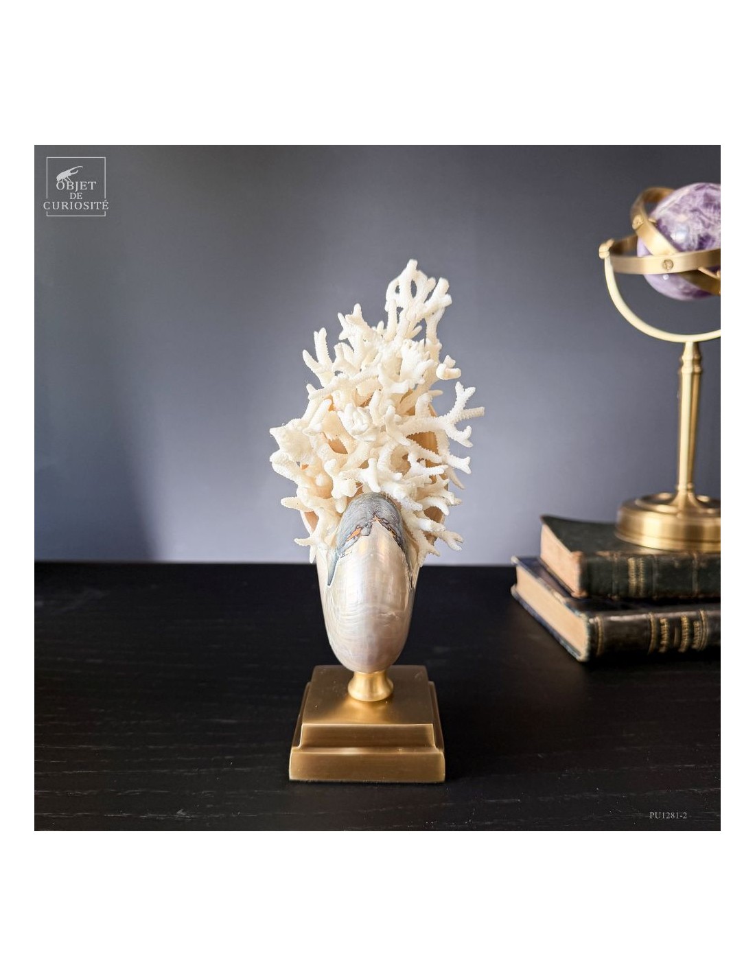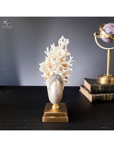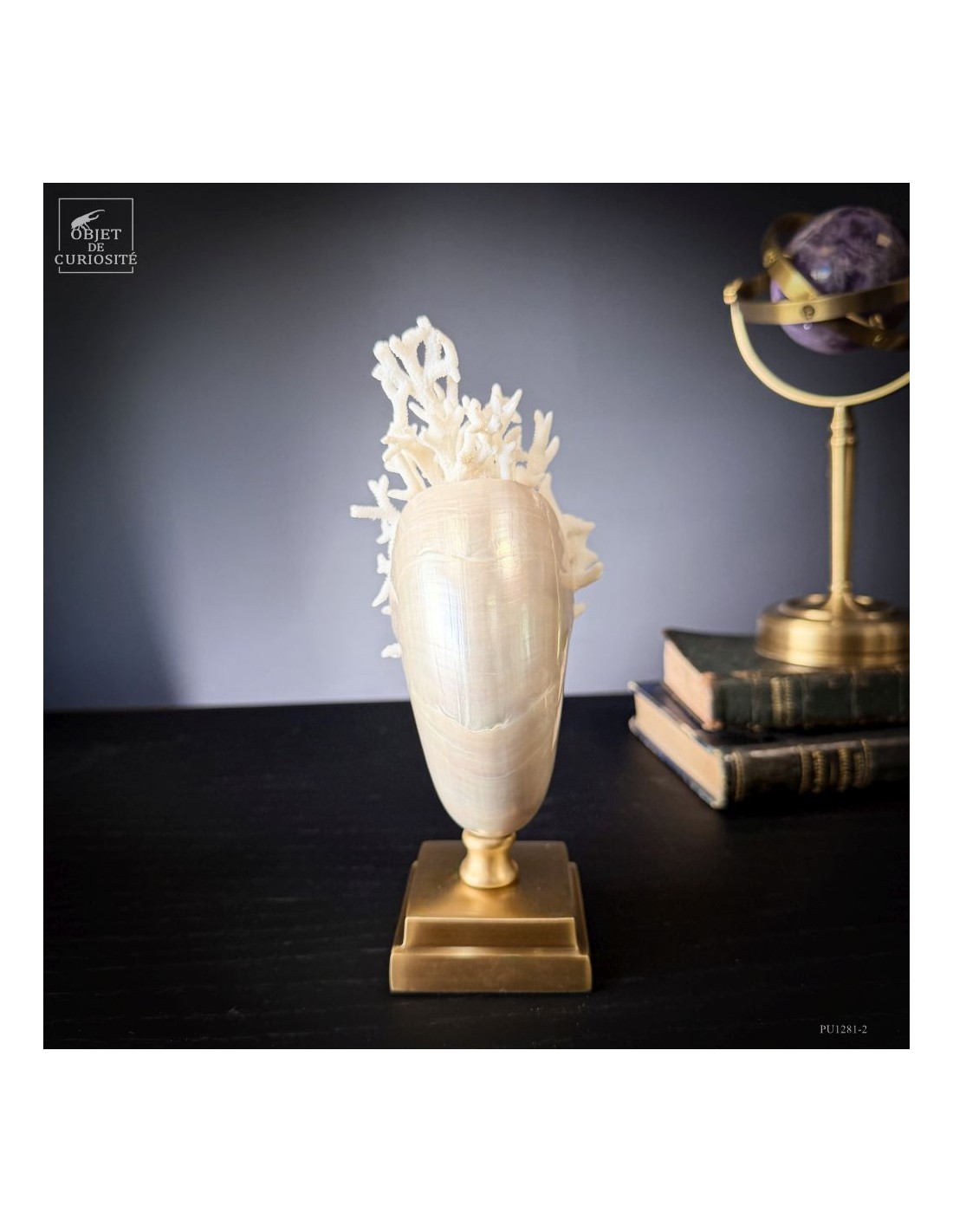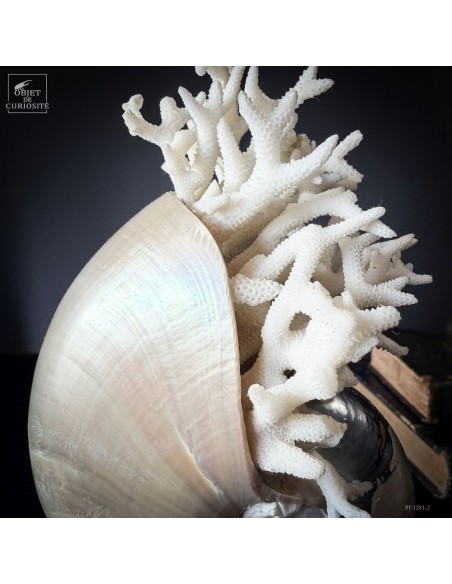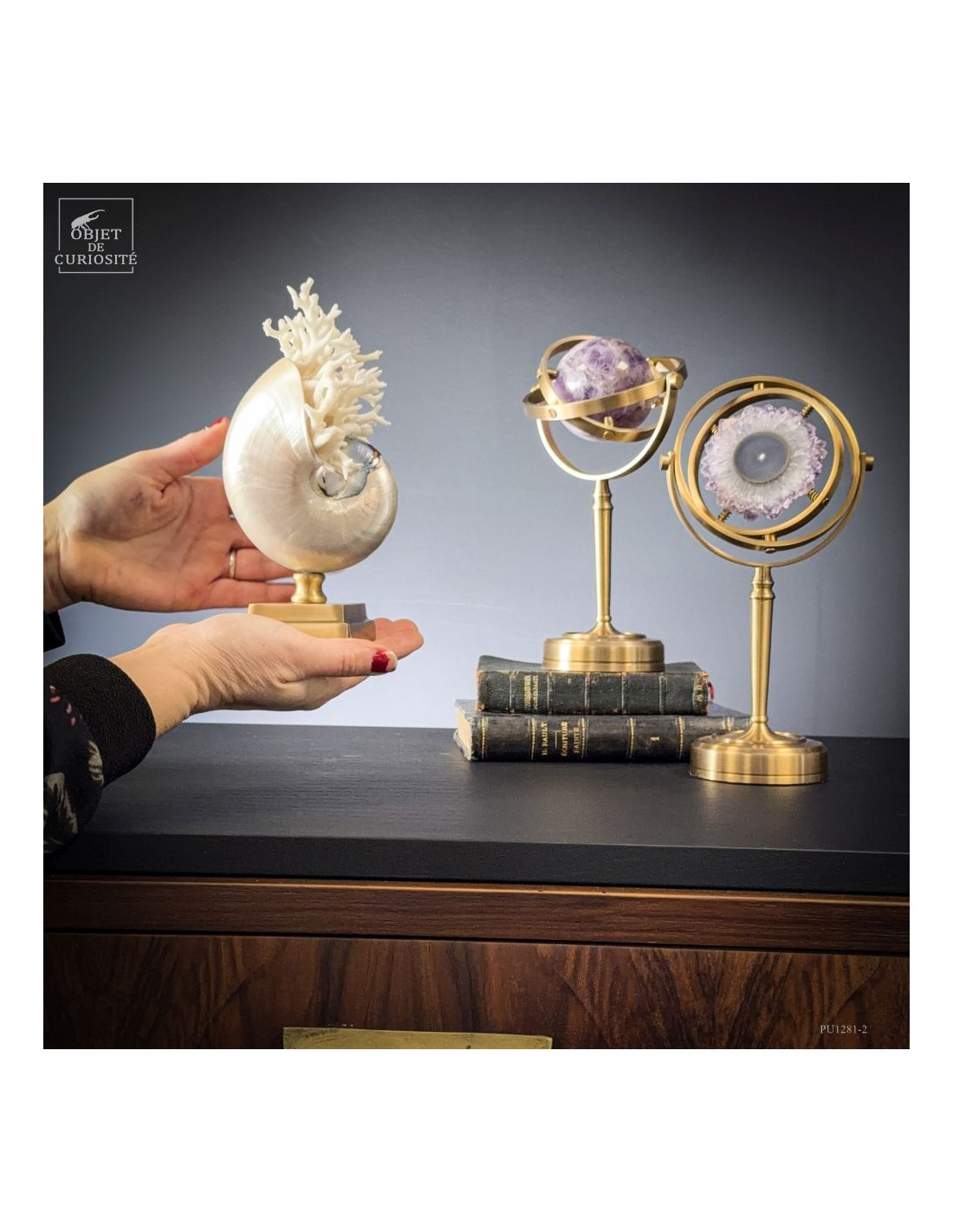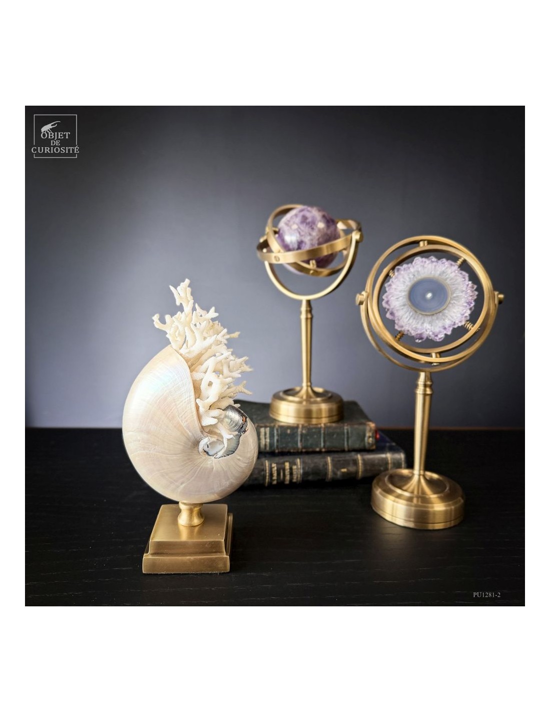 A composition in the spirit of the eighteenth century, made of a pearly Nautilus. This sea shell, the NAUTILUS POMPILIUS, is entirely mother of pearl because it was simply polished, and this beautiful color is the bottom layer of the shell. This Nautile is home to spicky coral (SERIATOPORA HYSTRIX) that seem to have replaced the tentacles of the Nautile. and on its brass base, it will stand out. Species protected by the Washington Convention.