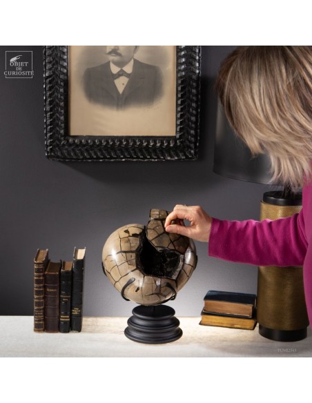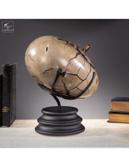 This Septaria heart that can be opened was of course carved to accentuate its natural shape. Initially: a nodule of Septaria from Madagascar. Septarias are marine nodules formed millions of years ago from organic matter, such as plants or animals, that washed up on muddy sea floors. This complex process, beginning with bacterial colonization, triggers a series of geological transformations. These changes, accompanied by tectonic movements and temperature variations, create cracks in which minerals, like calcite, crystallize, forming the elegant marbling found in these stones.