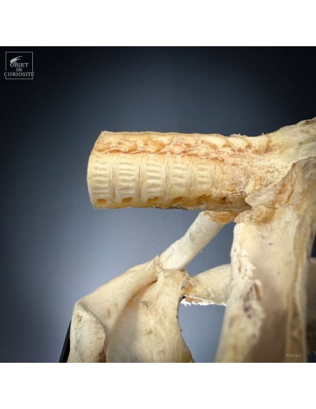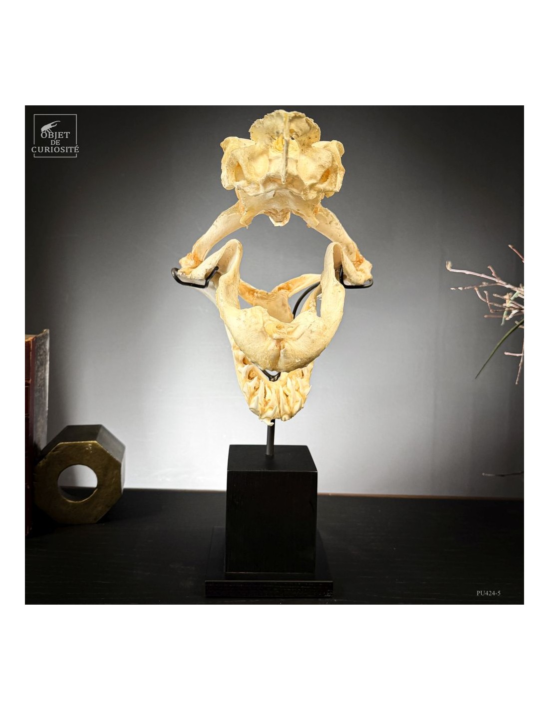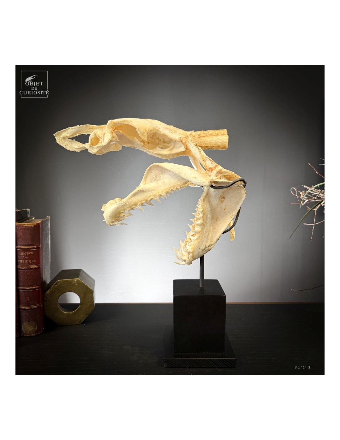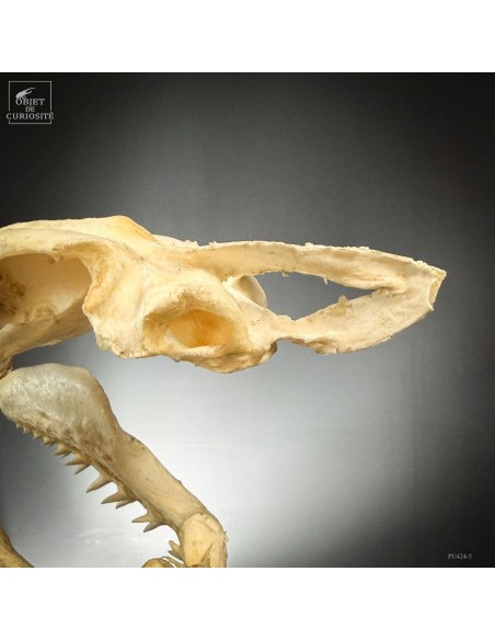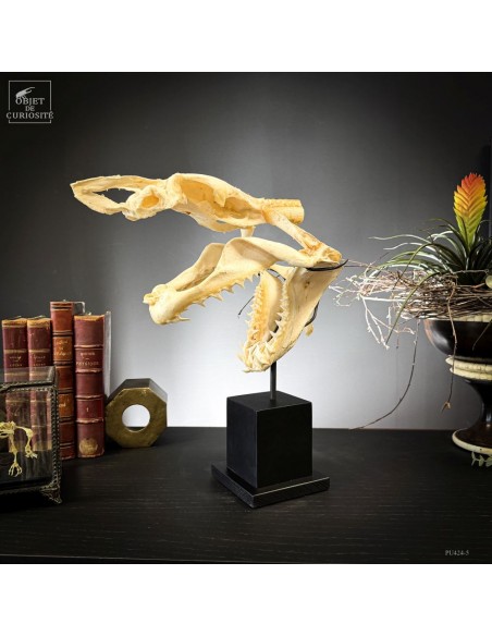 A Mako shark complete skull on black base. Amongst sharks the Mako is not the rarest species, but its shape is very typical of the image of shark mouth we all have in mind... Sharks are still over-fished for their fin. For years fishermen only kept the jaws, but this new preparation shows much more the animal shape. And this skull comes from a shark that has been catched for the fin in Plilippines islands. Protected species since 11/2023.