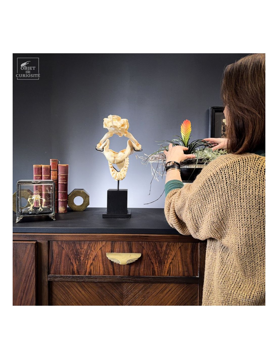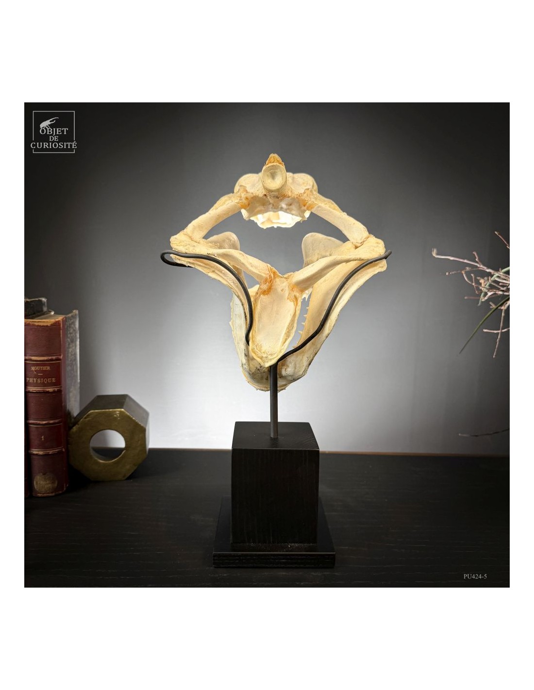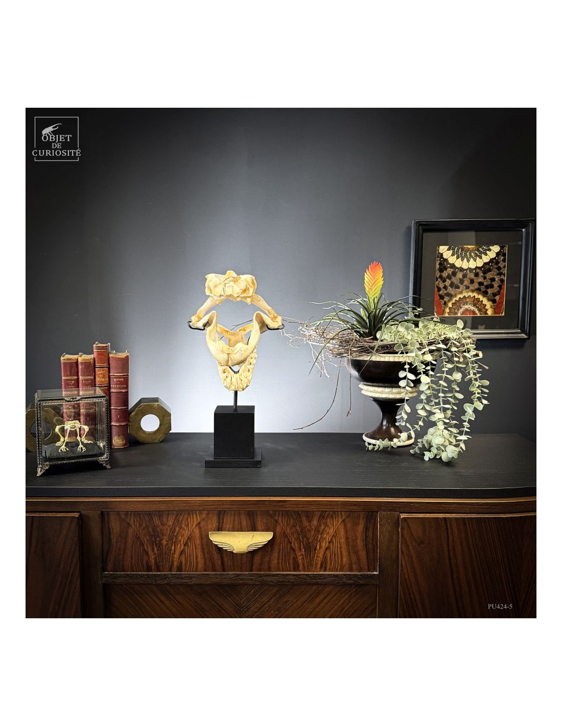 A Mako shark complete skull on black base. Amongst sharks the Mako is not the rarest species, but its shape is very typical of the image of shark mouth we all have in mind... Sharks are still over-fished for their fin. For years fishermen only kept the jaws, but this new preparation shows much more the animal shape. And this skull comes from a shark that has been catched for the fin in Plilippines islands. Protected species since 11/2023.