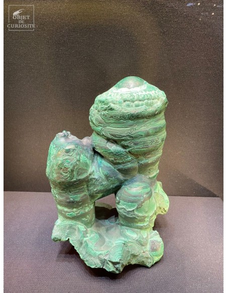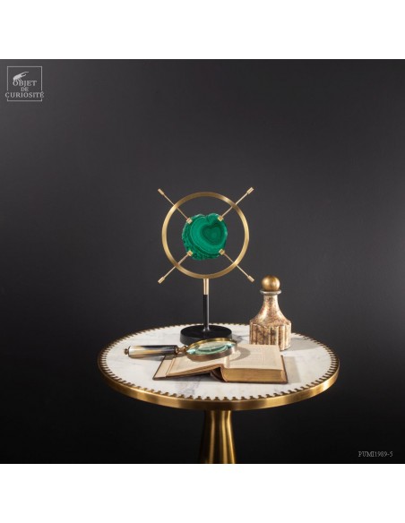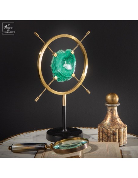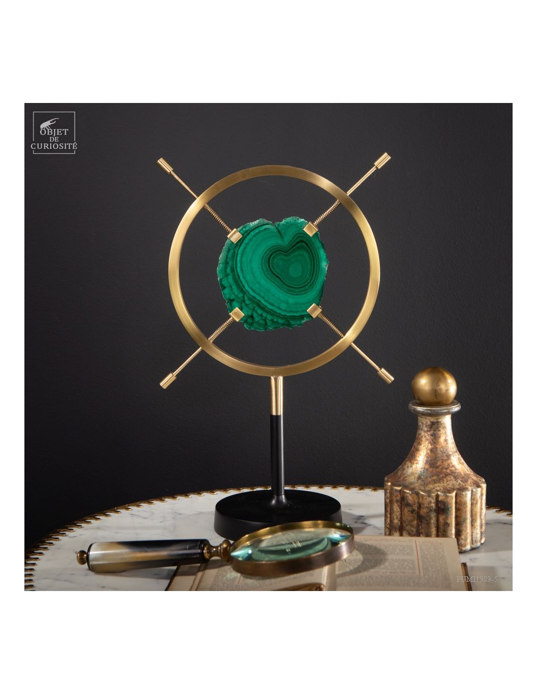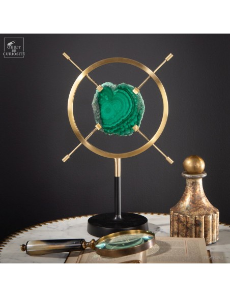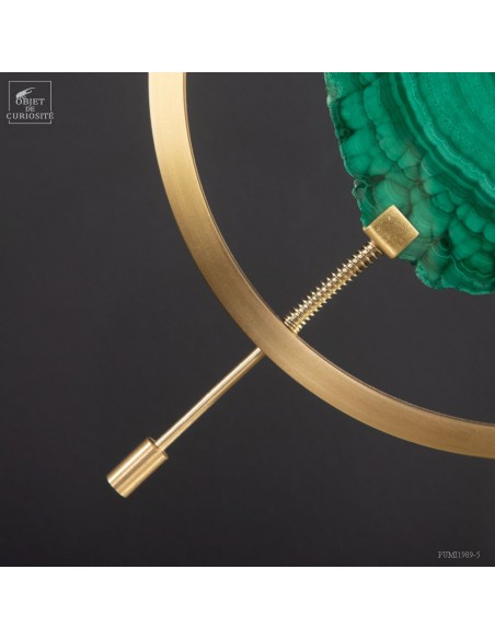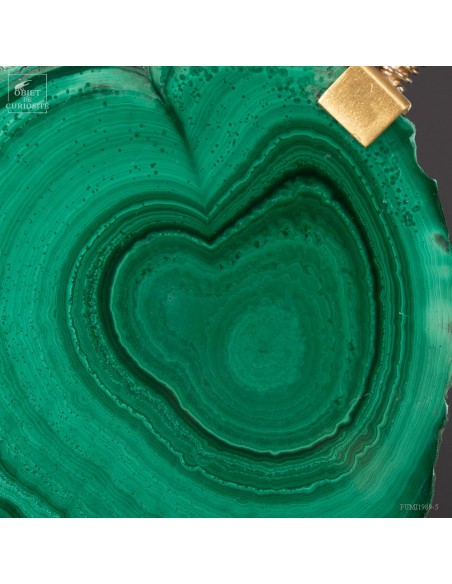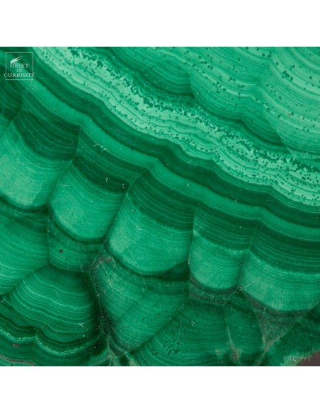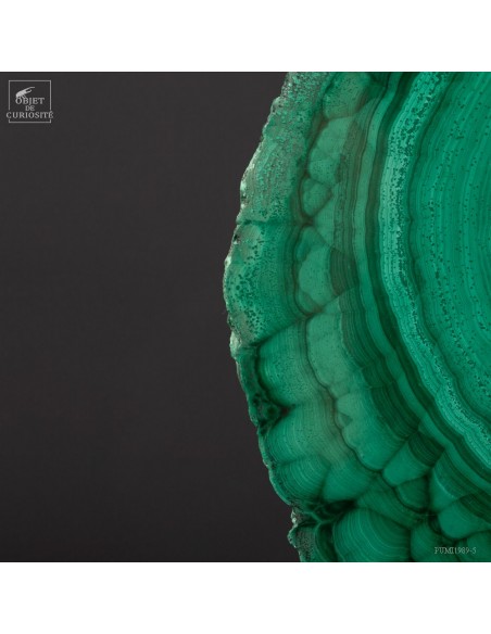 This malachite slice comes from the Congo, from Katanga province. It has been polished on one side to reveal the multitude of shades of green it contains. This natural circle comes from a stalagmite formed in a cavity, below a ceiling loaded with copper ores. Since ancient times, Malachite has been used as a pigment in the paint for its light and bright blue-green tones, especially in the painting of icons.
