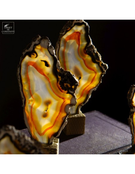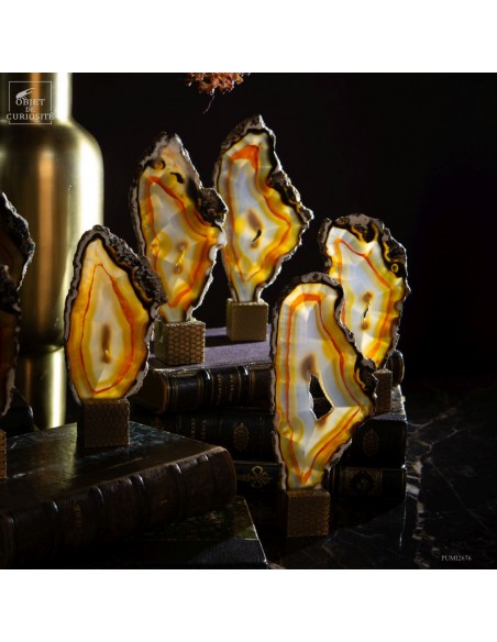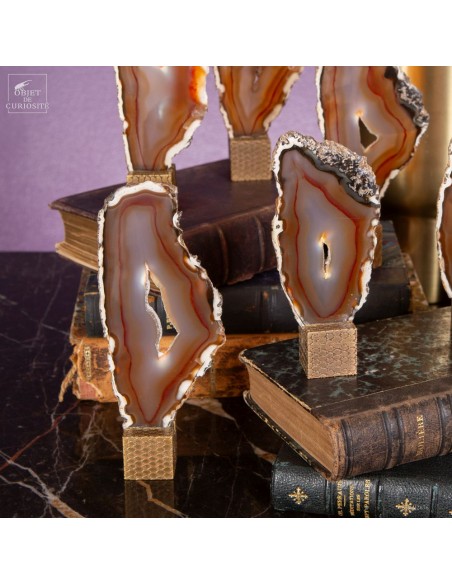 Serie of 11 golden Agate slices on brass cubic stand
