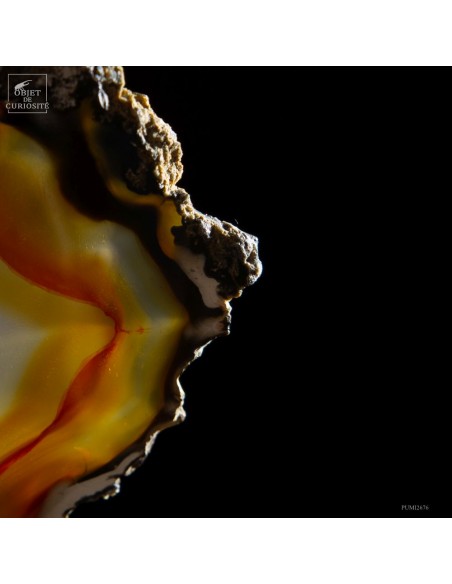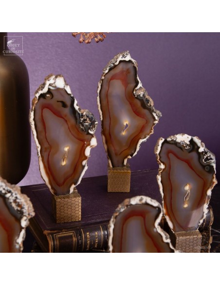 This strange sculpture is in fact an agate geode cutted in slices. Those thin slices are even more beautiful when some light comes through, like on pictures 3, 4, 5 and 6. All together, they show the original pattern as it was inside this very nice Brazilian stone.