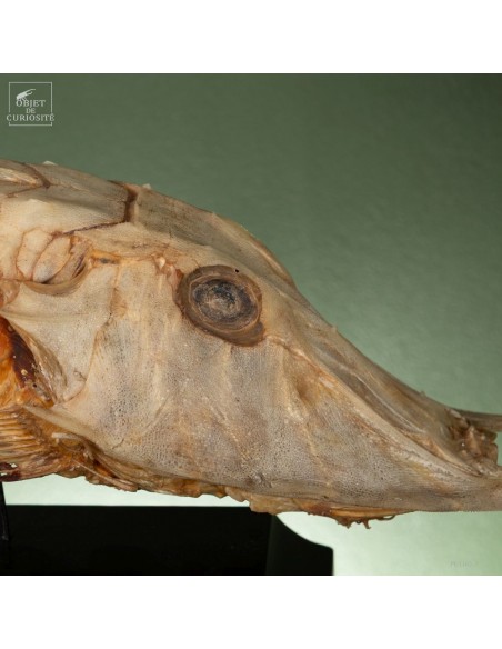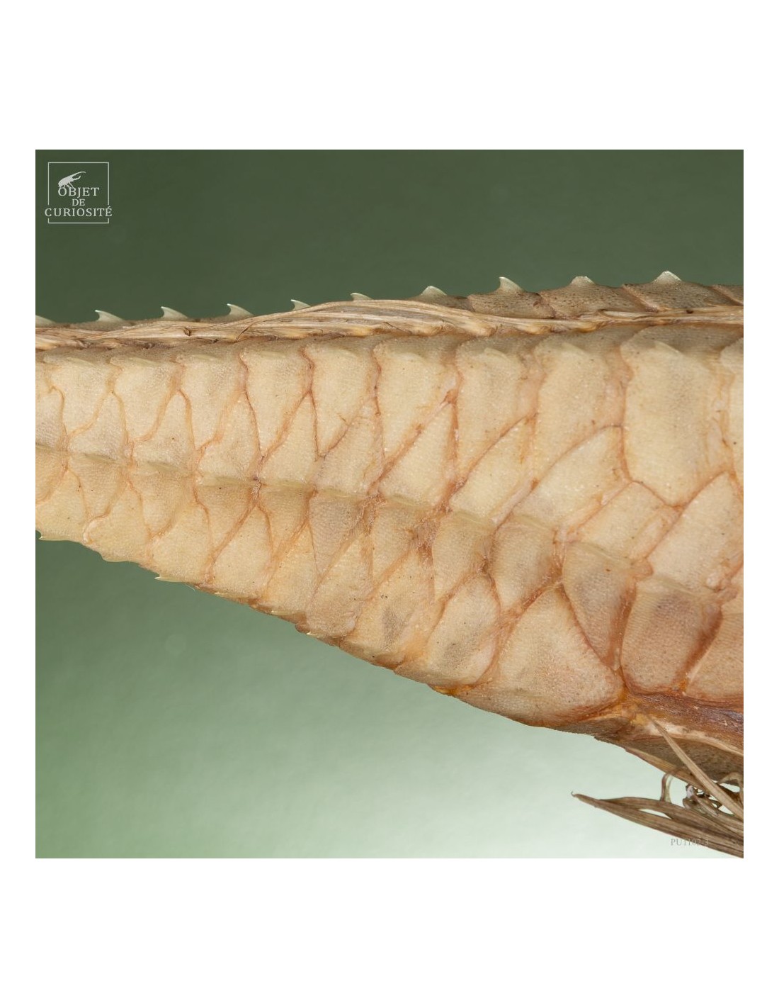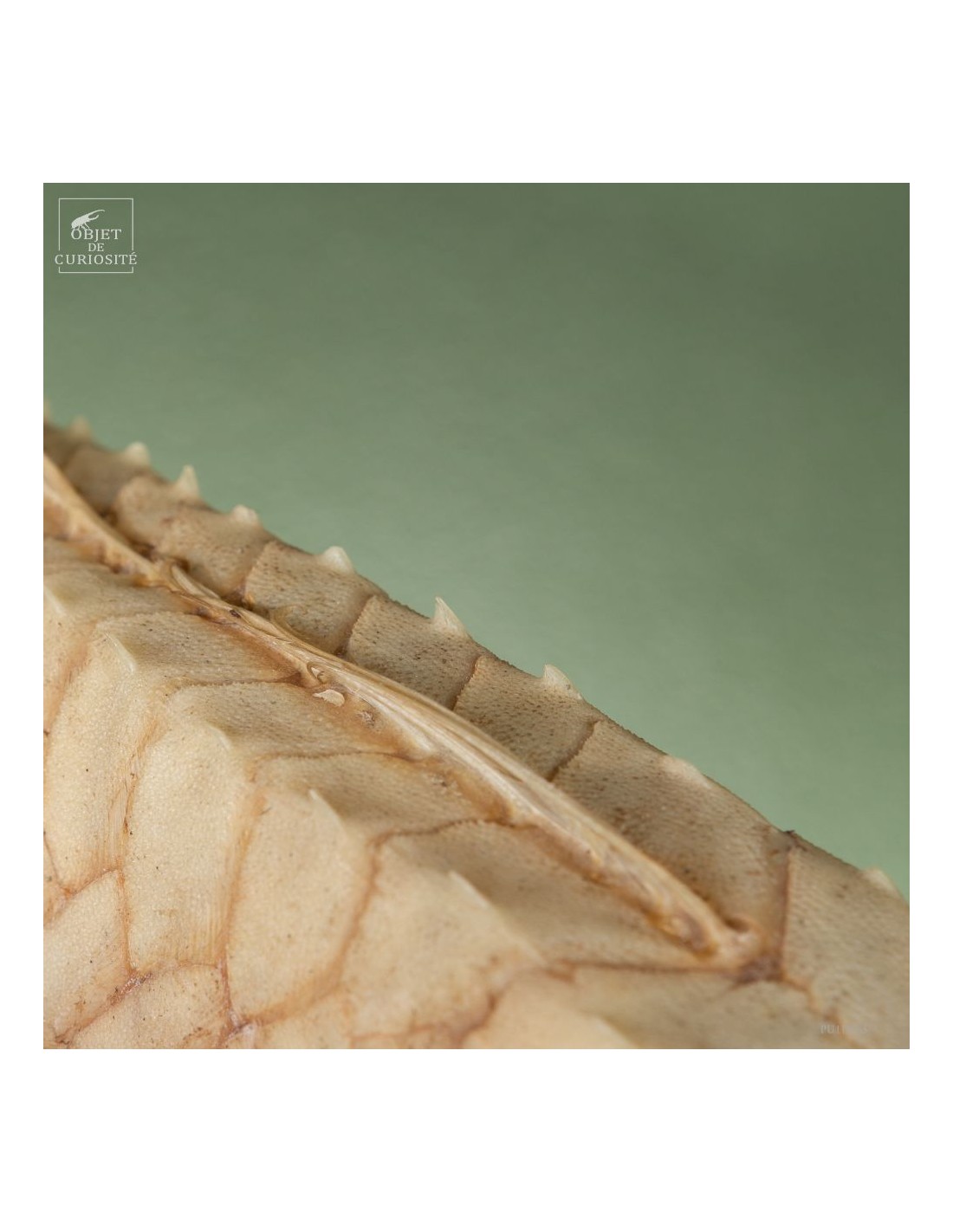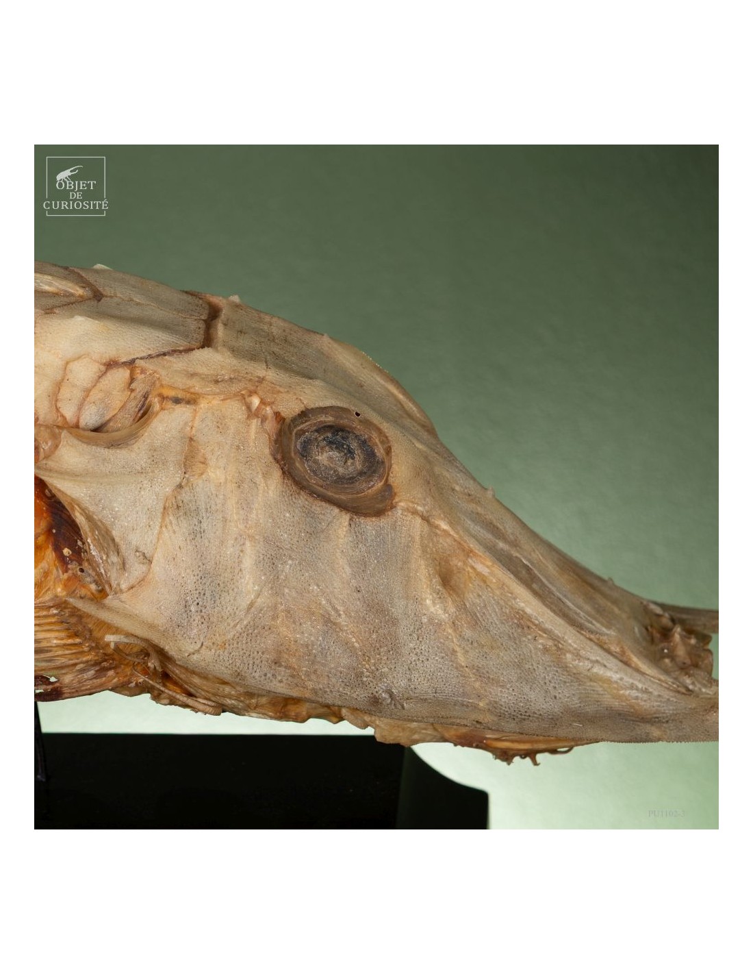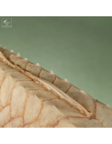 This fish is huge, looking almost like a crocodile: bony scales, eyes perched at the top of the skull: PERISTEDION sp. , the African armored searobin. At least it is larger than the bony searobins that can sometimes be found in the Mediterranean beyond 50 meters deep. It comes from the Philippines, and should therefore be a Peristedion orientale, but it was determined that their maximum size was 40cm, and this one exceeds 50cm. So would that be a record? That’s how far we are in our research.