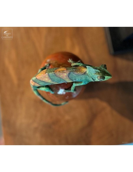 The chameleon is displayed on a petrified wood sphere from Madagascar — an unexpected pairing between a reptile frozen in motion and ancient wood turned to stone over millions of years.