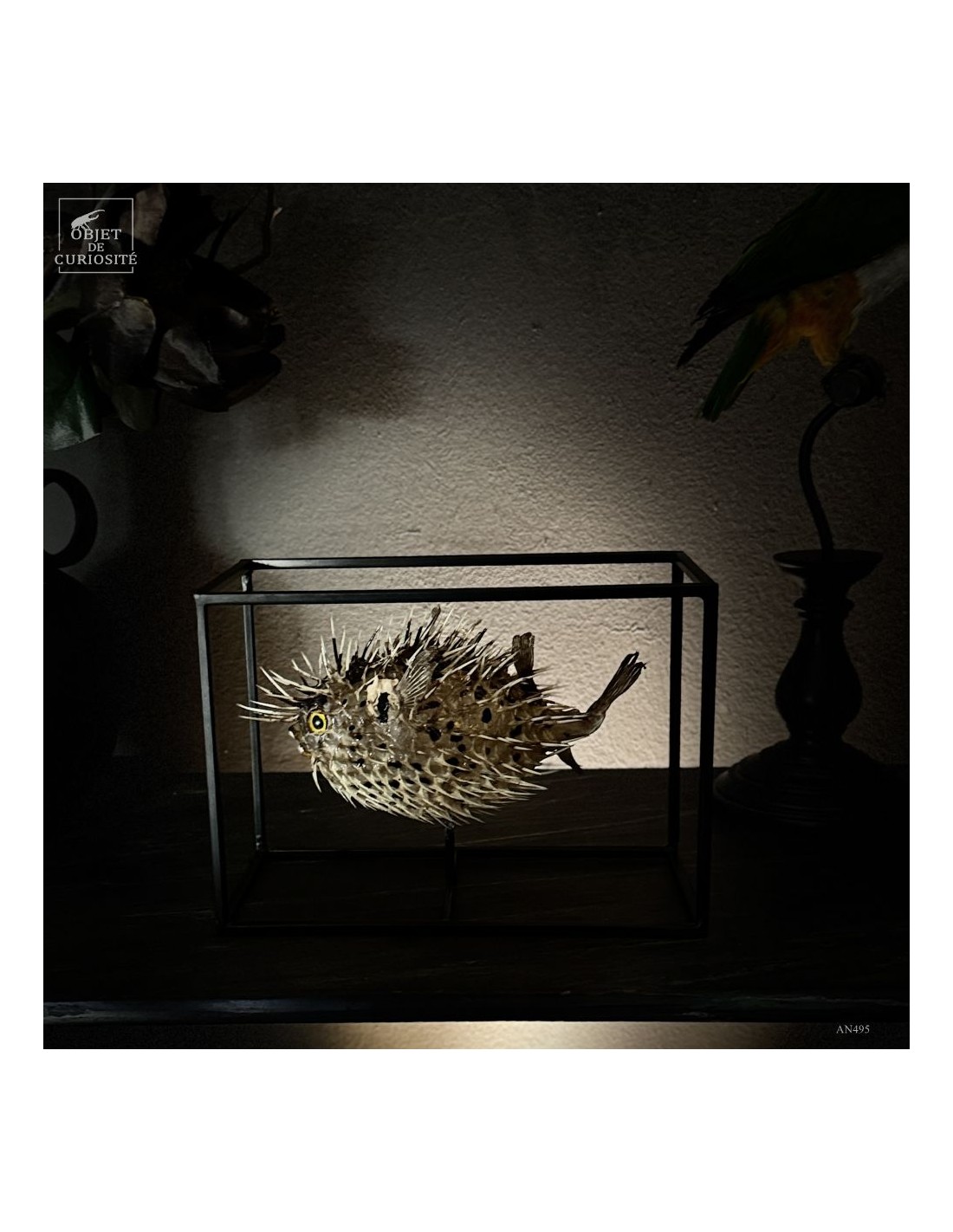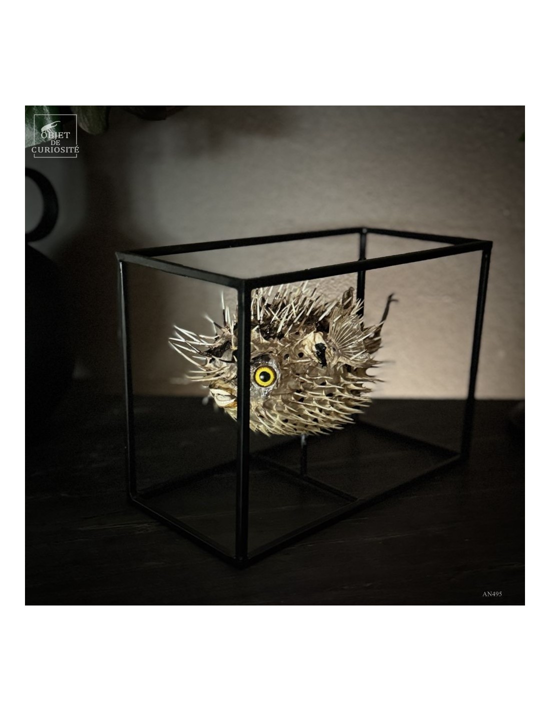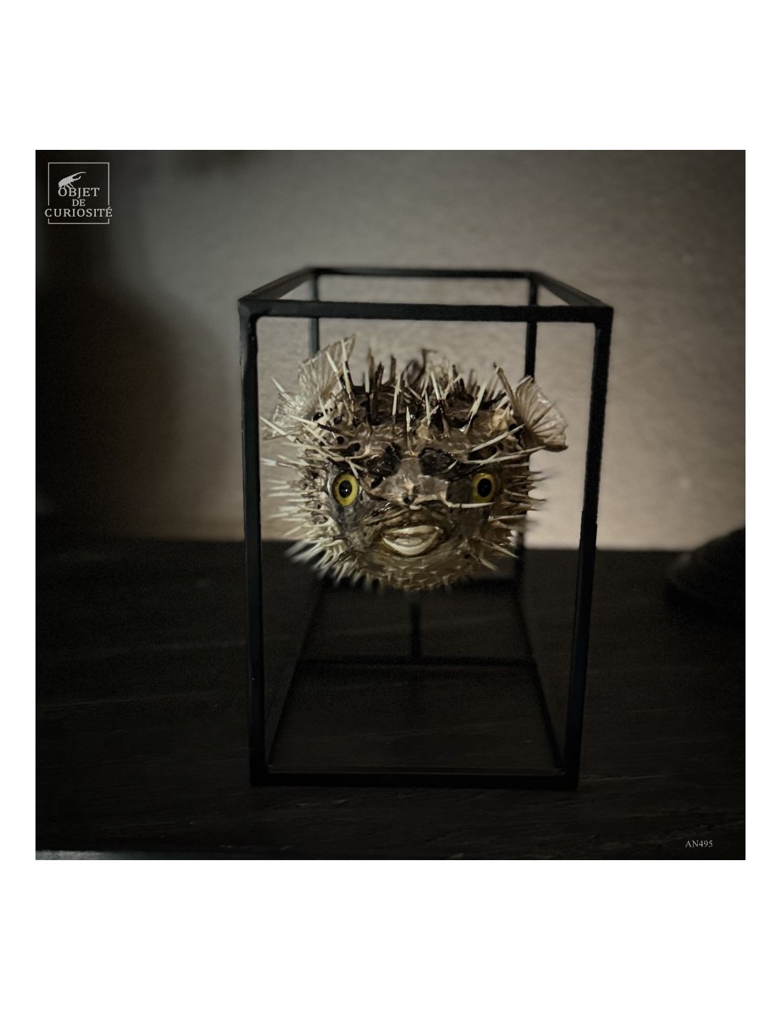 Once dried, its body preserves this striking shape, frozen in a moment of defense. Displayed within a metal cage, it seems to hover somewhere between nature and artifice.