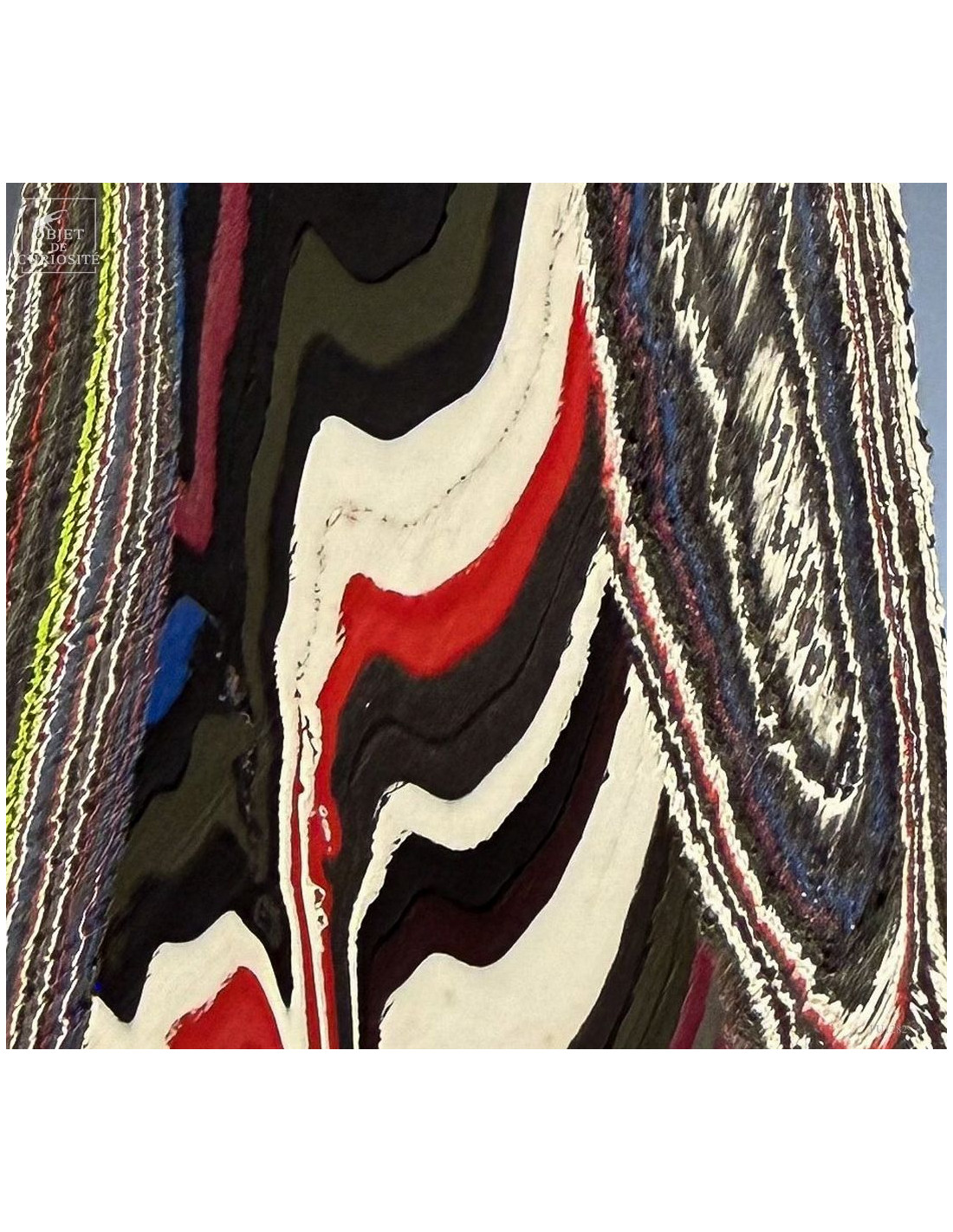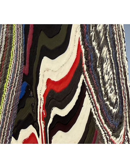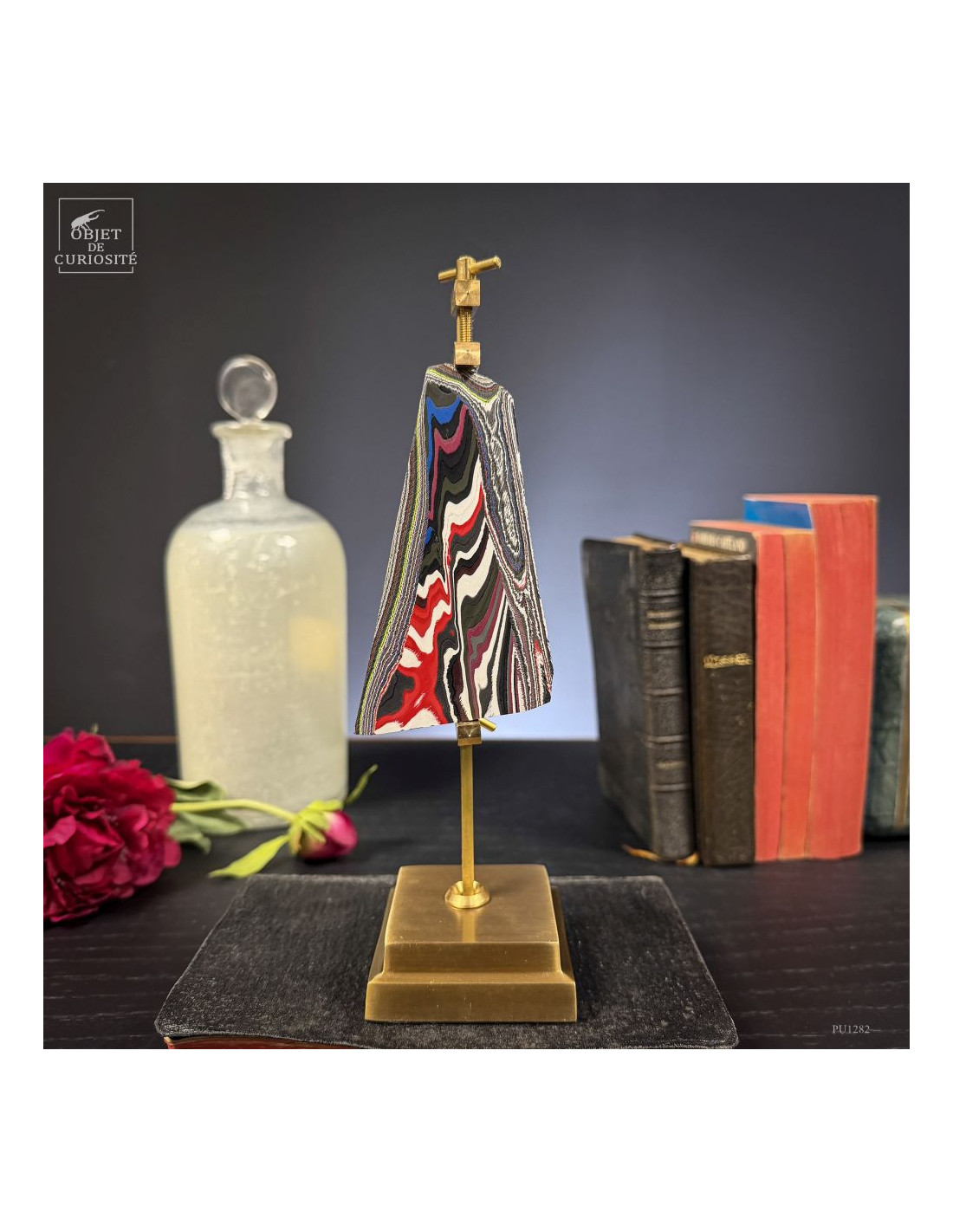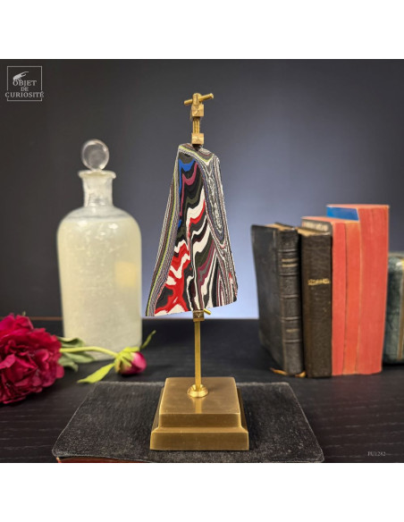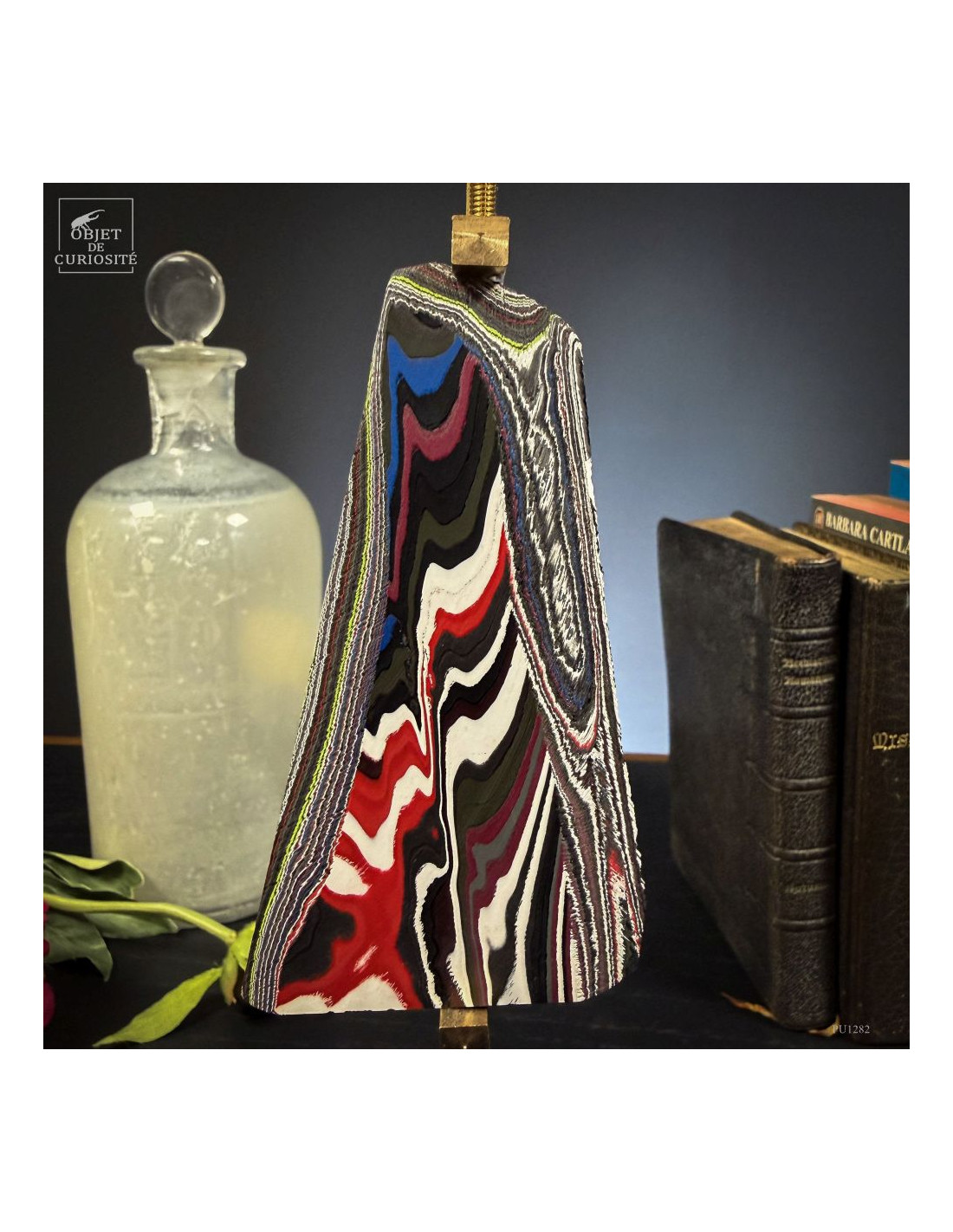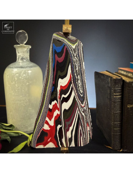 Jeepite is not a rockl. But it’s a real curiosity. And beautiful too! The story: on the manufacturing lines of the Jeep Wrangler in Ohio, USA, the carcasses are painted on a cart that then goes through an oven. Since the car body paints are fired at 70 degrees celsius. And the same cart will again go to the oven with another car, perhaps of a different color, and so on for weeks. After several months, the cart is finally cleaned because hundreds of cars have received a color. This part therefore comes from a pipe or from the back of the cart: overspray of paint. By working it asymmetrically, we bring out all these colors.