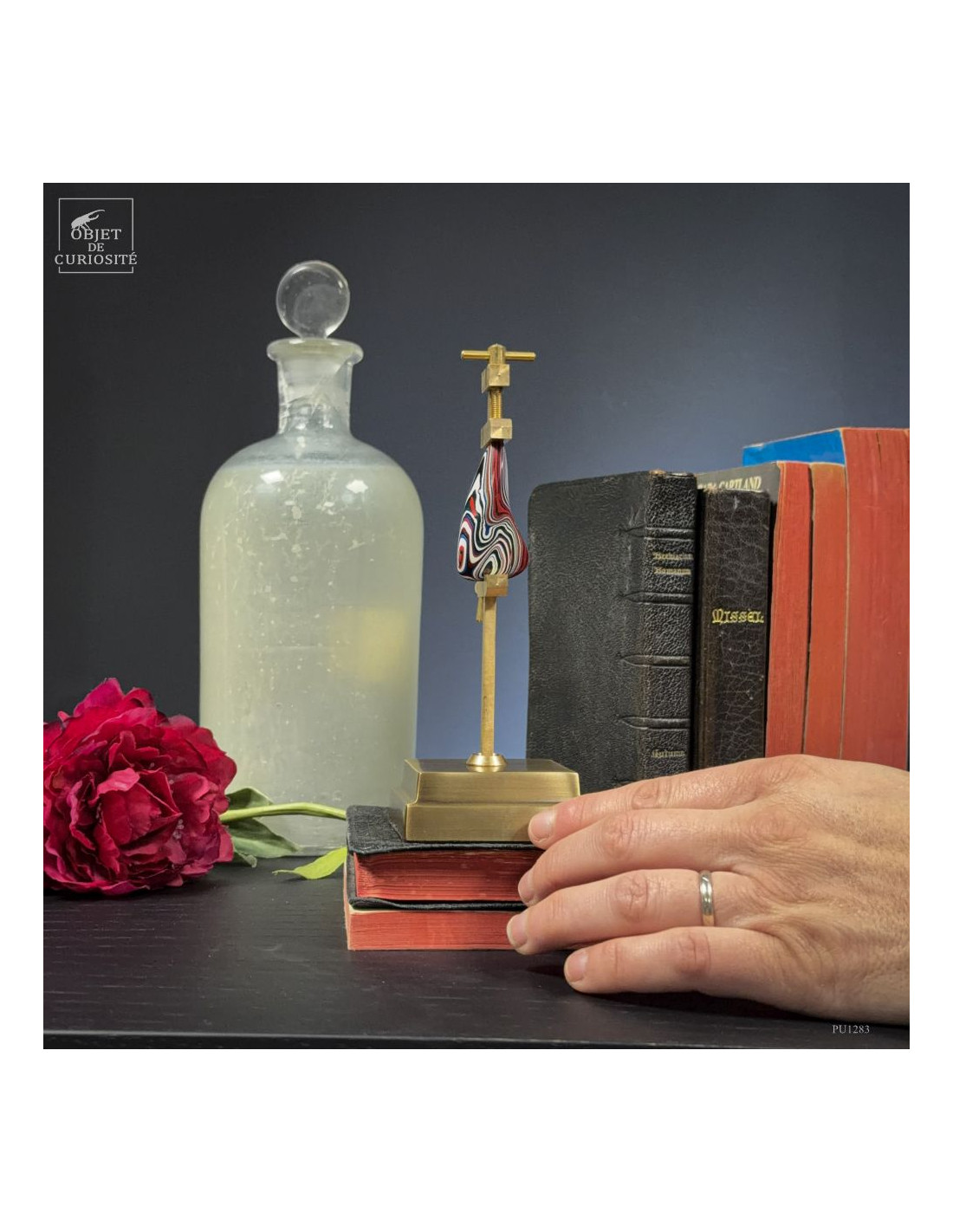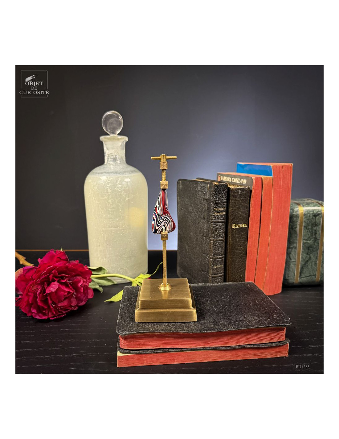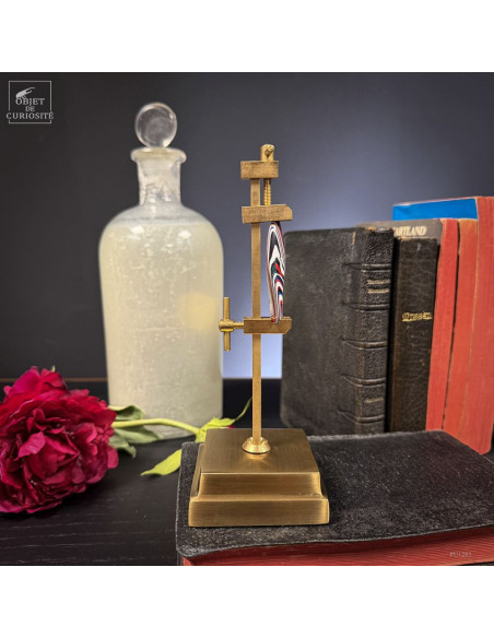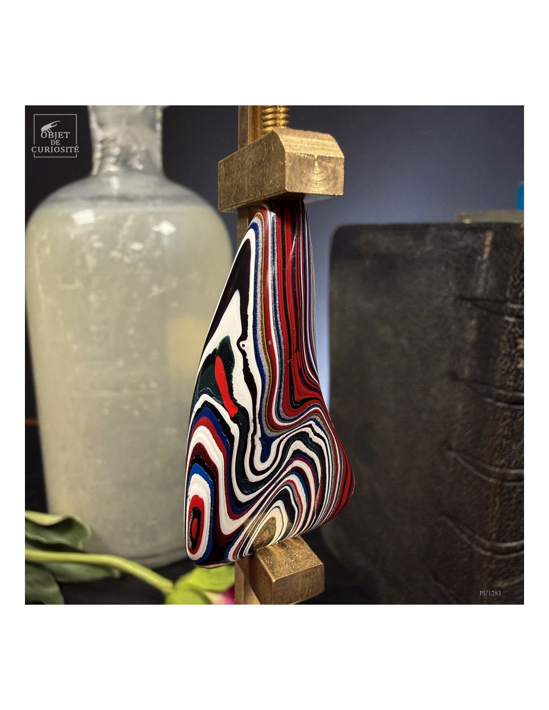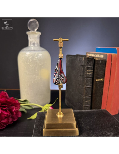 Fordite is not a rockl. But it’s a real curiosity. And beautiful too! The story: on the manufacturing lines of the Ford Explorer in Chicago, USA, the carcasses are painted on a cart that then goes through an oven. Since the car body paints are fired at 70 degrees celsius. And the same cart will again go to the oven with another car, perhaps of a different color, and so on for years. After several weeks, the cart is finally cleaned because hundreds of cars have received a layer of color. This part therefore comes from a pipe on the side of the cart: overspray of paint. By working it asymmetrically, we bring out all these colors.