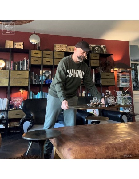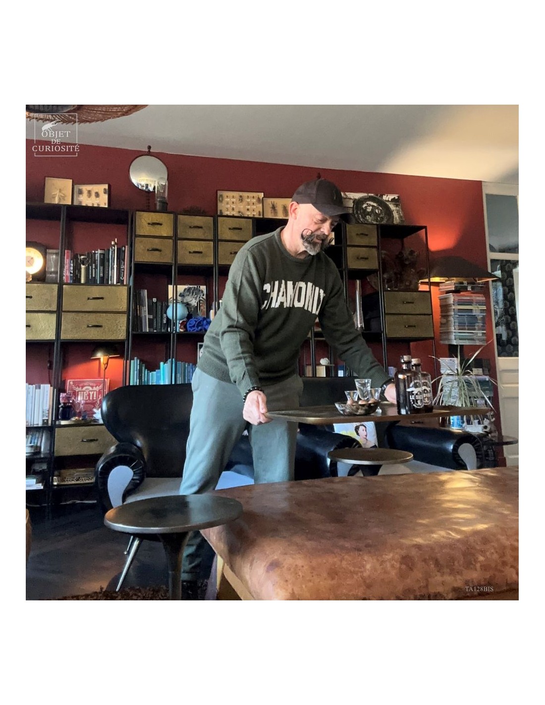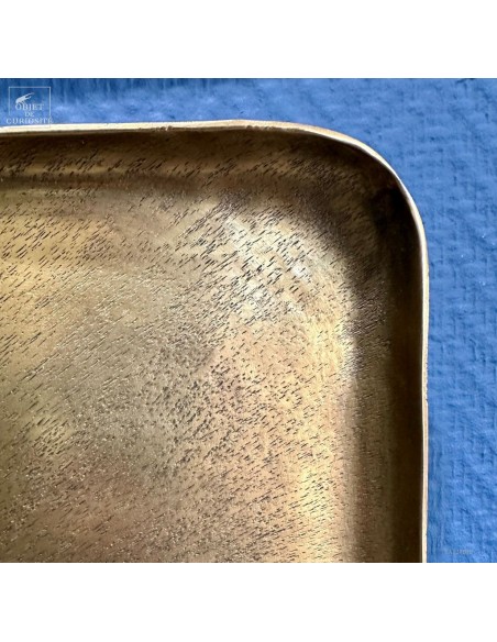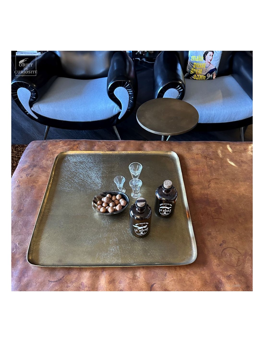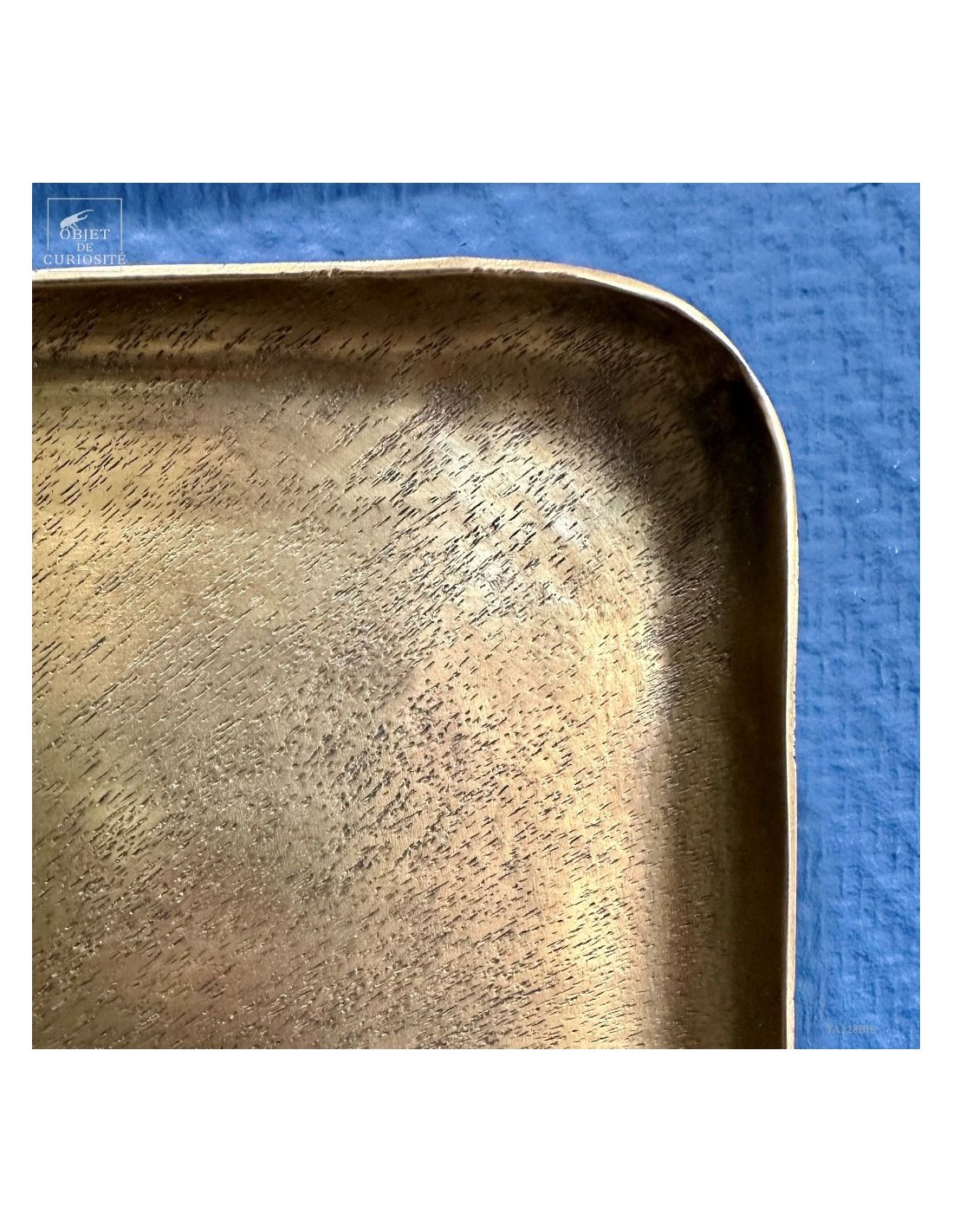 First and foremostl, it is a coffee table decor. This very large tray is made of aluminum, for lightness, with a satin brass plating. This square tray with slightly raised edges, measuring 61cm X 61cm showcases this patinated brass texture. Not a shiny brass, but a refined material.