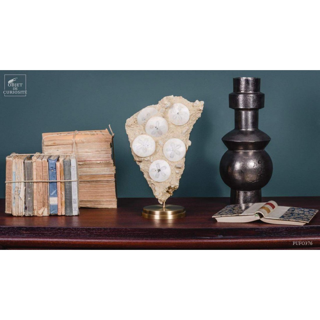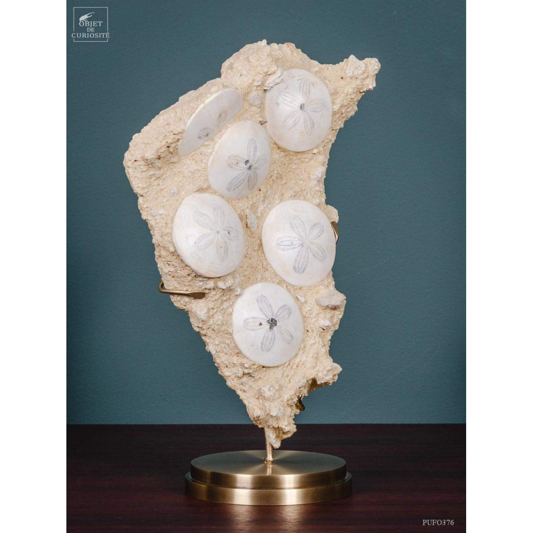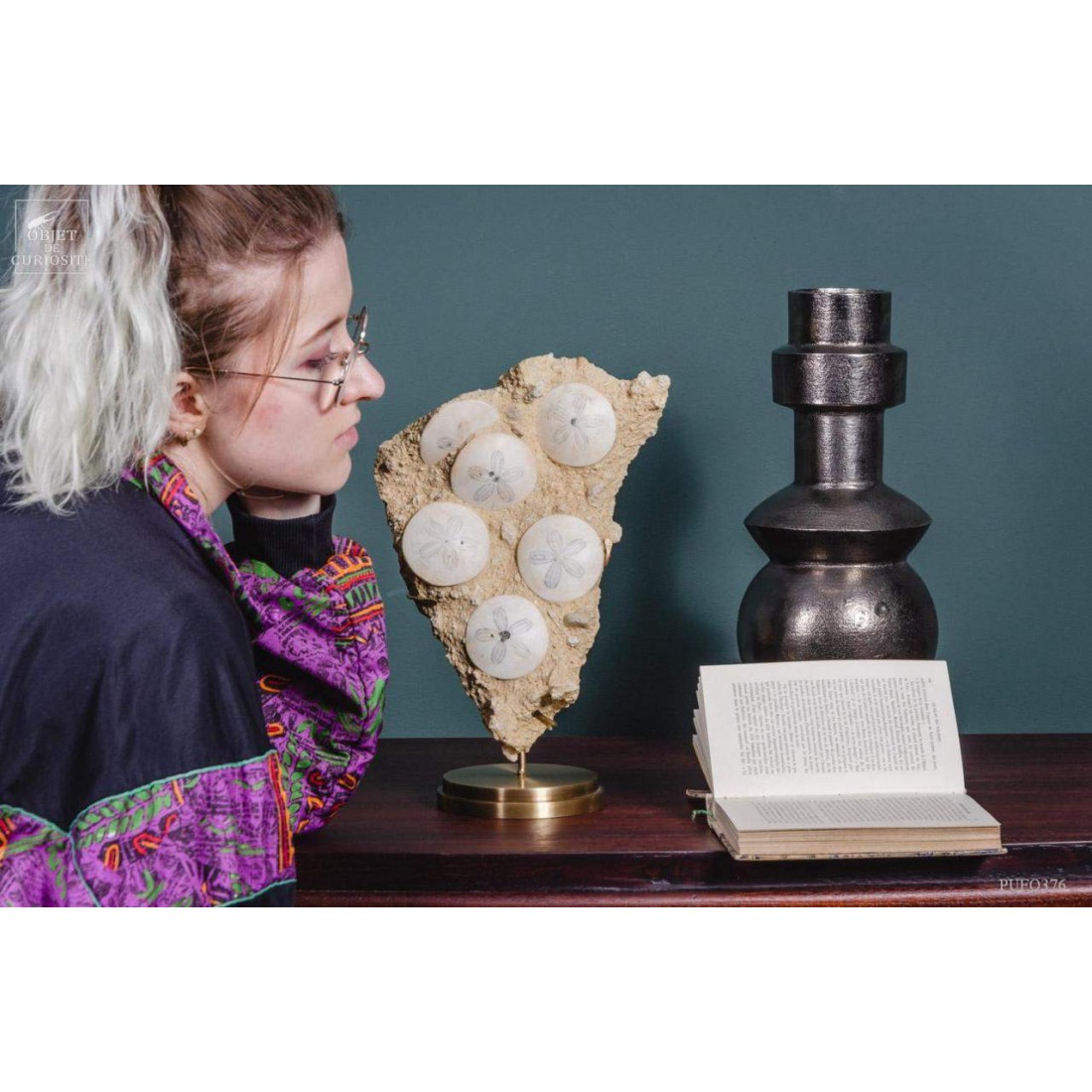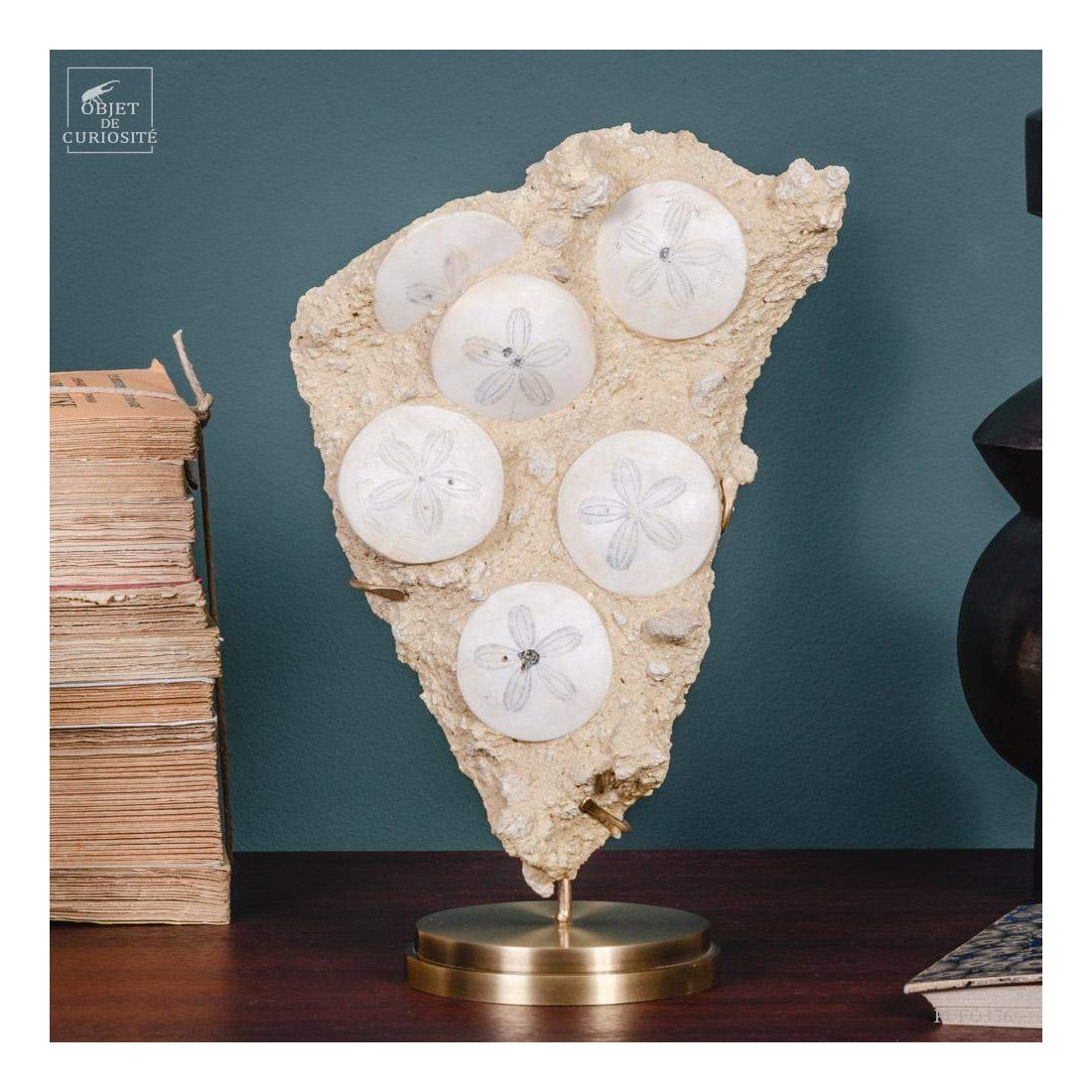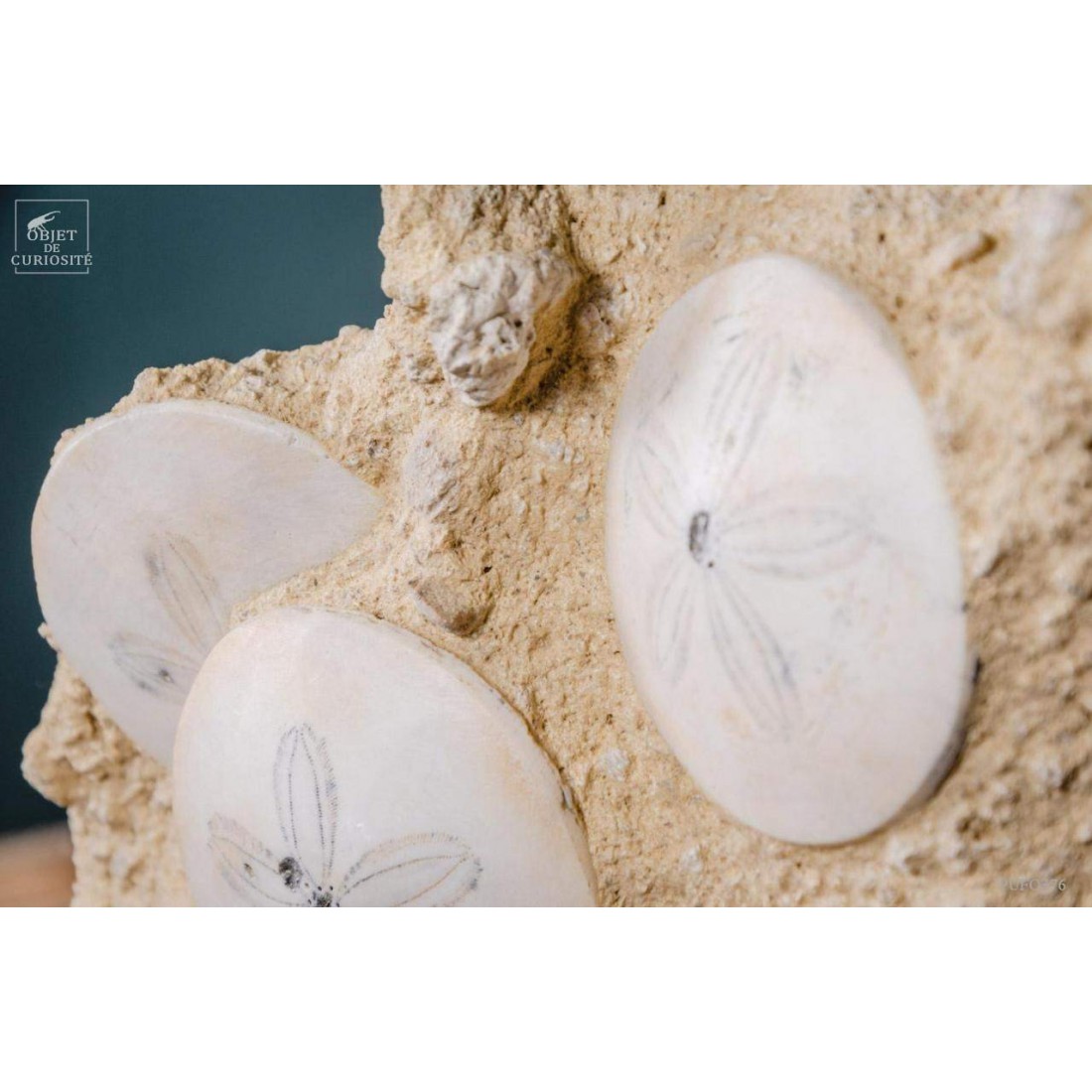 This stone is a real picture of what used to be a seabed at the miocene period (-24 to -14 million years ago). And it was discovered in France. These flat sea urchins fossil were rather common at this time. Their scientific name is Scutella Faujasi, they are the ancesters of the actual sand dollars