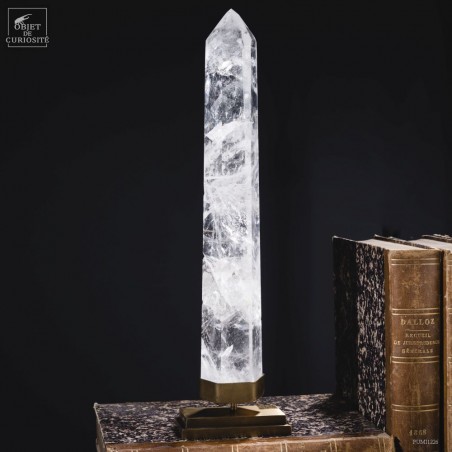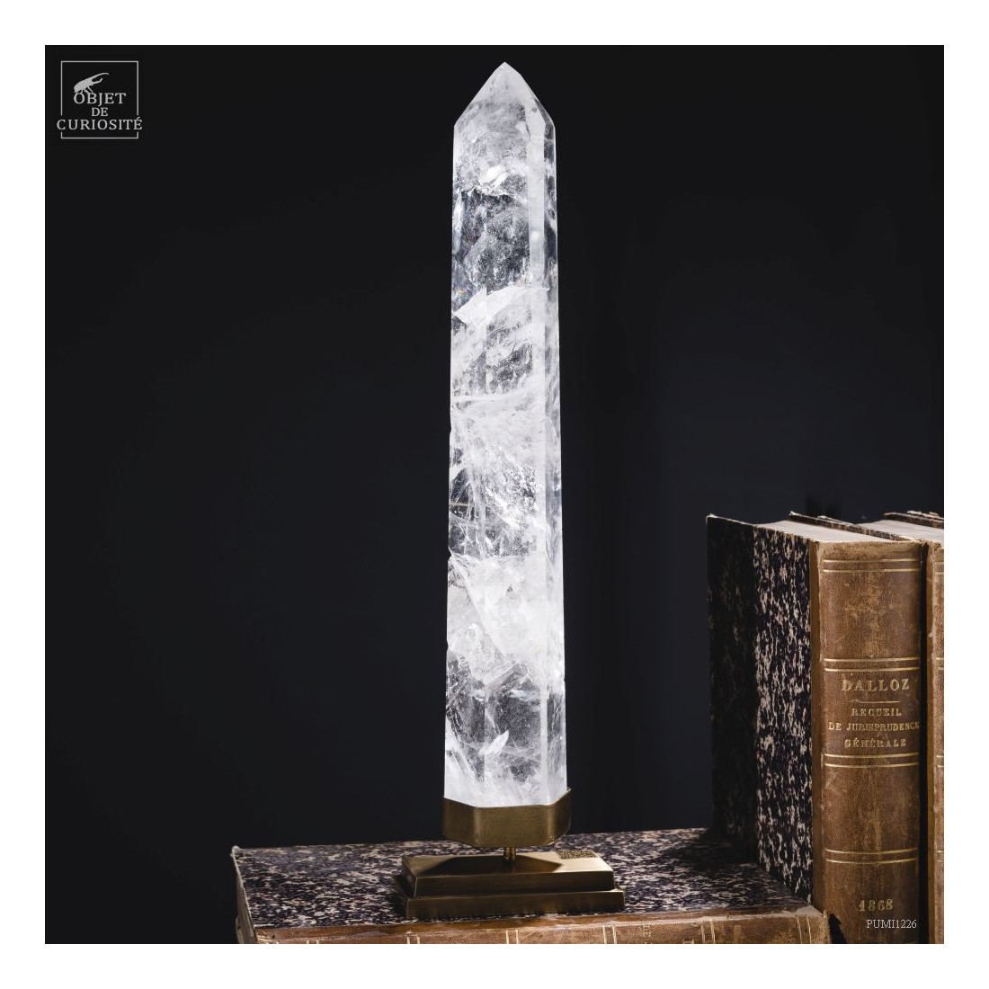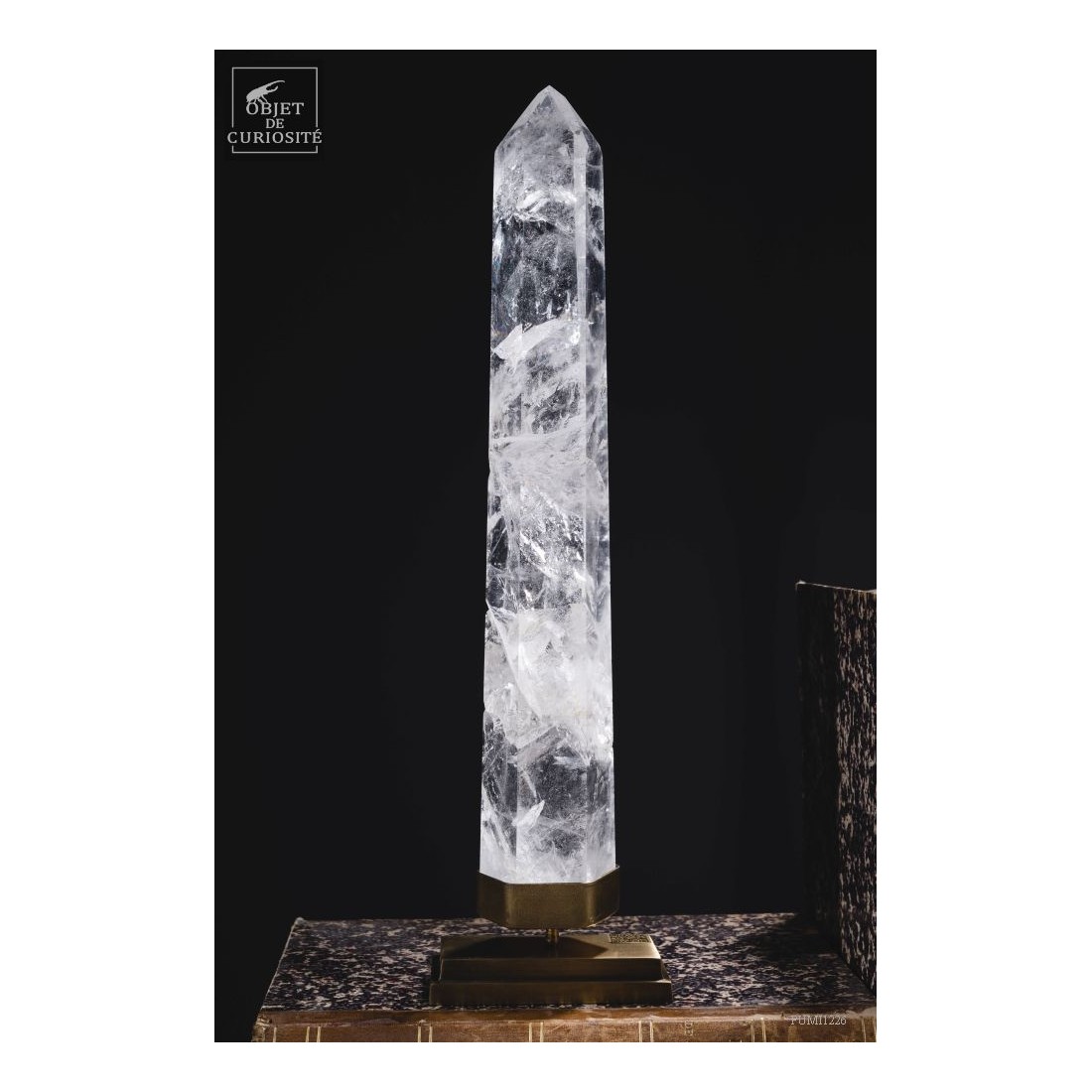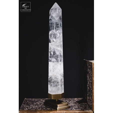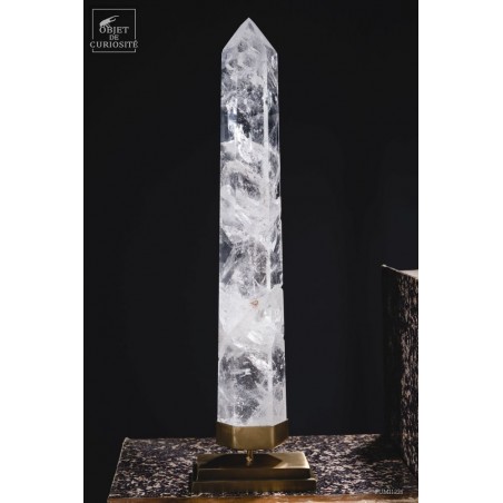 This crystal point on antic brass base is coming from Brazil. It seems like a drop of milk in water, but in fact it is an extra clear crystal with mysterious veils of haze inside. These white movements inside are due to an un-perfect mix of minerals in the solution that made this crystal, (silicon dioxide, selenite, antimonite) millions of years ago. But it is remarkably clear: just a dash of milk.