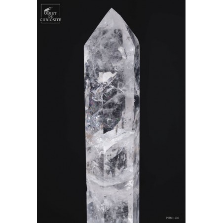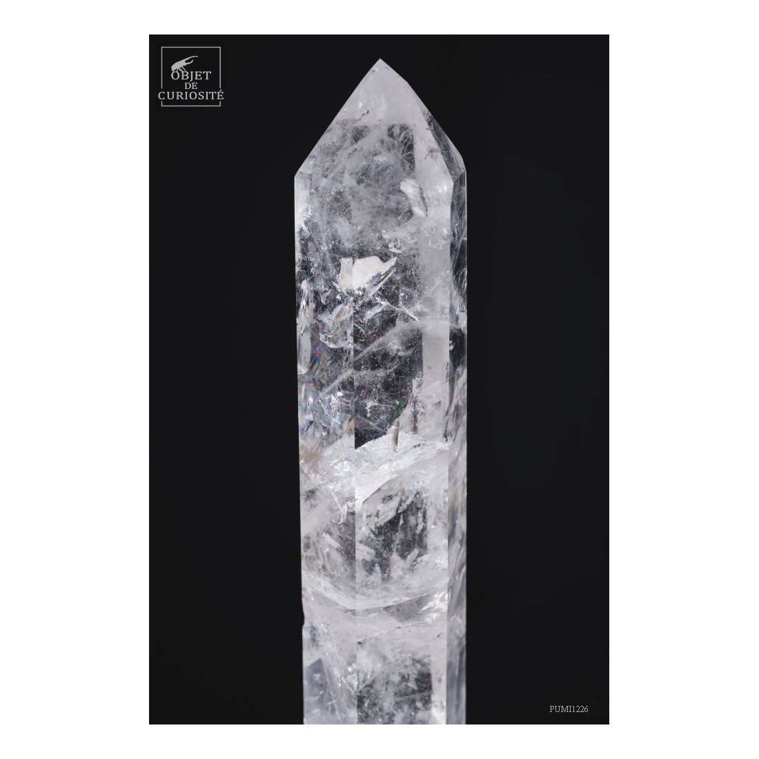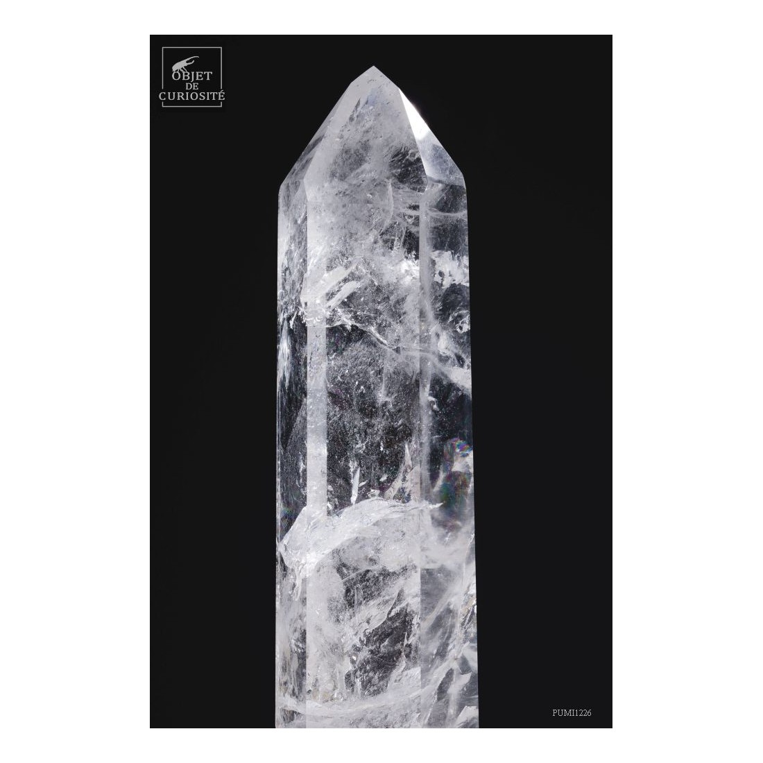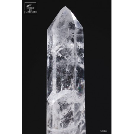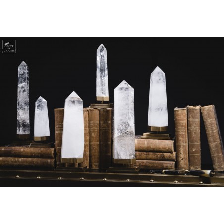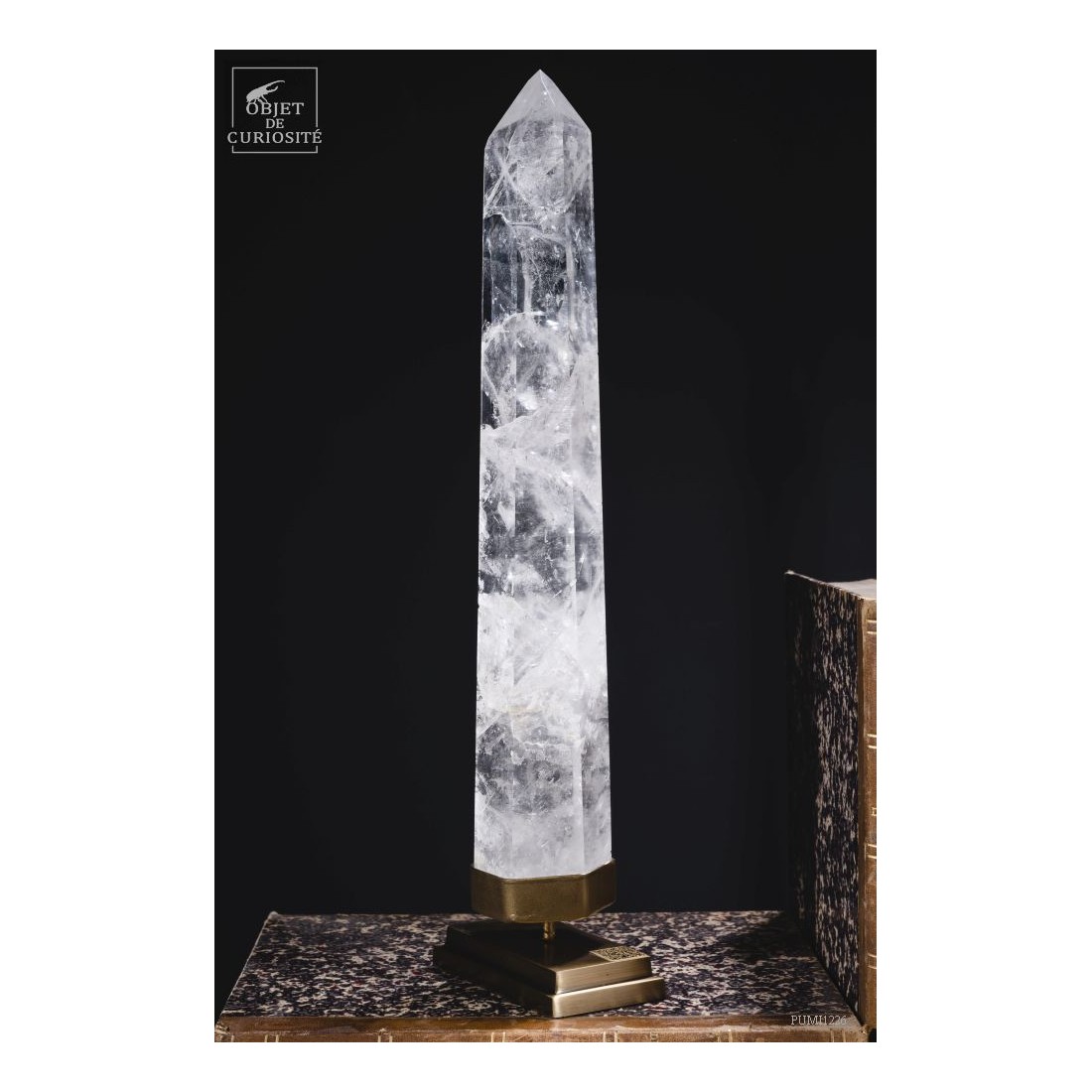 This crystal point on antic brass base is coming from Brazil. It seems like a drop of milk in water, but in fact it is an extra clear crystal with mysterious veils of haze inside. These white movements inside are due to an un-perfect mix of minerals in the solution that made this crystal, (silicon dioxide, selenite, antimonite) millions of years ago. But it is remarkably clear: just a dash of milk.