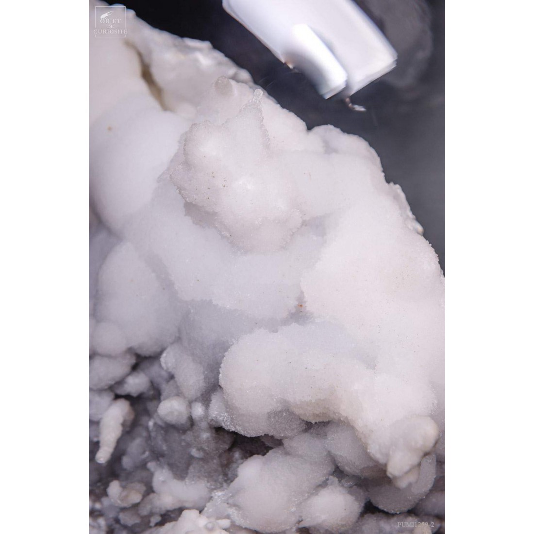 The Salsigne Mine in the South West of France is a former open pit gold mine who closed since 2004. It has been the largest mine of Europe It produced over the years some large and dramaticly crystallised Aragonite specimens. The rounded nodules of this piece represent the early stage of the formation of the Aragonite. Each white sphere is fully crystalized with very thin clear crystals that give that luster. Some pieces lately took a coralloidal shape, with branches similar to corals.