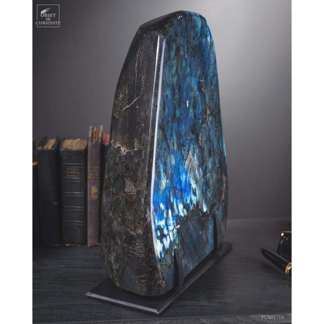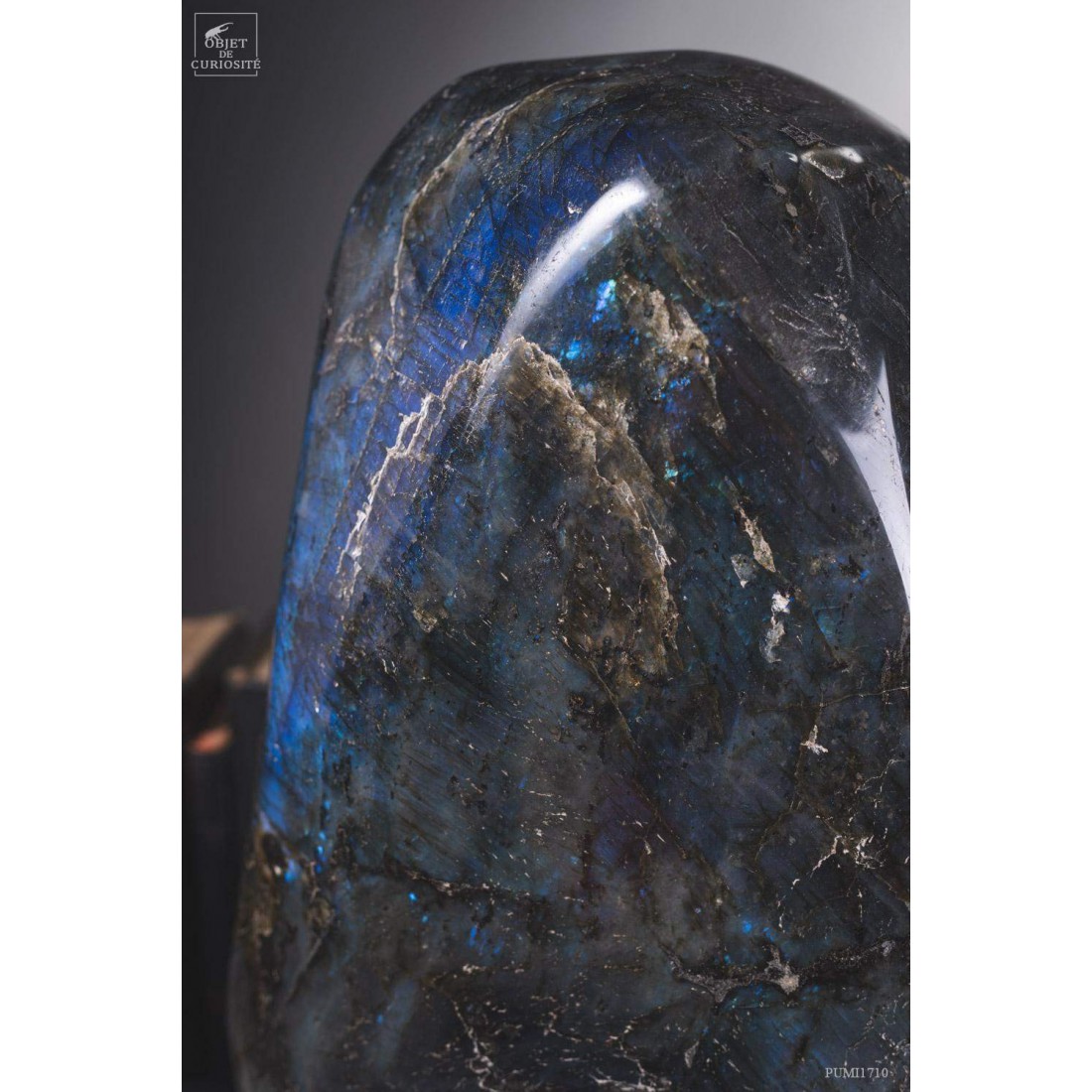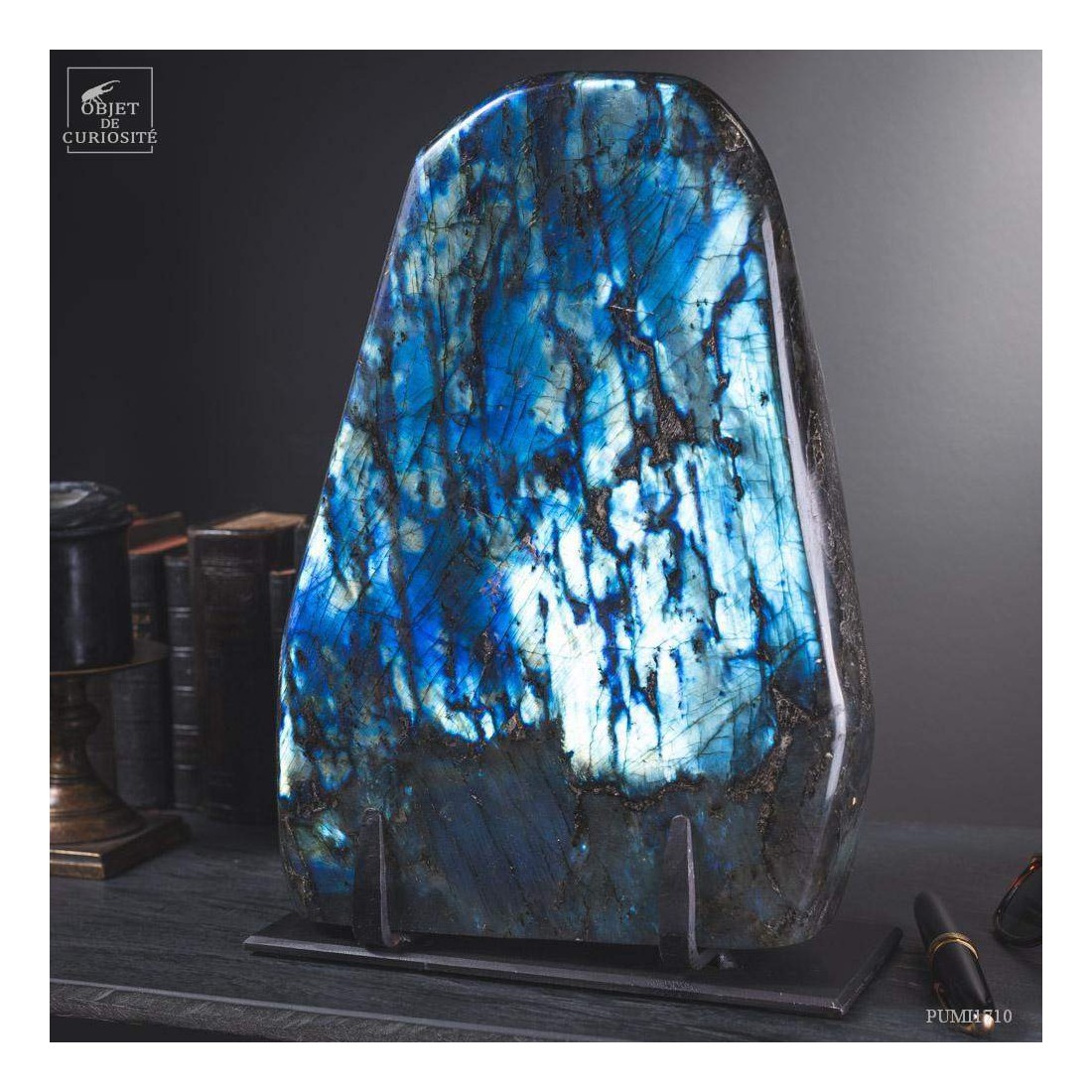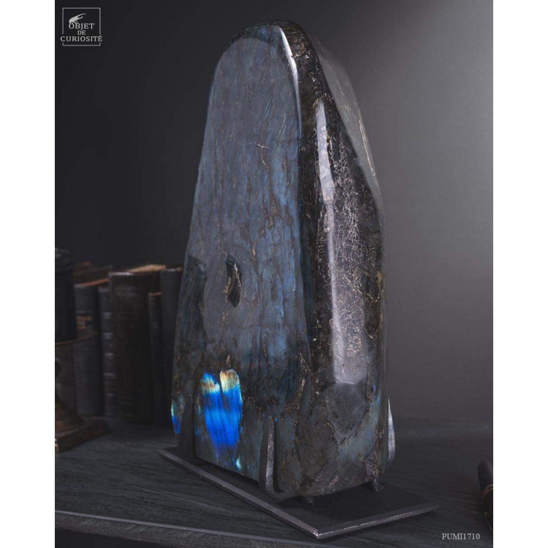 This Madagascar stone has incredible metallic hues, ranging from dark blue to sky blue, depending on the angle in which it is viewed. This massive piece is fully polished, and you just can't help from carressing it. This mineral is often sought after for its protective virtues... And definitely for its attractive power!