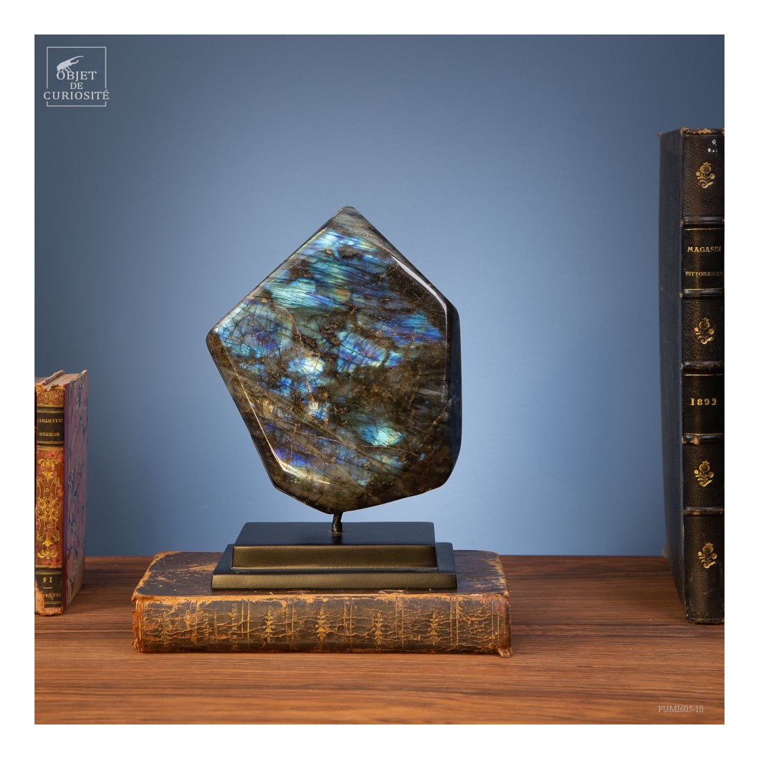 Labradorite of Madagascar. This stone shows metal reflections going from blue, green to gilded yellow according to where from you looks at it.This one has a deep blue crystal covering it completely. This kind of stone is much looked after for its protecting effects. And of course for its eye-catching power!