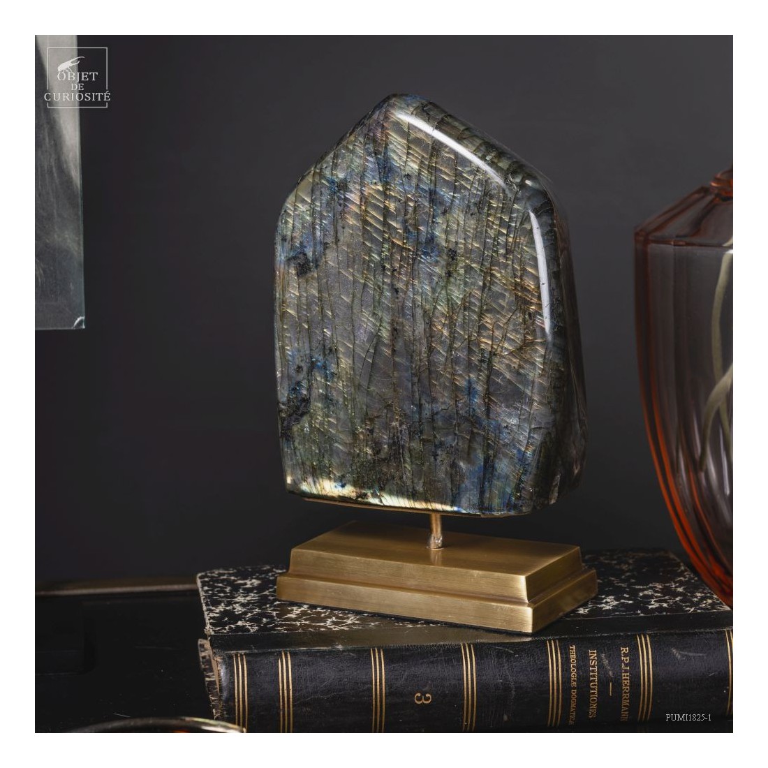 Labradorite of Madagascar with 4 polished sides. This stone has a rather remarkable pattern: large golden crystals with metallic reflections separated by dark blue "streams" . Depending on the angle in which you look at it. This mineral is often sought after for its protective virtues. But this one will surely be chosen for its rare aesthetics.