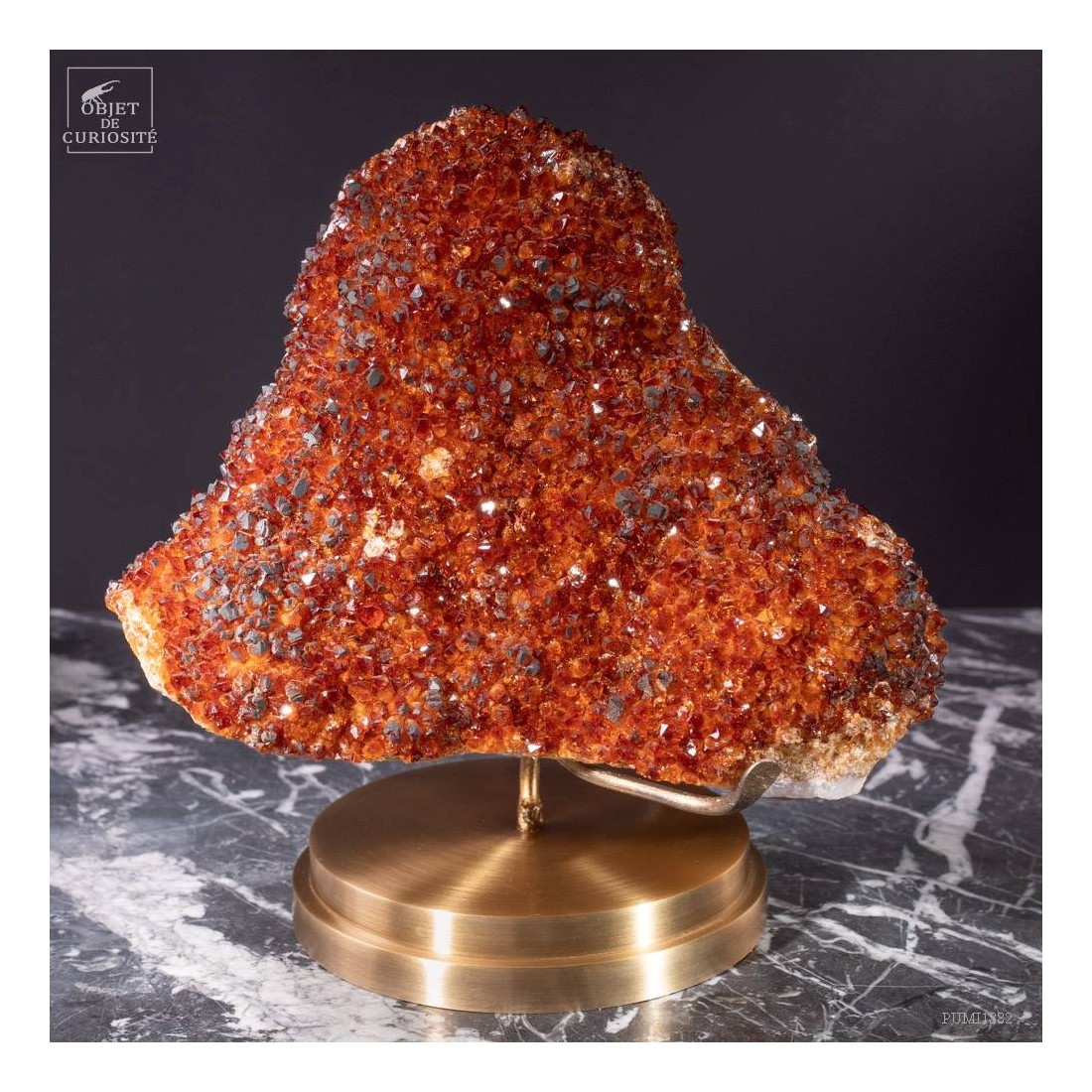 A "kidney" is not necessarily a very elegant name to define this group of crystals in the shape of a rounded mound. In any case, it is in Uruguay that these crystals of Citrine were born. In a pocket of air frozen in the cooling lava, infiltrations of water charged, among others of iron ores, in the form of ultramicroscopic particles of ferric hydroxides, and under the action of heat, they crystallized very well distributed inside the crystal. It took high temperatures (about 550 degrees) to achieve this result. A natural irradiation pushed this citrine to these tones of amber, more orange.
