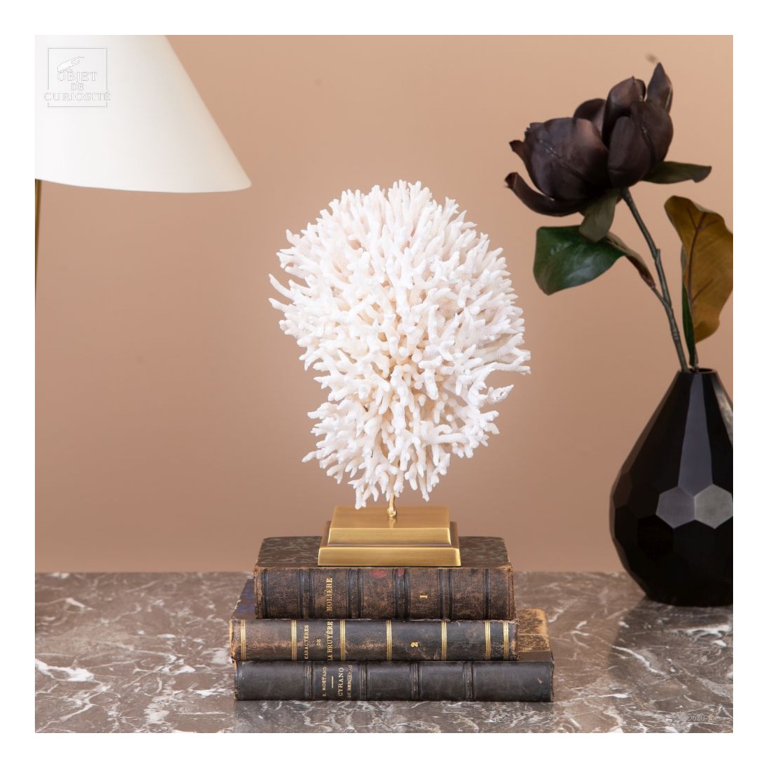 White nest coral on a brass base. This coral comes from the Salomon islands and is made of hundreds of small branches. Its scientific name: Seriatopora Hystrix. Under the water, the tiips remains white, but all the rest is showing a strong pink ( or yellow on some sub-species). This coral is delivered with its own CITES number (Convention of Washington on endangered species) authorising you to hold, exhibit and sell it.