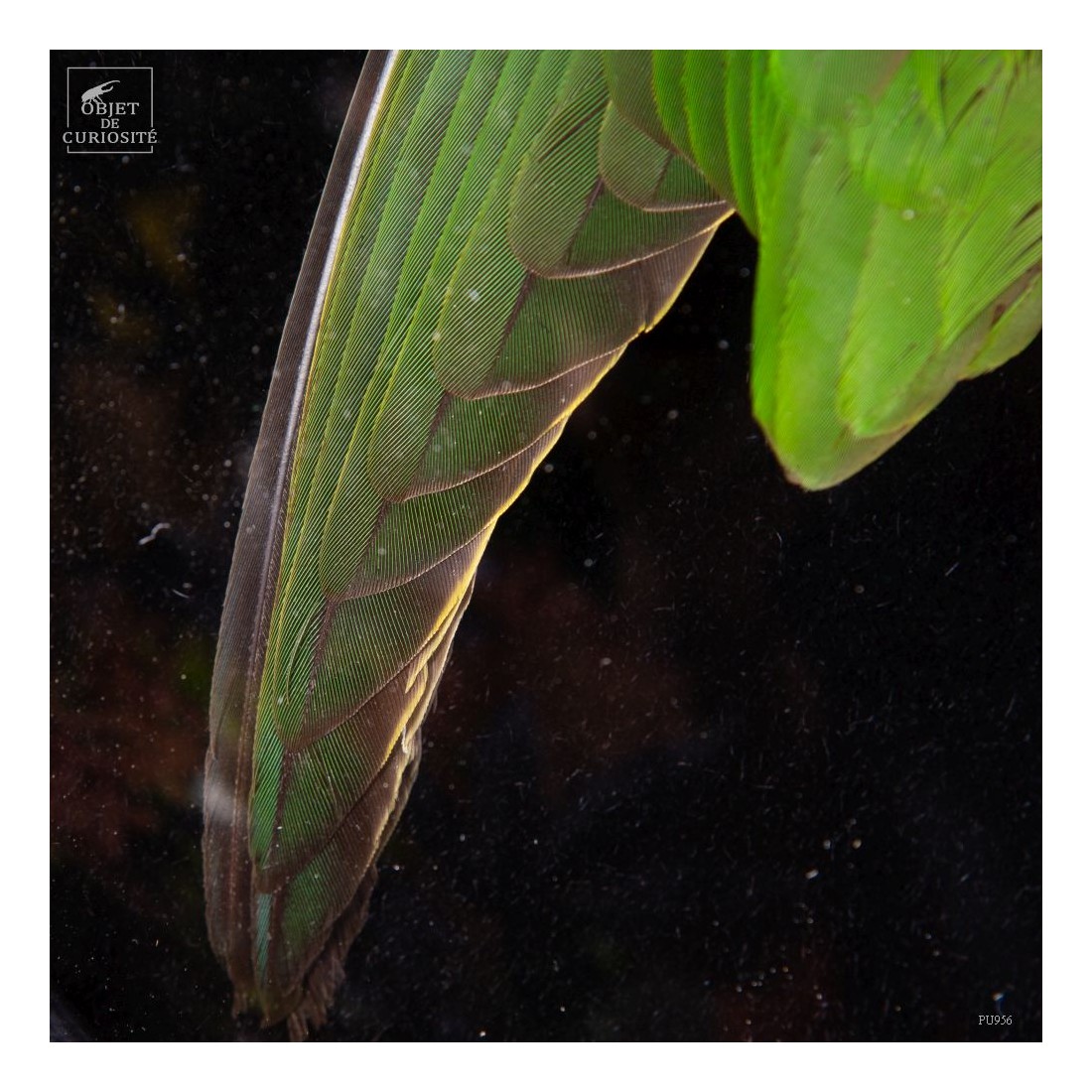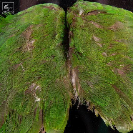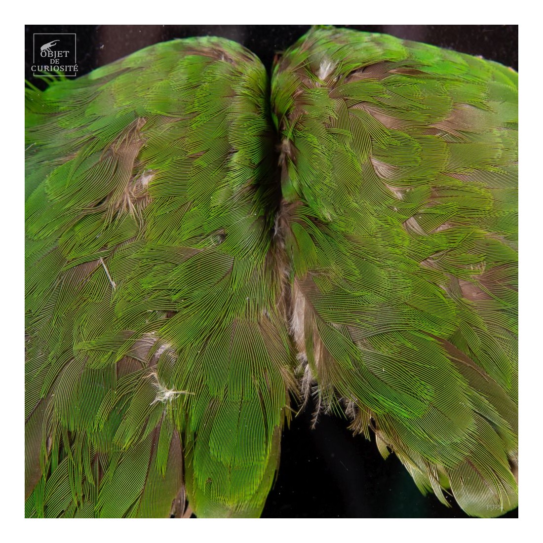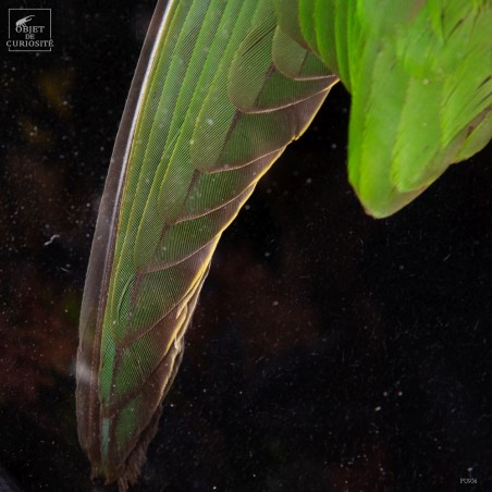 The Peach-faced lovebird do have a pink face, but definitely a strong green body and wings. These bright little birds live as a couple, although it is very difficult to distinguish the male from the female. This ilovebird lived in a wildlife park in Torino, Italy and died in 2012. As we waited a long time before treating it in taxidermy, only the wings could be preserved. the very essence of this member of the parrot family. No cites.