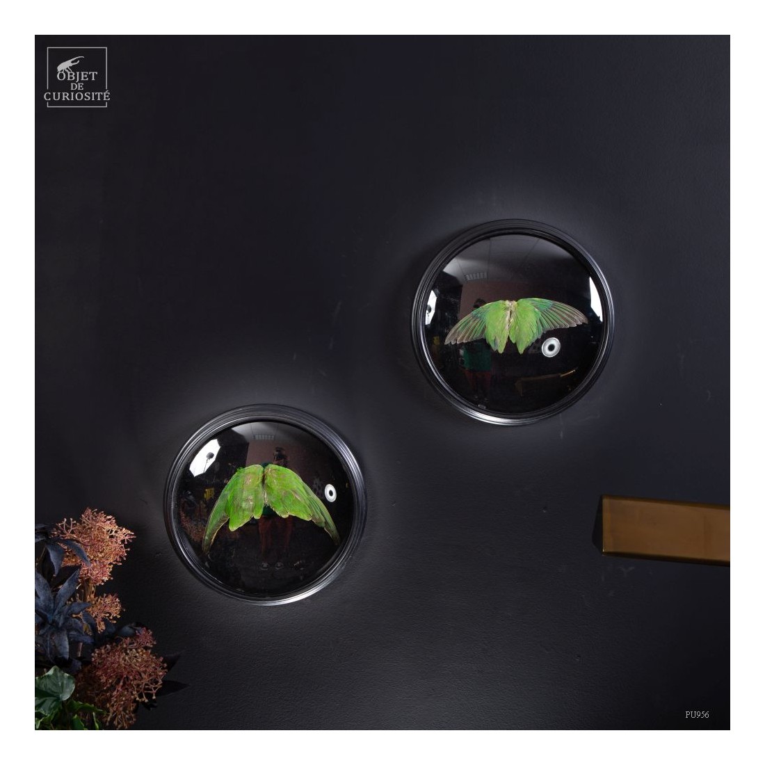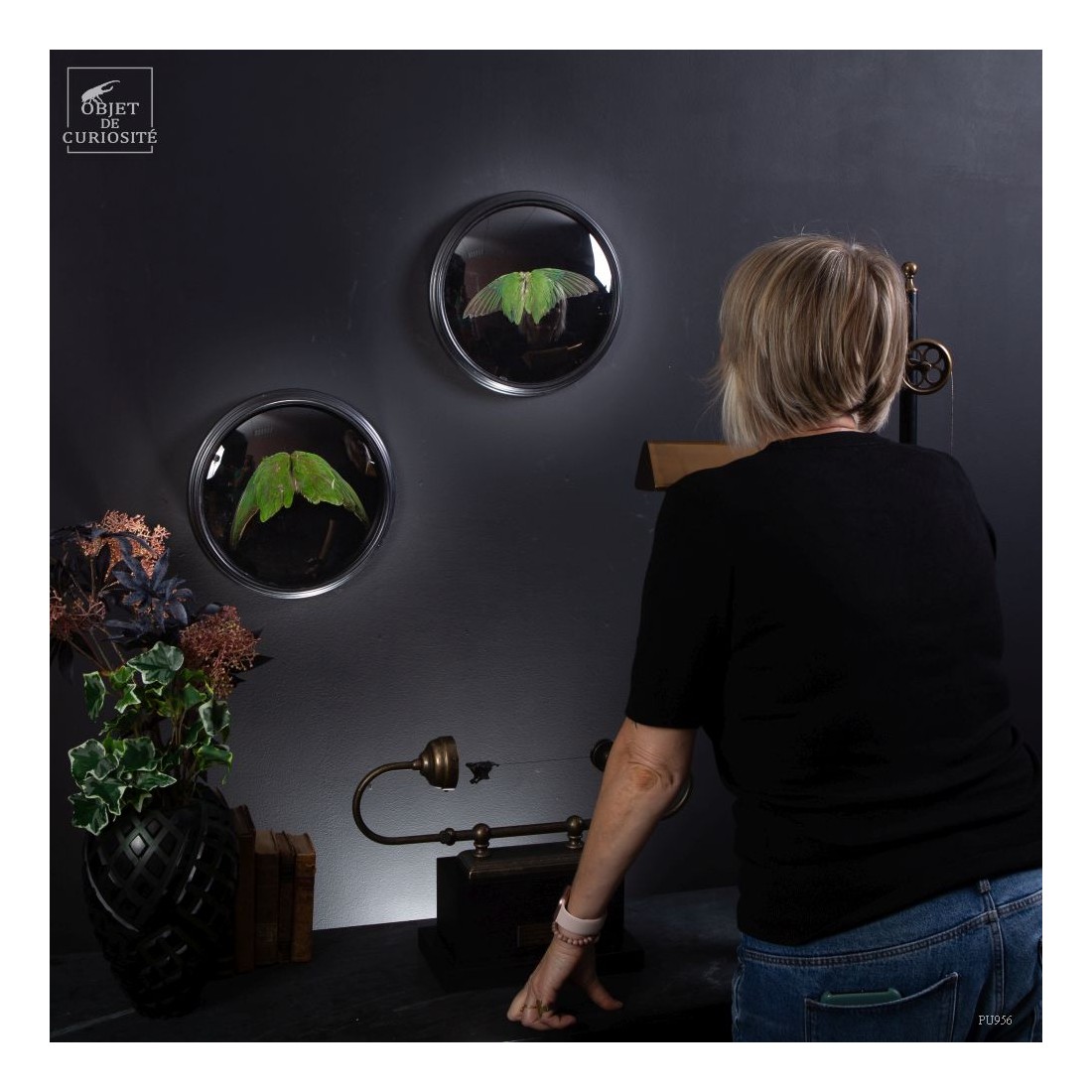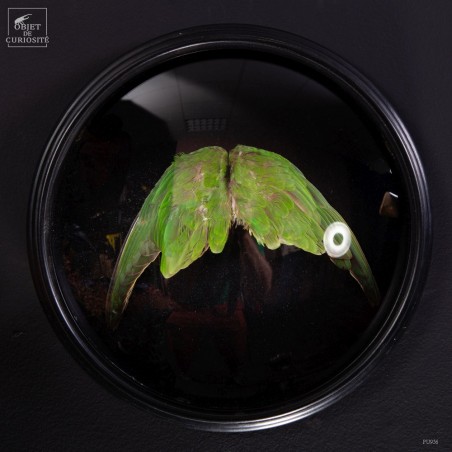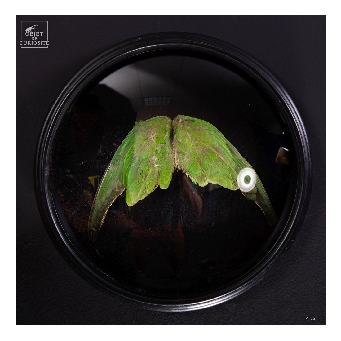 The Peach-faced lovebird do have a pink face, but definitely a strong green body and wings. These bright little birds live as a couple, although it is very difficult to distinguish the male from the female. This ilovebird lived in a wildlife park in Torino, Italy and died in 2012. As we waited a long time before treating it in taxidermy, only the wings could be preserved. the very essence of this member of the parrot family. No cites.