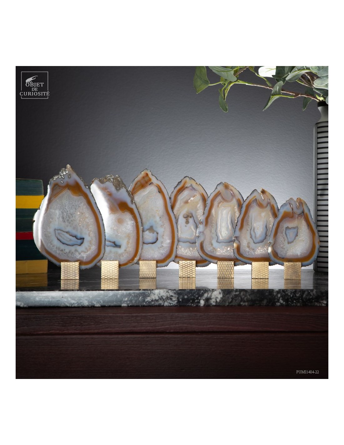 This strange sculpture is in fact an agate geode cutted in slices. Those thin slices are even more beautiful when some light comes through, like on the pictures 6 to 9. All together, they show the original patern as it was inside this very nice Brazilian stone.