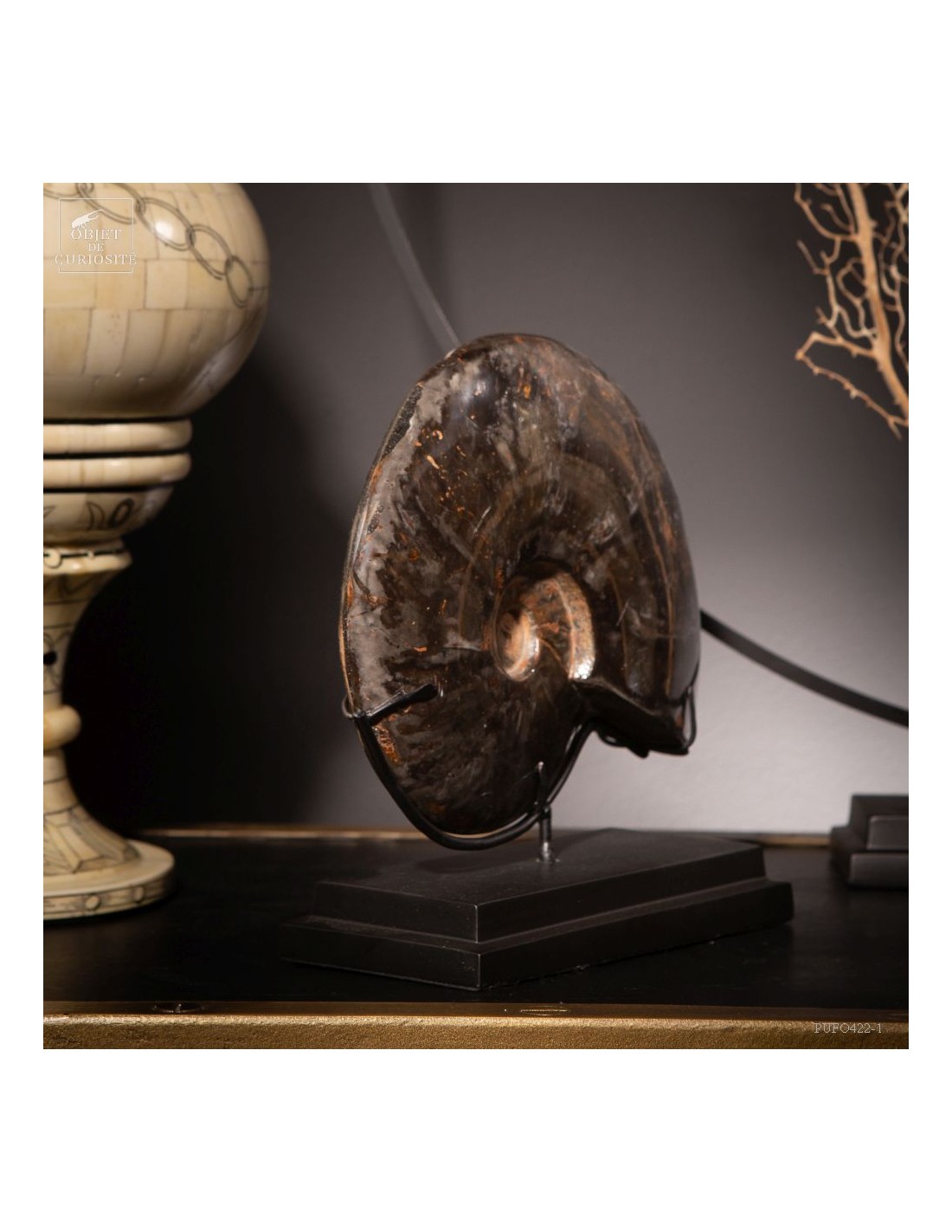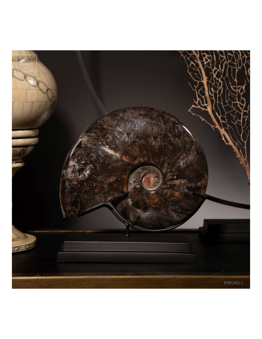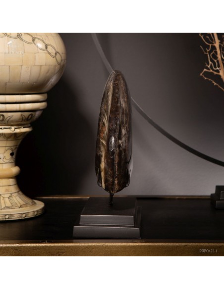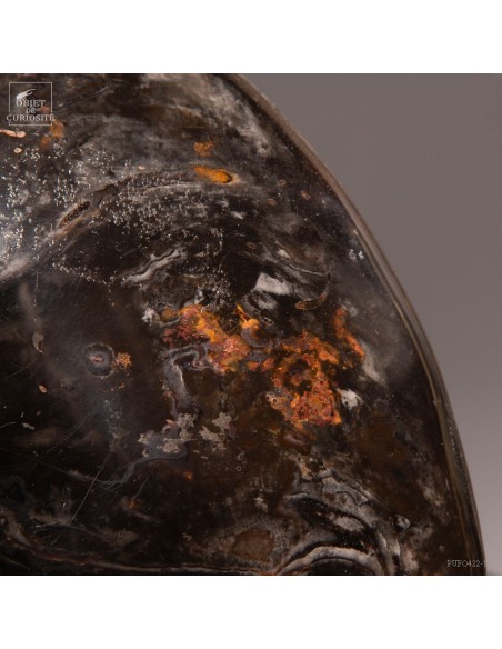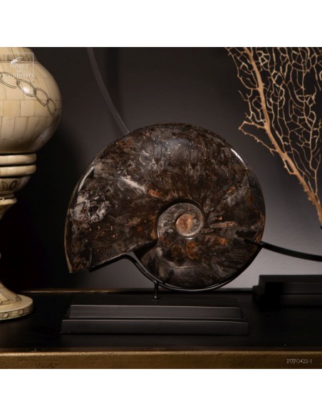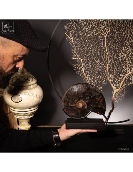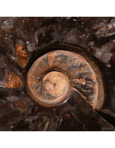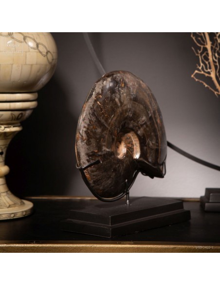 A rarity: the shell of this prehistoric shell -a Cleoniceras from Madagascar- has the particularity of being fossilized by replacing its original mother-of-pearl with a very elegant black mineral. Middle Albian, about 100 Million years.