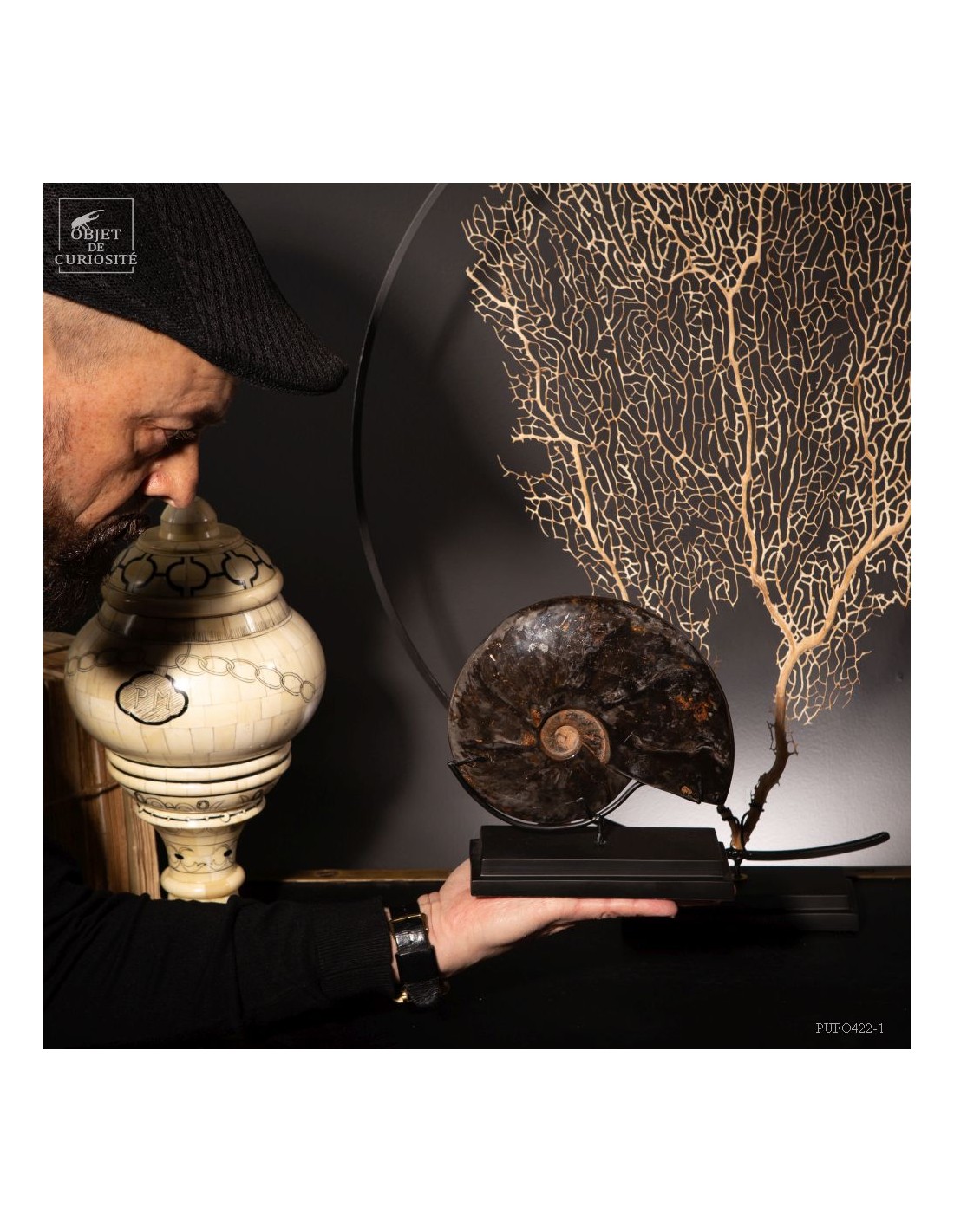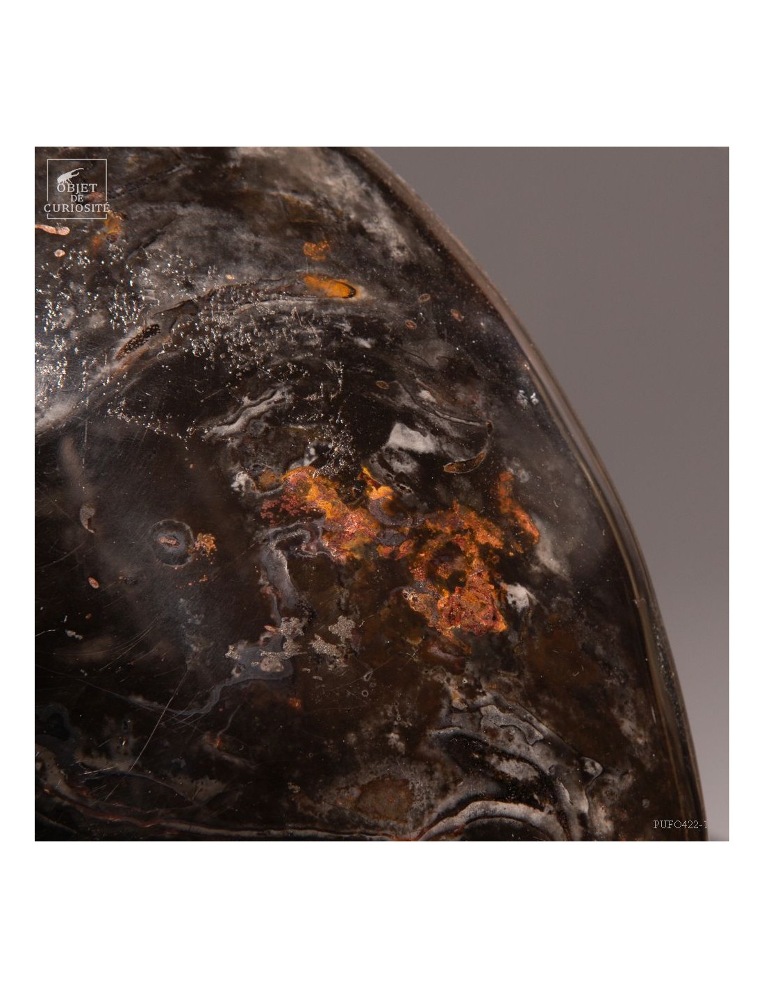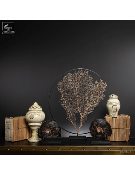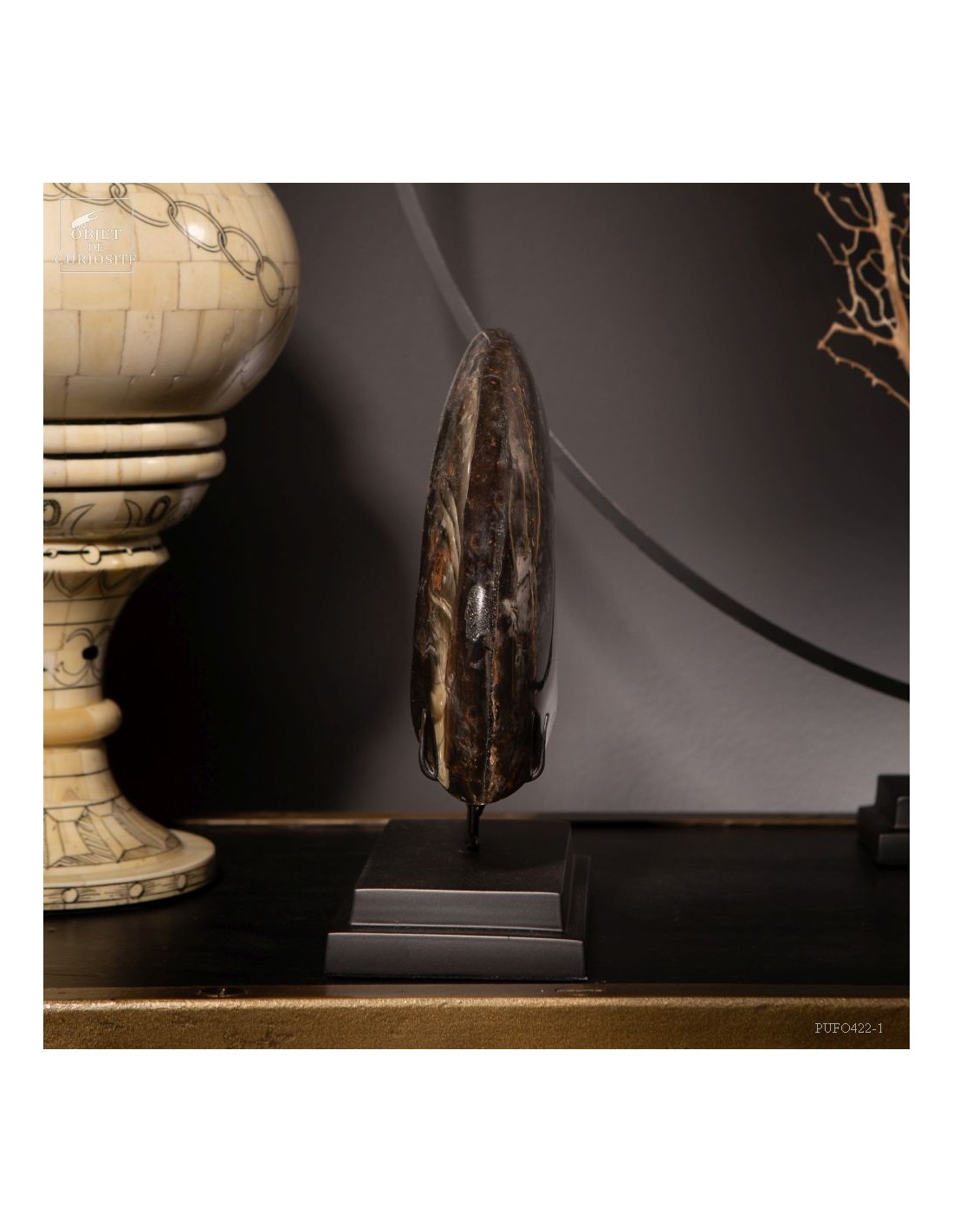 A rarity: the shell of this prehistoric shell -a Cleoniceras from Madagascar- has the particularity of being fossilized by replacing its original mother-of-pearl with a very elegant black mineral. Middle Albian, about 100 Million years.