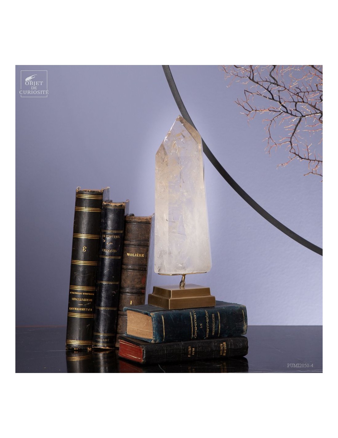 This crystal tip of 1,1Kg comes from Madagascar and is displayed on a brass base. It’s a very transparent crystal, but it seems to contain veils of mystery... In fact it is the result of an imperfect mixture of the mineral solution that make it up (silicon dioxide+selenite, antimonite...) during its growth several million years ago. An imperfect mix, but which constitutes the "garden" of this crystal: its unique signature.