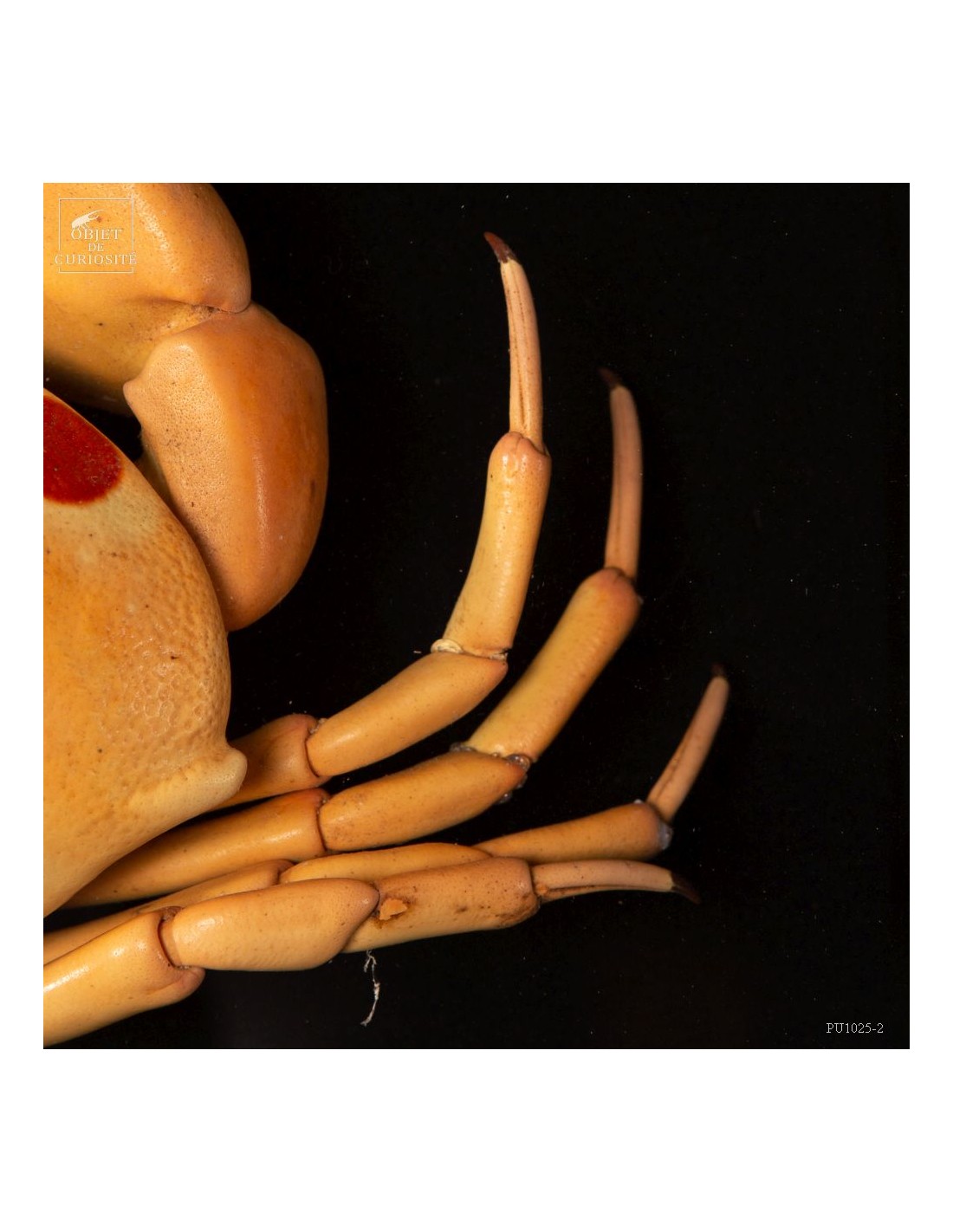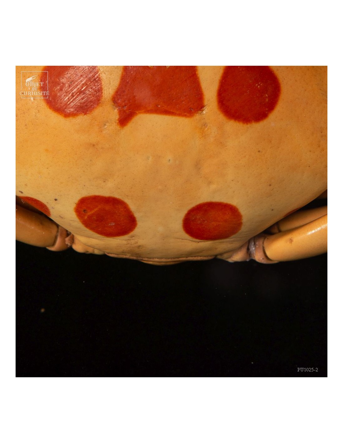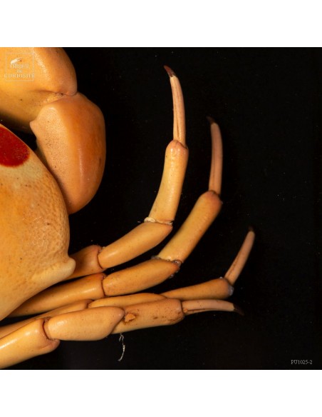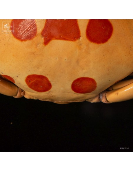 This doted crab is also called slow crab. In fact it is mostly active at night, and it feeds on corals and sea snails. The Carpilius maculatus can be seen in less than 10 meters of depth in the tropical zone of the Indian Ocean: from French Polynesia to Hawaii. Its flesh is known to be toxic to man, but it seems that some Polynesians eat it from time to time. It rests here in a black wall box.